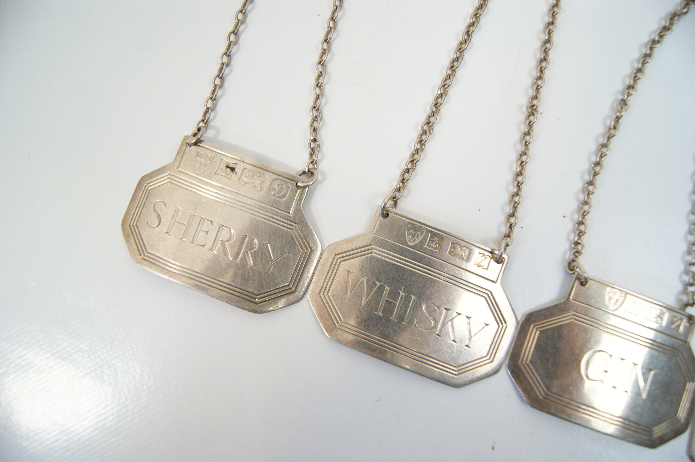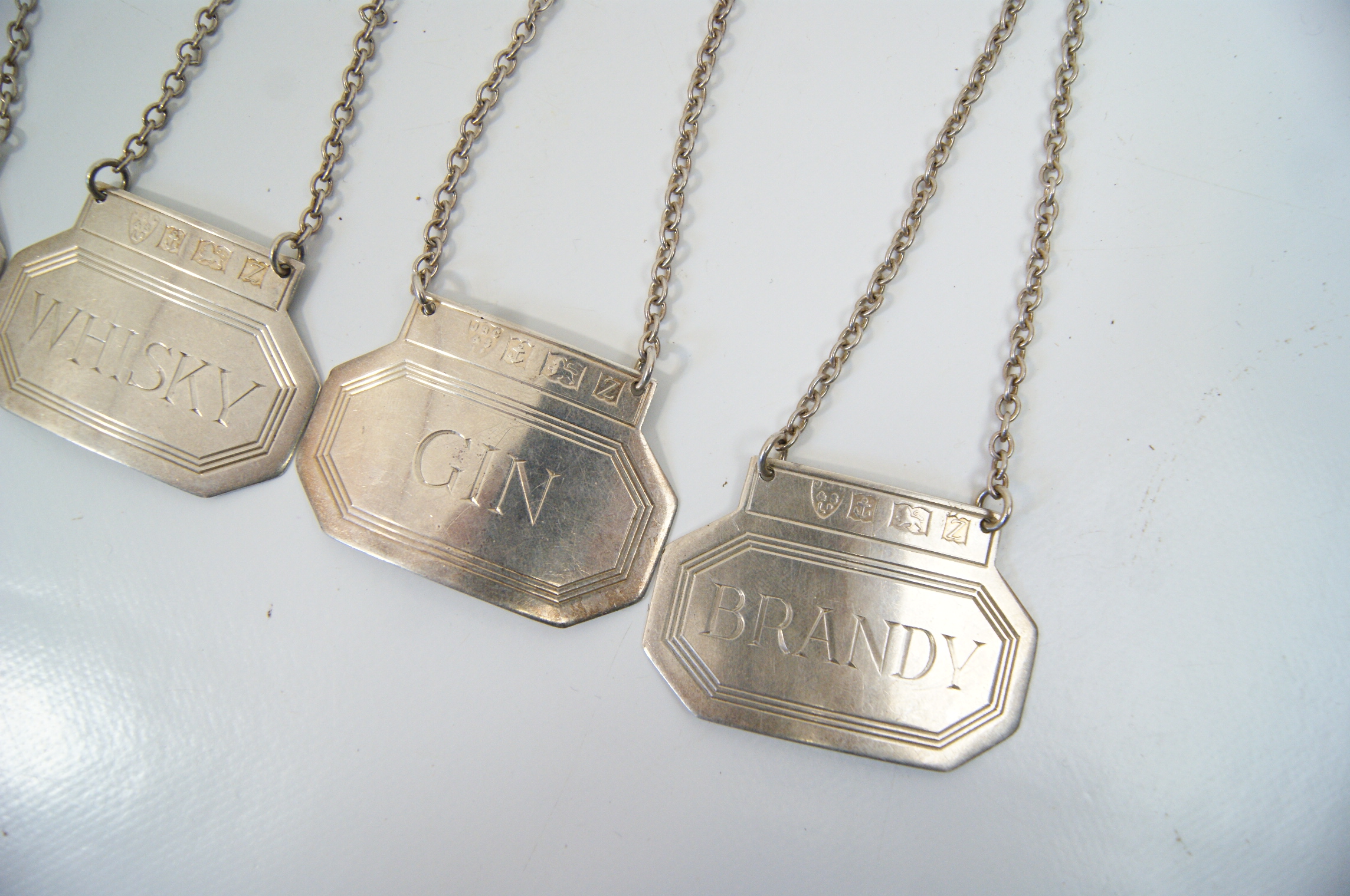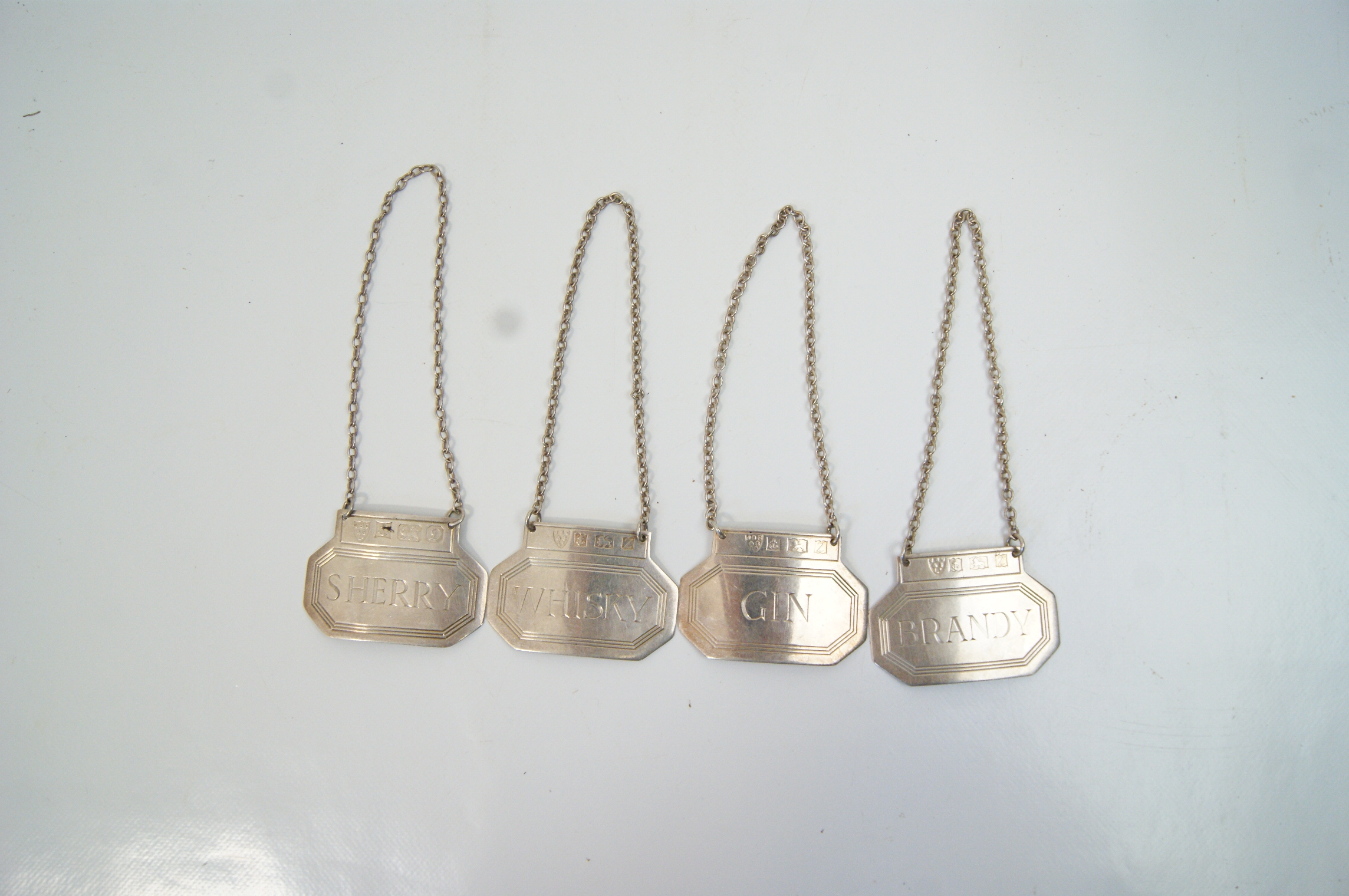 A set of four sterling silver decanter labels by J.B. Chatterley and Sons Ltd. The set comprises labels engraved for Sherry, Whisky, Gin, and Brandy. Each label is of rectangular form with canted corners and a double-line reeded border. The titles are engraved in a sans-serif capitalised font. Each label is suspended from a sterling silver curb-link chain. Each piece is struck with a full set of British hallmarks to the front upper edge. The hallmarks include the maker mark JBC over &S within a shield-shaped punch for J.B. Chatterley and Sons Ltd, the anchor for the Birmingham assay office, and the lion passant for .925 sterling silver. The Whisky, Gin, and Brandy labels are marked with the date letter z for 1949. The Sherry label is marked with the date letter g for 1956.