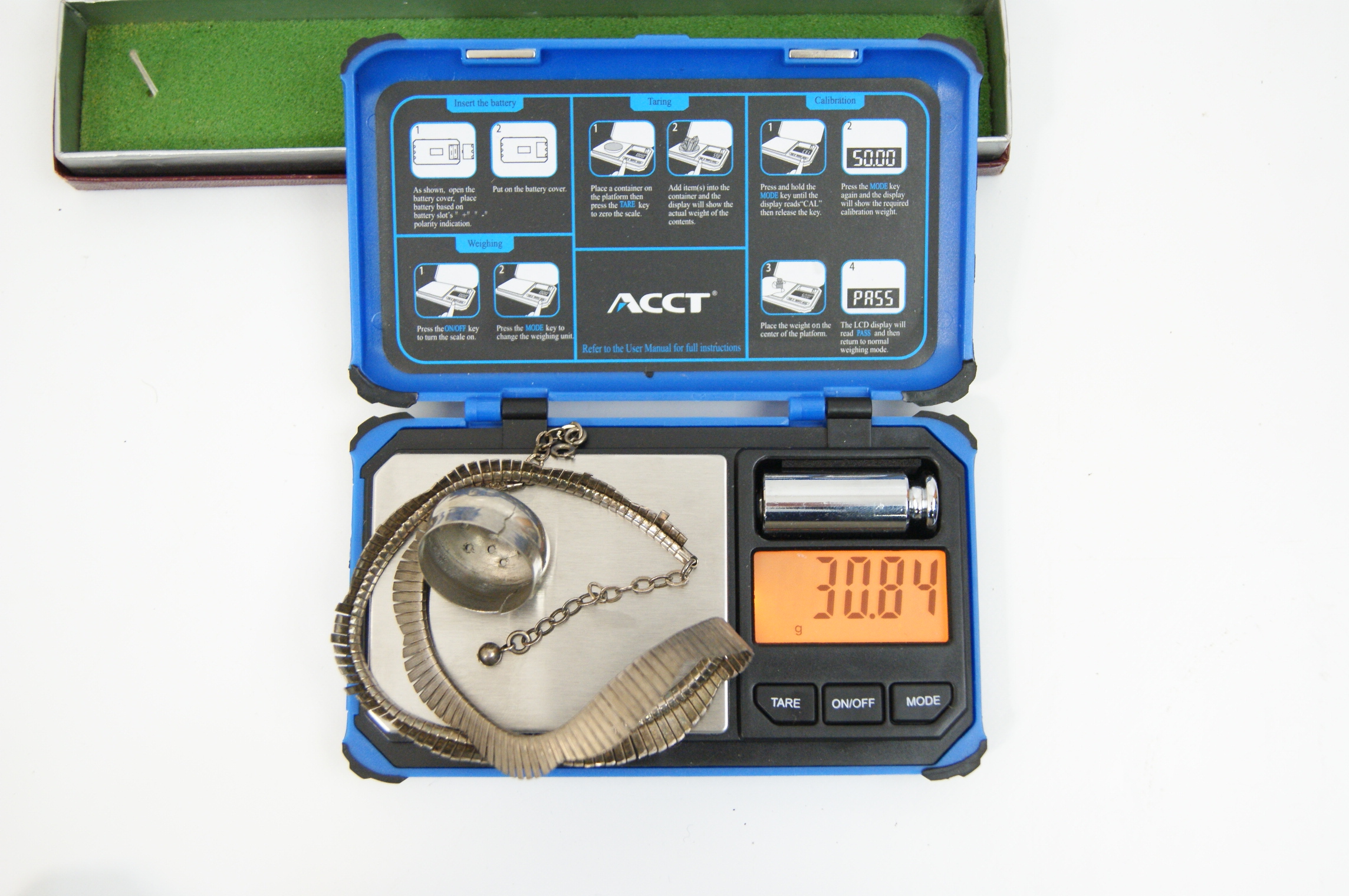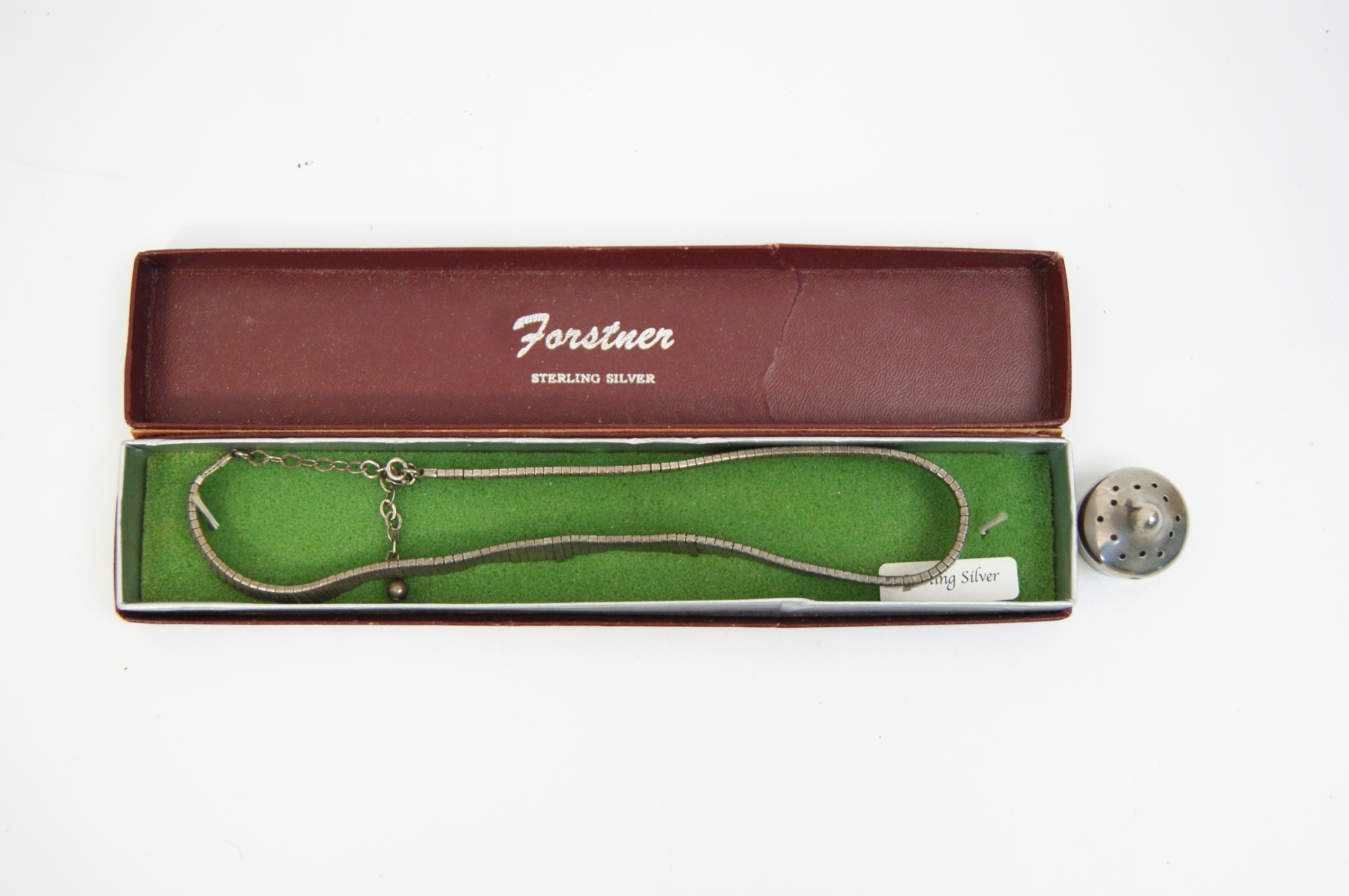 A vintage sterling silver choker necklace by Forstner, featuring a wide, flat, articulated link chain. The design consists of numerous rectangular segments joined to create a flexible band that drapes smoothly. The necklace is equipped with an extender chain featuring a spring ring clasp and is finished with a small polished silver bead finial. The lot includes a small, perforated sterling silver domed cap. The items are housed in an original Forstner presentation box with a maroon exterior and green felt-lined interior. The interior lid is marked Forstner STERLING SILVER.