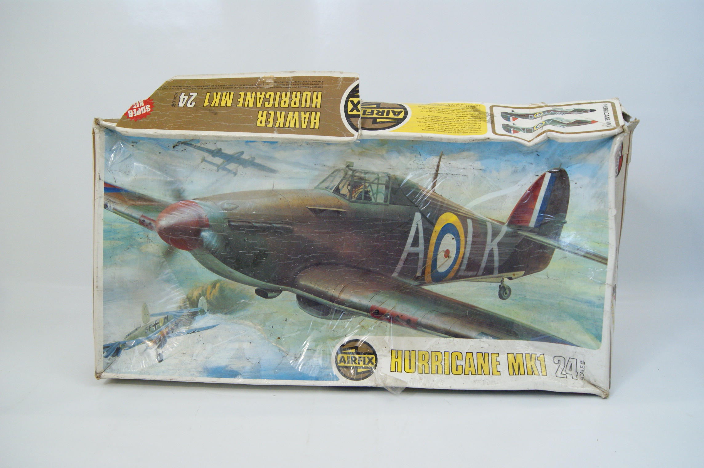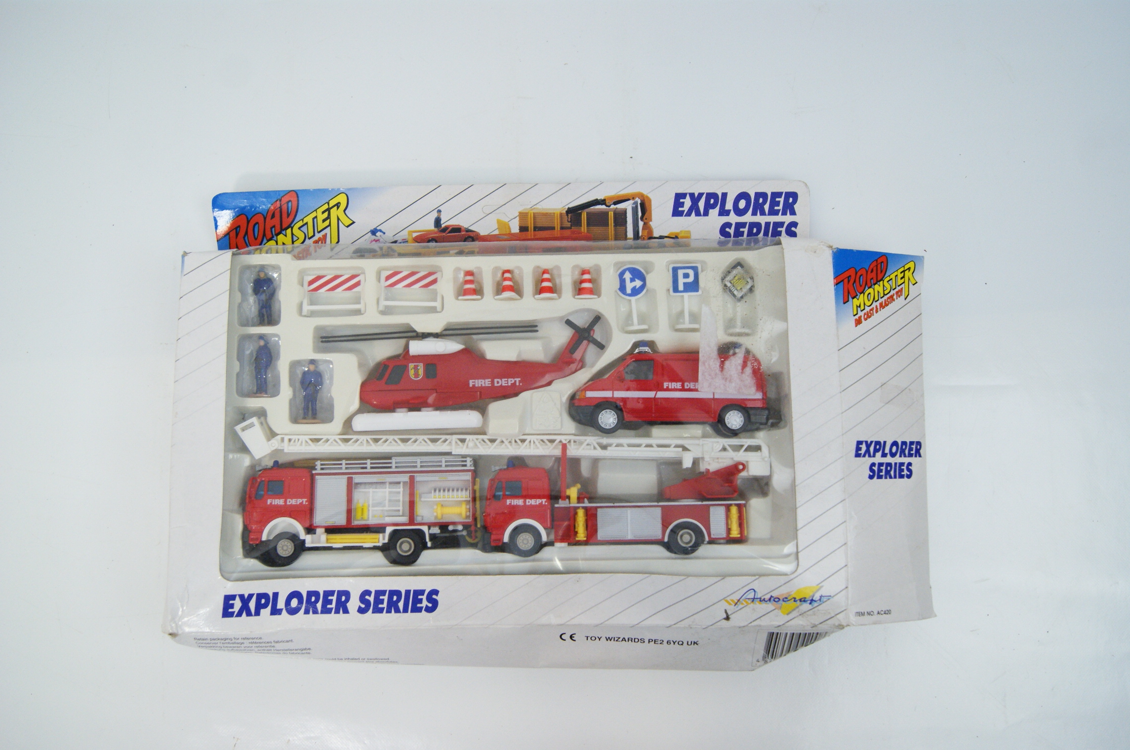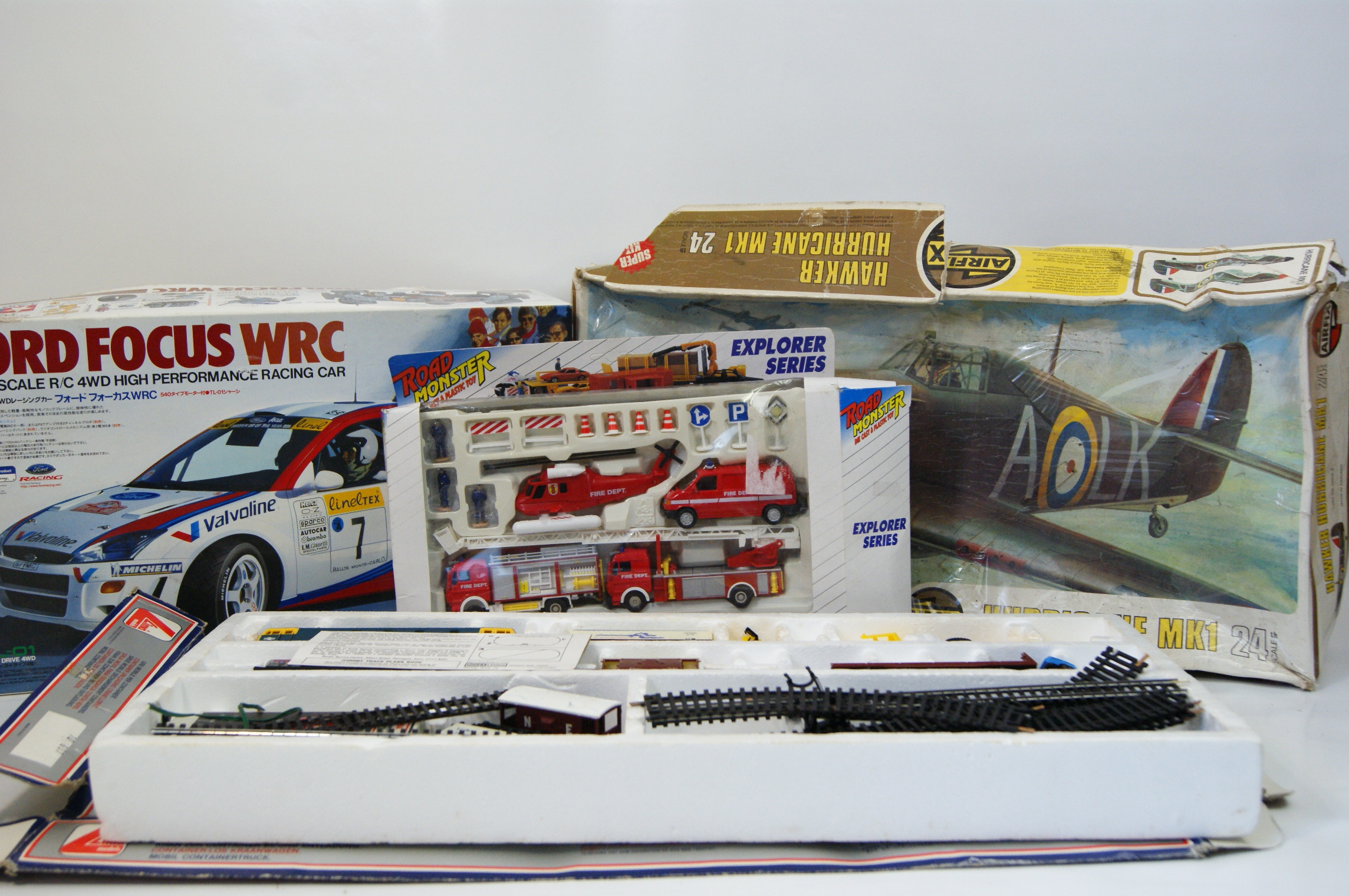 A collection of model kits and toy vehicle sets. The group includes a Tamiya (Japan) 1/10 scale radio-controlled Ford Focus WRC racing car kit, featuring the Monte-Carlo Rally livery with Valvoline and Michelin sponsorship, number 7, on a TL-01 shaft drive 4WD chassis. Also included is a Lima (Italy) Action Accessory model railway set comprising a blue diesel locomotive, an Esso tanker wagon, a flatbed wagon with a PC container, a brown van, a yellow mobile container crane, a blue truck cab, and sections of black plastic track. The collection further contains an Airfix (United Kingdom) 1/24 scale Hawker Hurricane MkI Super Kit, aircraft code A-OLK. Completing the lot is a Road Monster Explorer Series Fire Dept. set by Toy Wizards/Autocraft, featuring an articulated fire engine with an extending ladder, a red helicopter, a red van, three figures, and various road accessories. Materials used across the items include plastic, die-cast metal, and rubber.
