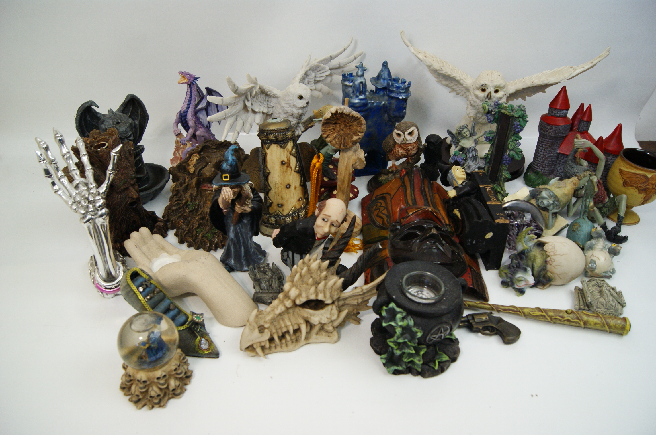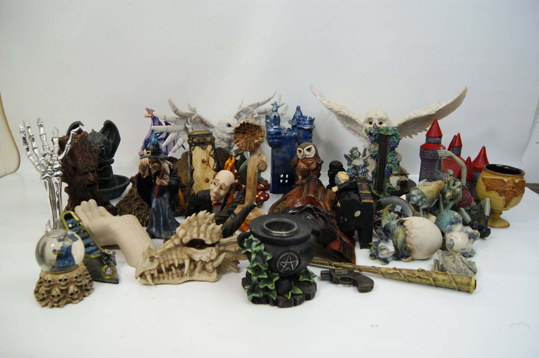 A Collection of Fantasy and Gothic Themed Decorative Figurines and Objects
