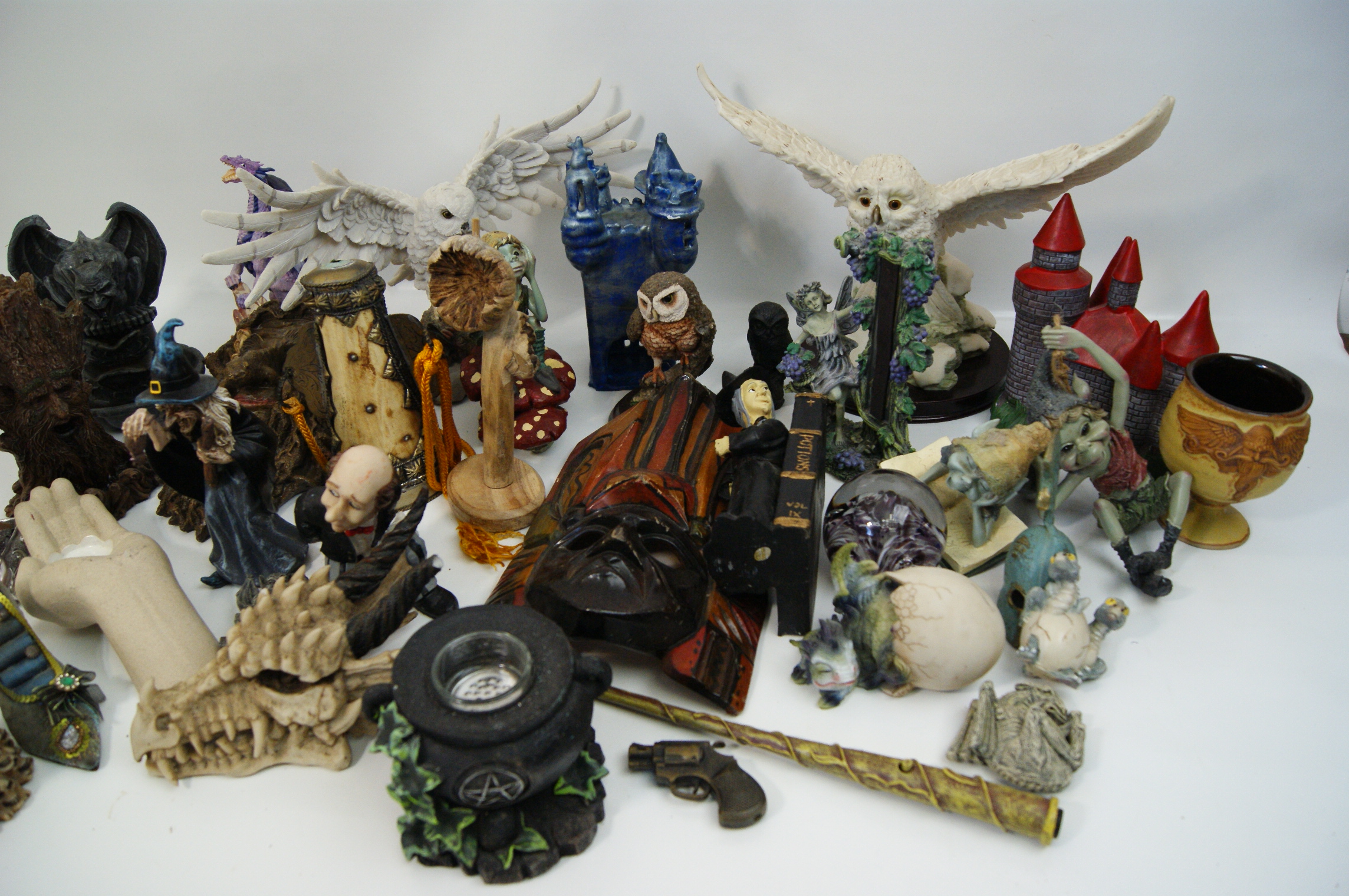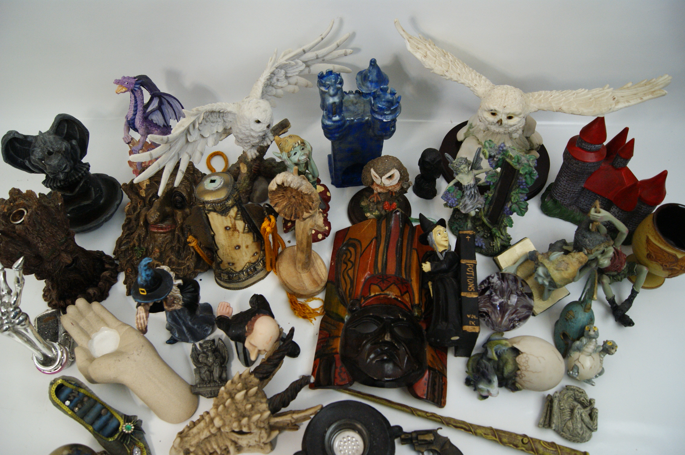 An assortment of contemporary fantasy and gothic style decorative items, primarily constructed from painted cold-cast resin with some glazed ceramic elements. The collection features a variety of mythical and macabre subjects including two large snowy owls, a purple dragon perched on a rock, and several smaller mythical creatures such as trolls, goblins, and hatching dragons. Figures include two witches, one depicted with a broomstick and another standing beside a book titled Potions Vol IX, alongside a male figure in formal attire. Gothic elements comprise a large resin dragon skull, a silver-toned skeletal hand, a cauldron-form candle holder with an incised pentagram and ivy decoration, and a wizard-themed snow globe on a skull-motif base. Architectural models include a blue-glazed ceramic castle and a grey castle with red-painted roofs. Additional items include a decorative chalice with owl motifs, a textured wand, a tribal-style mask, and a miniature replica pistol.