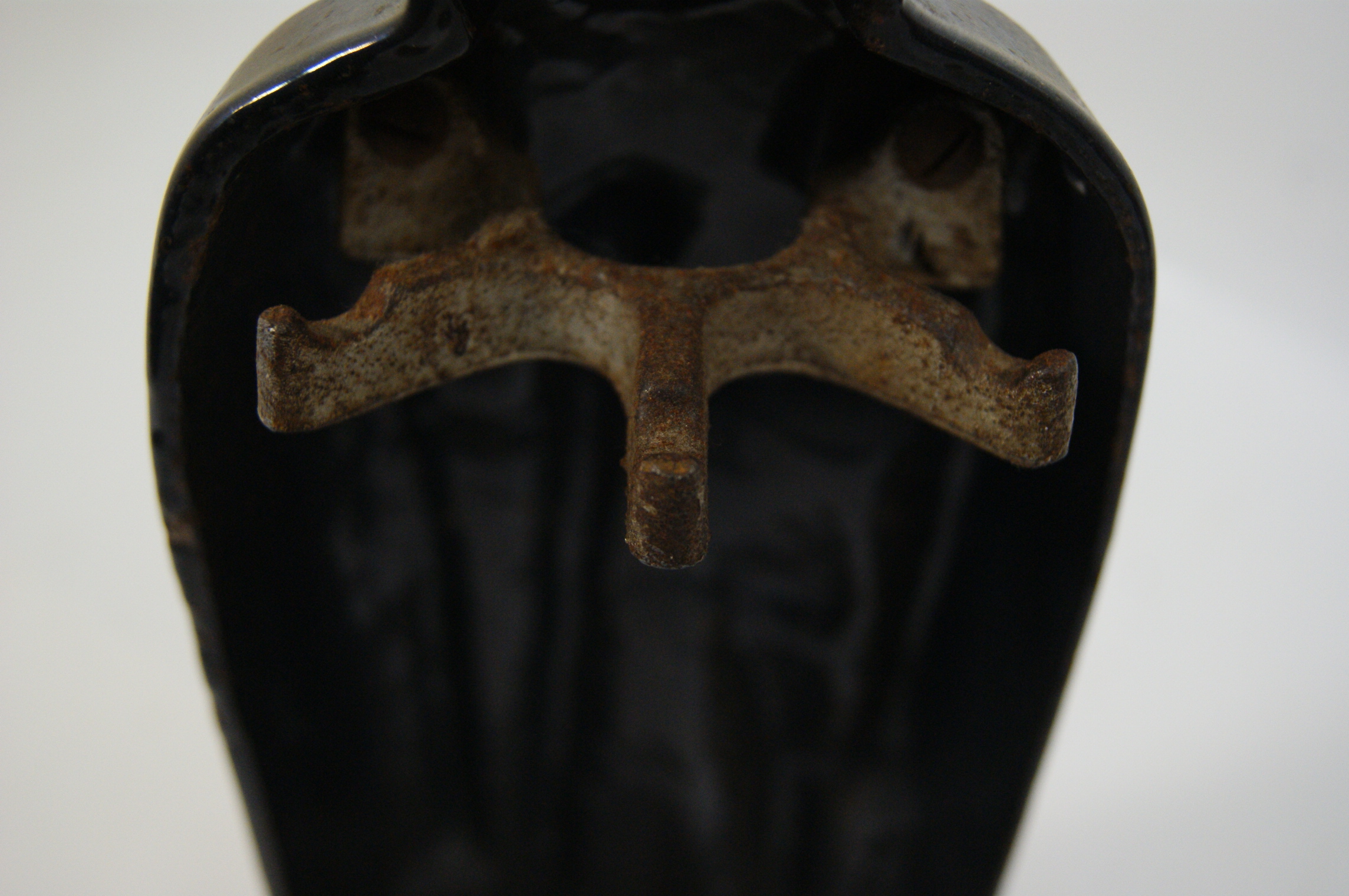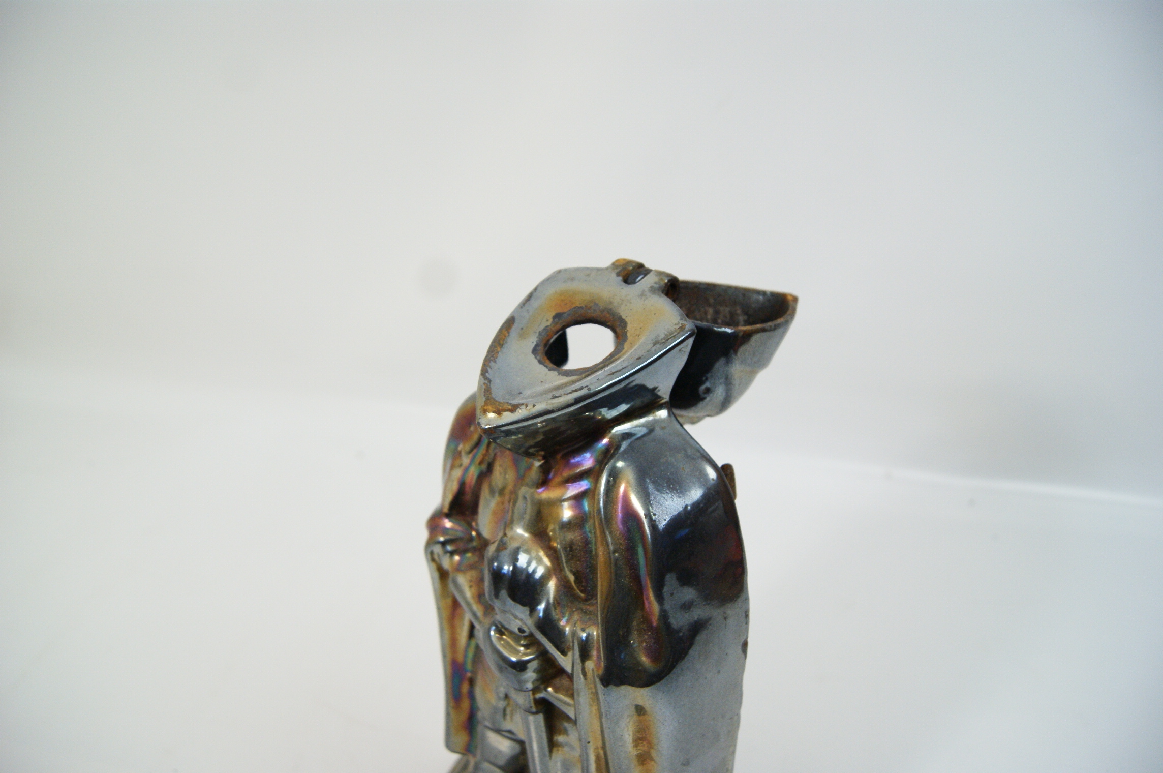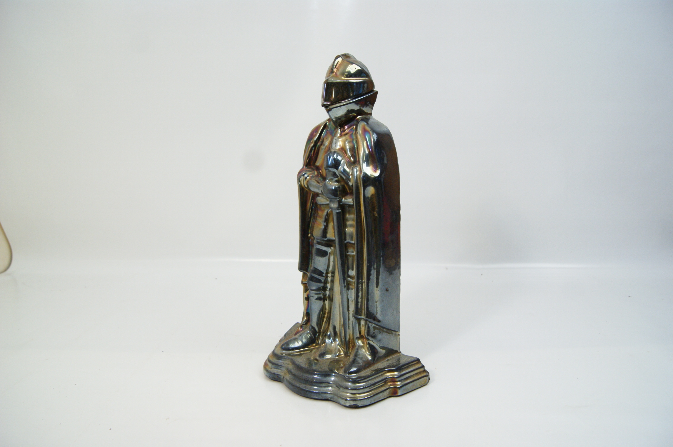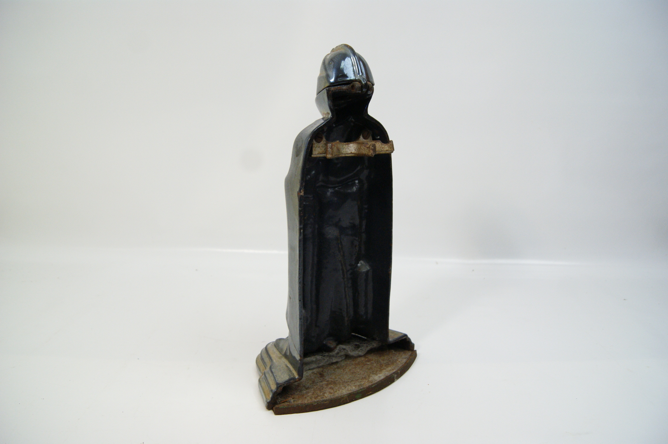 A decorative cast metal figure of a knight in full plate armour, designed as a stand for a fire companion set. The figure is depicted in a standing pose, leaning upon a broadsword and wearing a long cloak. The main body is constructed from a non-ferrous metal alloy featuring a polished iridescent finish. The reverse of the figure is open-backed, containing a cast iron bracket with three integral hooks for the suspension of fireplace tools. The figure is mounted on a semi-circular cast iron base plate. The helmet features a hinged top section which opens to reveal a circular aperture, likely intended for a table lighter or match holder insert. No maker’s marks or signatures are present.