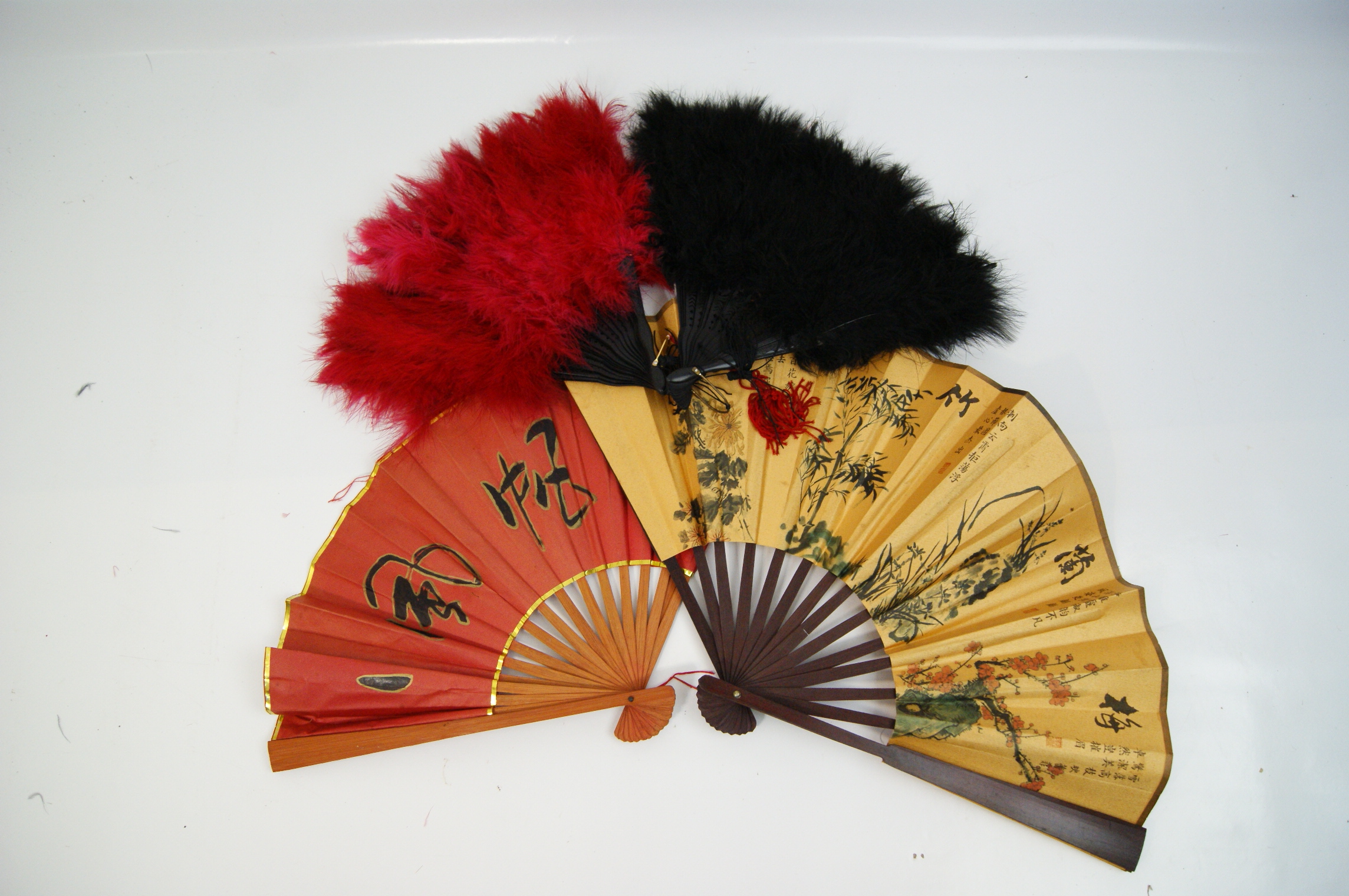 A collection of decorative hand fans of Chinese origin, likely dating to the mid to late 20th century. The group includes folding paper fans and feather fans. The first folding fan features a red paper leaf with a gilt-coloured border, decorated with two large hand-painted black calligraphic characters, 風 (wind) and 帆 (sail). It is mounted on light-toned wooden sticks. The second folding fan has a gold-toned paper leaf decorated with traditional ink and wash paintings of the Four Gentlemen (bamboo, plum blossom, orchid, and chrysanthemum). This fan includes multiple columns of calligraphic inscriptions and several red square seal marks, mounted on dark-stained wooden sticks. The collection also includes a fixed-mount fan with a semicircular arrangement of red feathers on dark sticks, and a folding fan with layered black feathers on decoratively pierced black sticks, finished with a red cord tassel.
