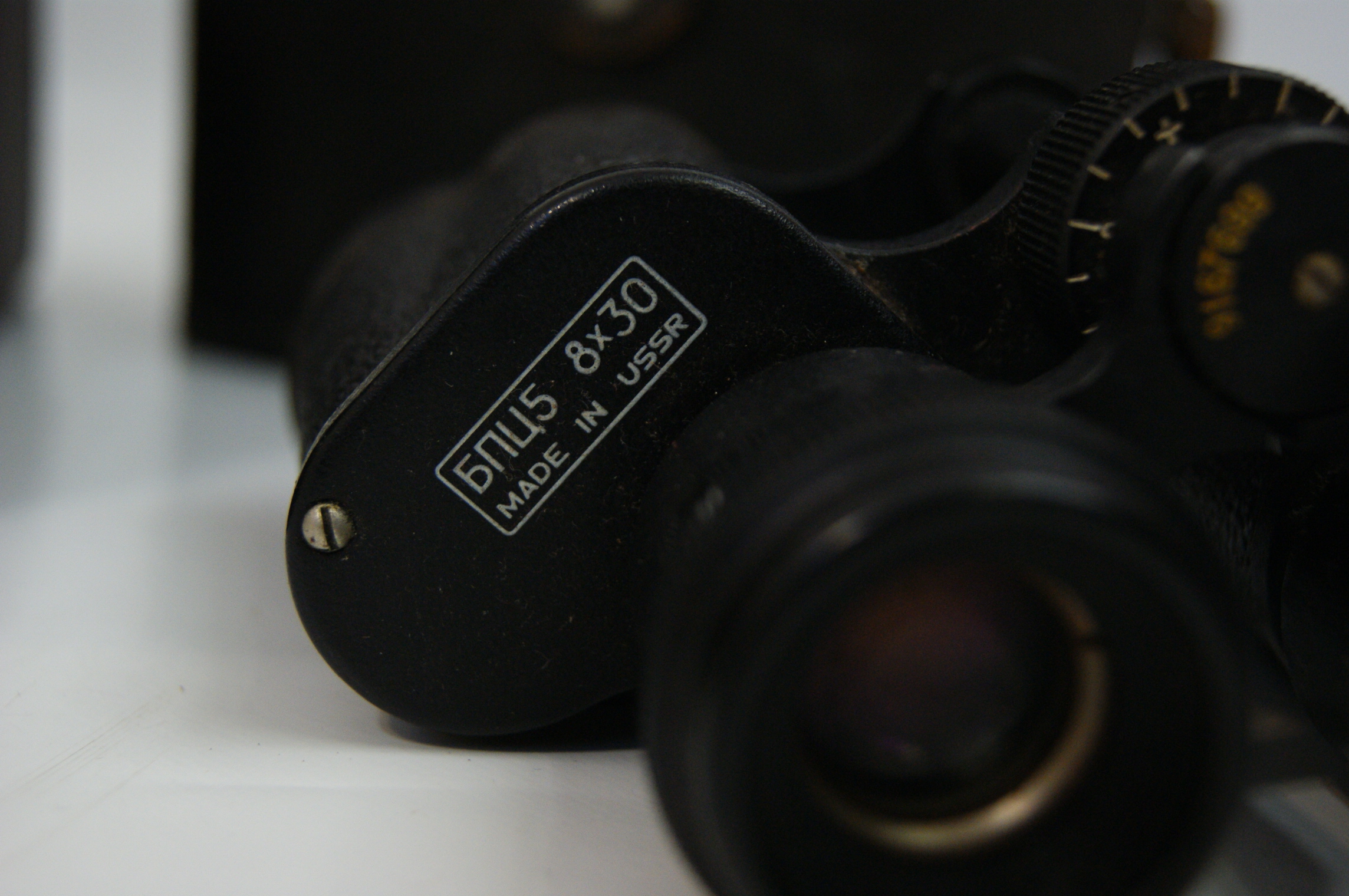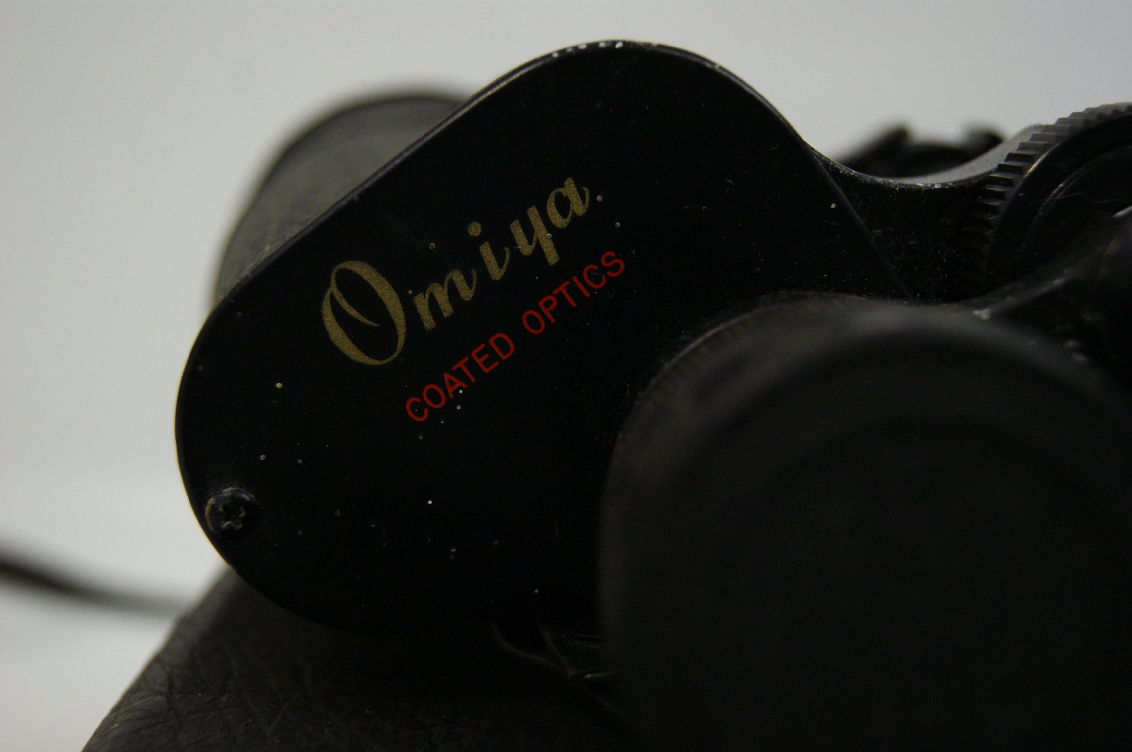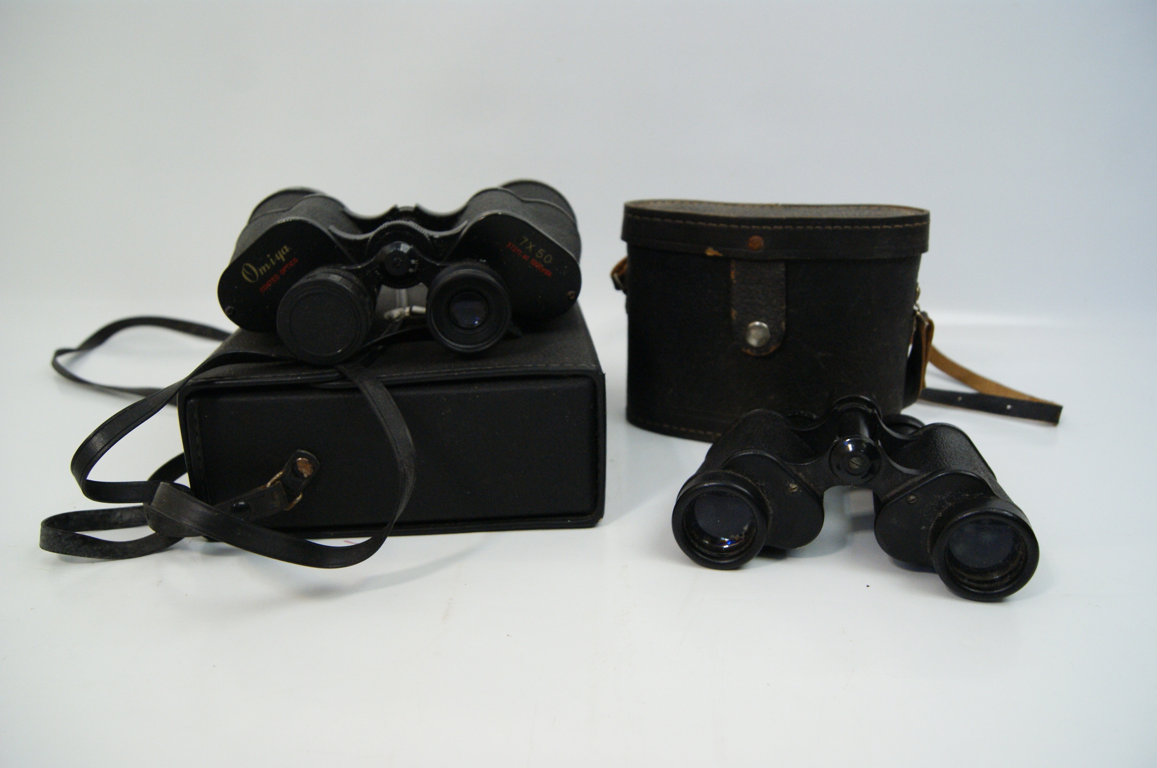 Two pairs of vintage prism binoculars, each accompanied by a respective carrying case. The first instrument is an Omiya 7×50 model of Porro prism design with a black textured body and metal components. The left shoulder is marked with the maker name Omiya in gold script and COATED OPTICS in red. The right shoulder is marked 7 X 50 in gold with field of view specifications 372ft. at 1000yds in red. The unit is fitted with a central focusing wheel and a dioptre adjustment on the right eyepiece. It includes a black synthetic neck strap and a black rectangular hard-shell carrying case. The second instrument is a Soviet BPC5 (БПЦ5) 8×30 compact Porro prism model. The left shoulder is marked within a white rectangular border with Cyrillic characters БПЦ5 8×30 and MADE IN USSR. The right adjustment dial is marked with the serial number 9167699. The construction features a black textured finish, a central focusing wheel with a graduated scale, and a right-eye dioptre adjustment. It is complete with a black neck strap and a dark brown leatherette semi-oval carrying case with a shoulder strap.