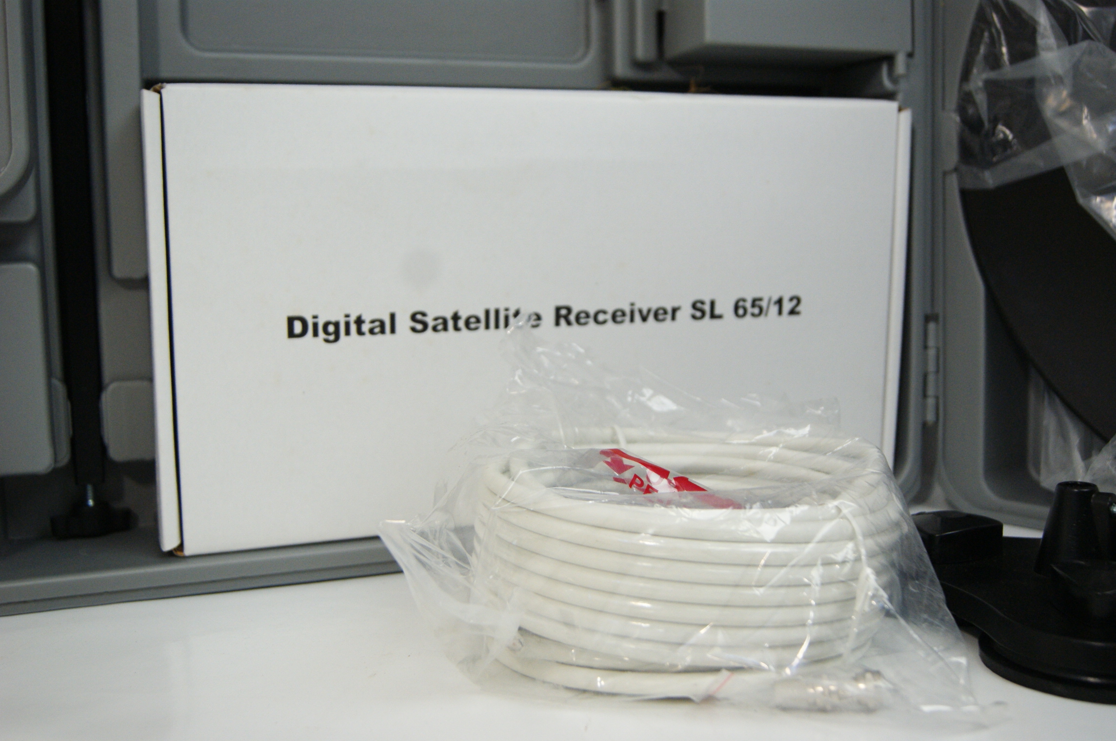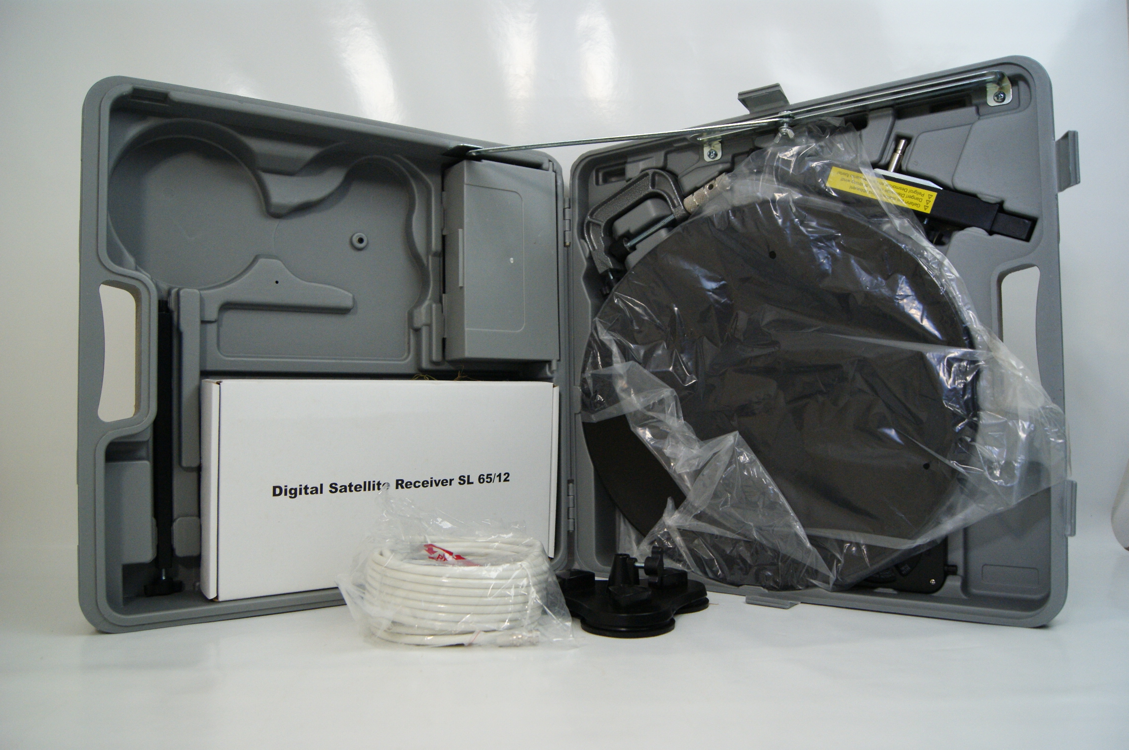 A portable digital satellite kit housed in a grey moulded plastic carry case. The kit includes a boxed digital satellite receiver with the printed text Digital Satellite Receiver SL 65/12, a black circular satellite dish partially wrapped in protective plastic, and a coil of white coaxial cable in plastic packaging. Accompanying accessories include a suction mount base, a C-clamp, and various mounting hardware components. This mobile system is attributed to Silvercrest and is designed for camping and caravan use, typically supporting 12V and 220V power inputs. The components are housed in custom-fit compartments within the protective case.