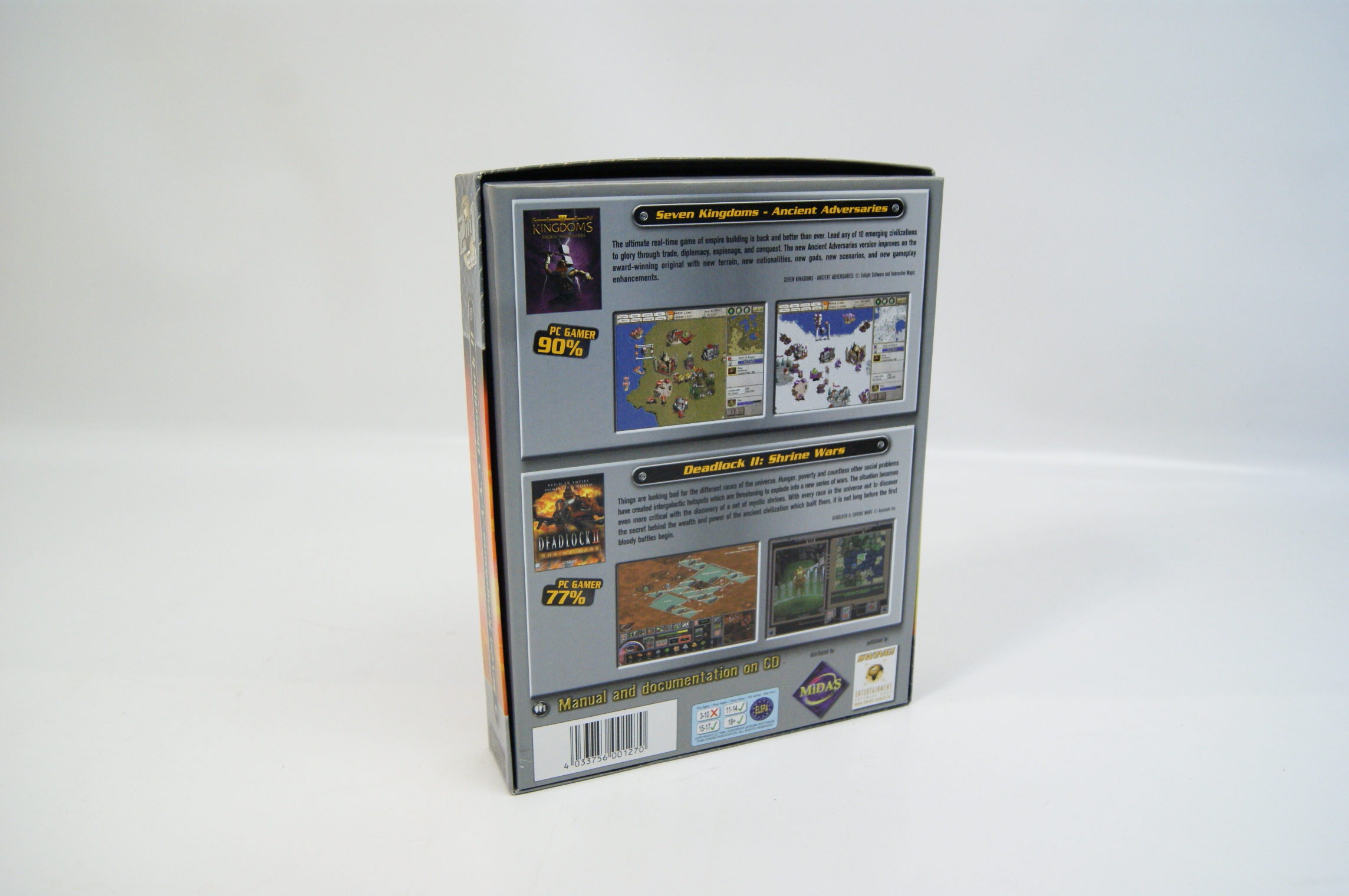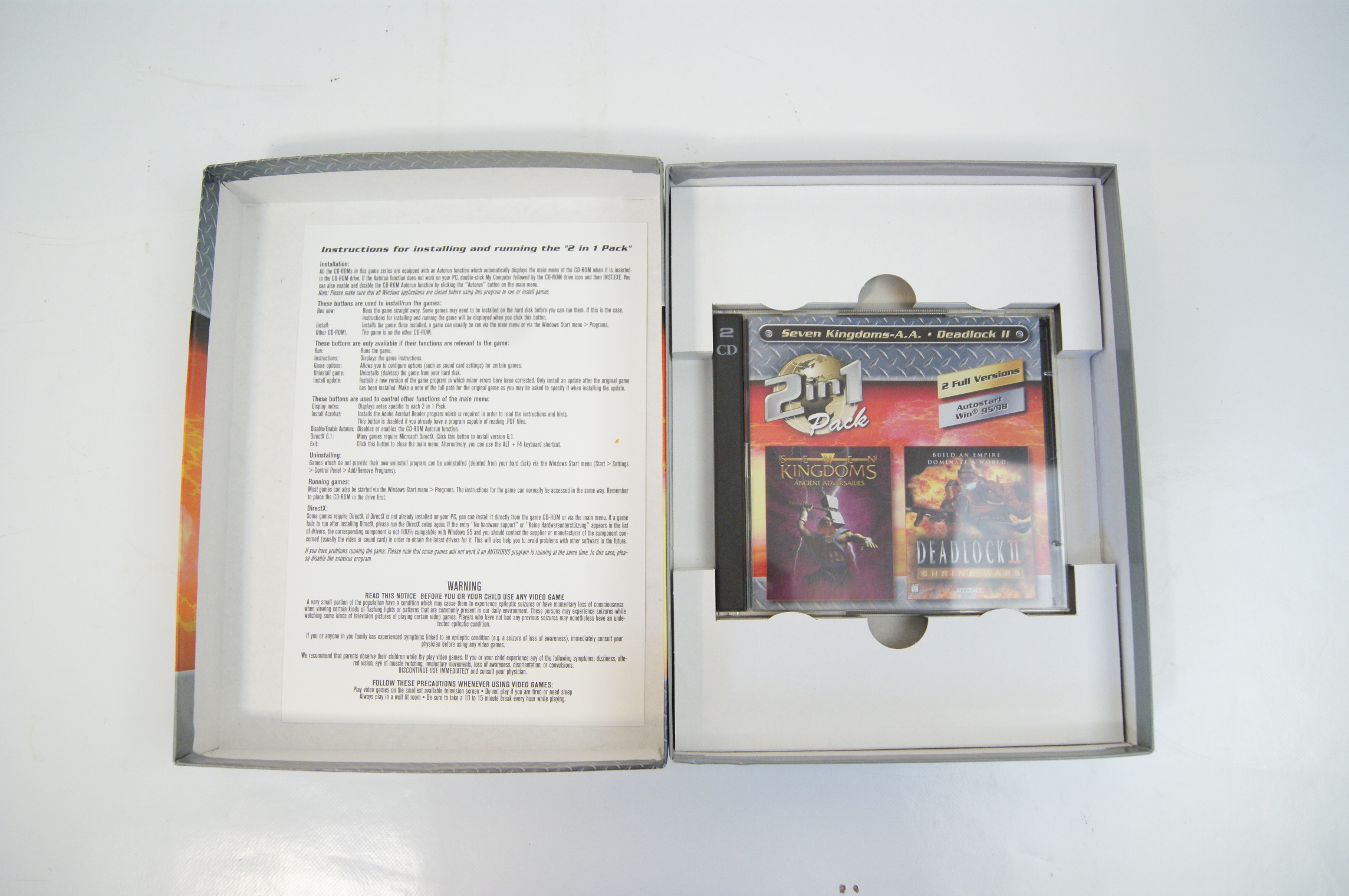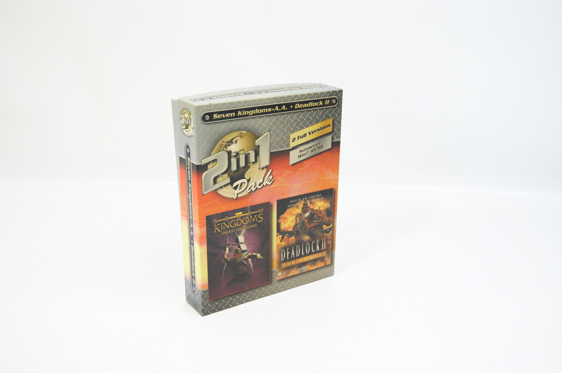 A big box PC game compilation titled 2in1 Pack, published by Swing! Entertainment and distributed by Midas Interactive Entertainment. This set features two full strategy titles: Seven Kingdoms: Ancient Adversaries, developed by Enlight Software, and Deadlock II: Shrine Wars, developed by Accolade. The packaging consists of a large format cardboard outer box with a metallic-effect tread plate design. The interior contains a standard jewel case housing two CD-ROMs for Windows 95/98 platforms. A white cardboard internal spacer is present to secure the contents. Detailed installation and running instructions are printed on a large paper sheet affixed to the underside of the box lid. The reverse of the box displays the Midas and Swing! Entertainment logos, ELSPA age rating symbols, and a barcode numbered 4 033756 001270.