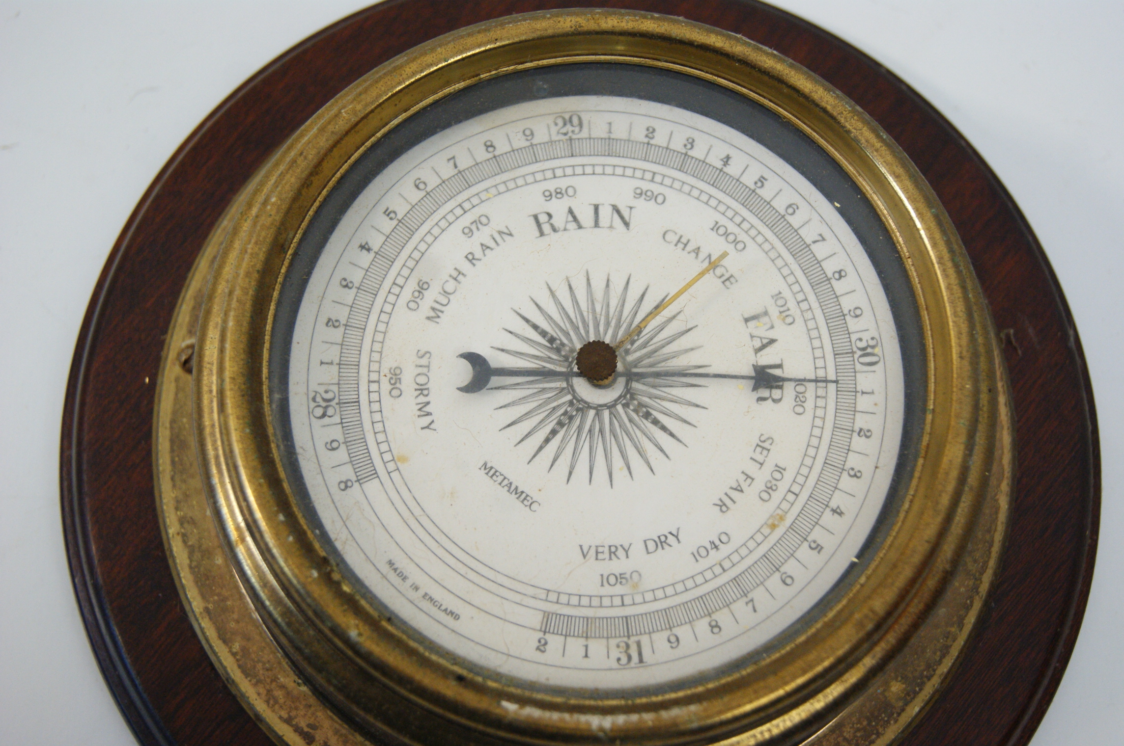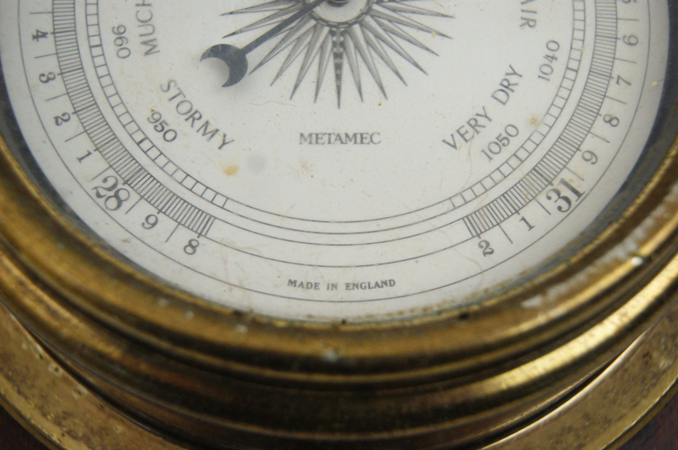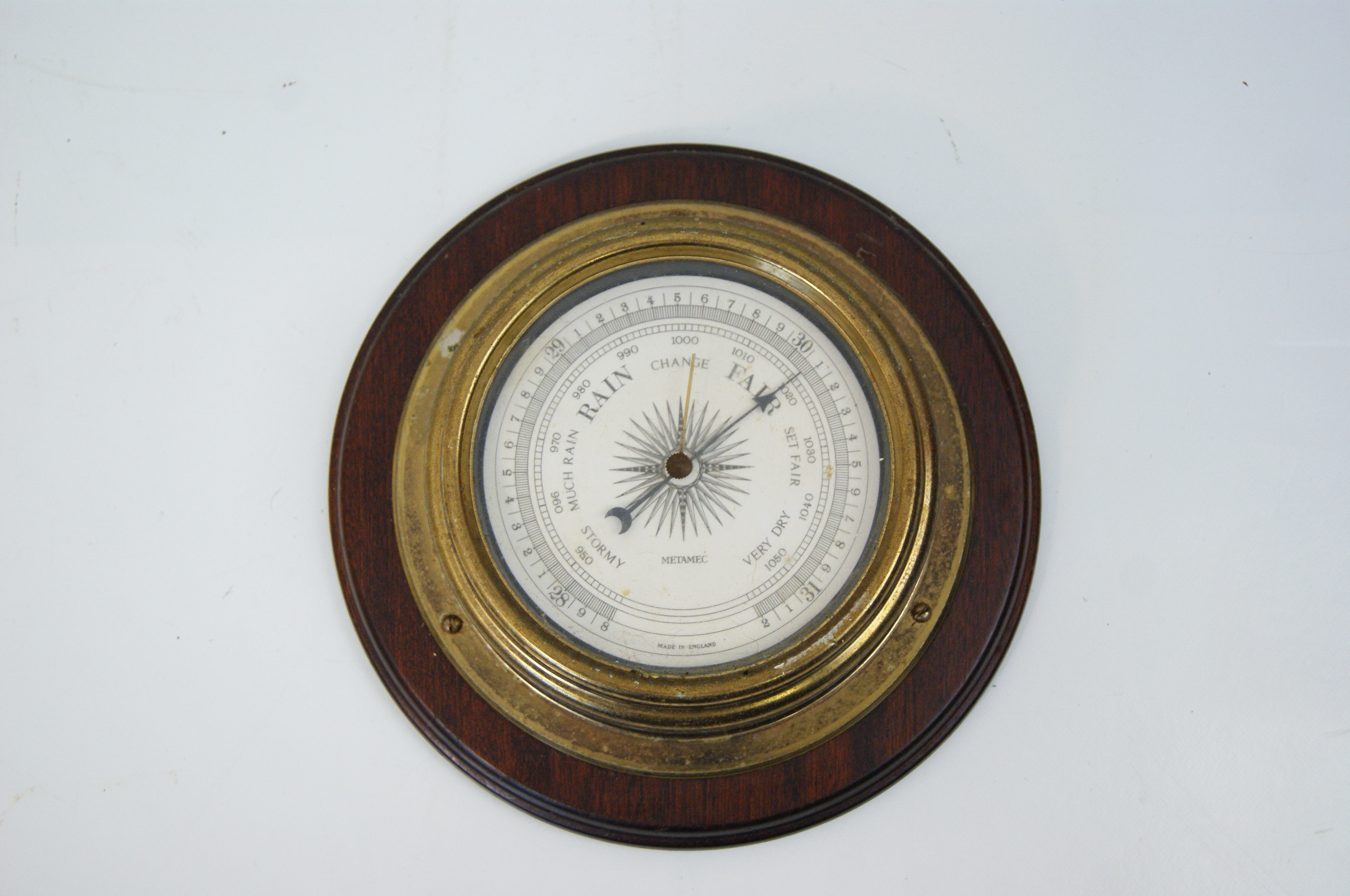 A mid-20th-century circular aneroid wall barometer manufactured by Metamec in England. The instrument features a white dial with a central black and white starburst motif, marked Metamec and Made in England. The dial displays two scales: an inner scale calibrated in millibars from 950 to 1050 and an outer scale in inches of mercury from 28 to 31. Weather indications are printed around the dial including Stormy, Much Rain, Rain, Change, Fair, Set Fair, and Very Dry. The barometer is fitted with a black steel indicator hand and a brass manually-operated set hand. The mechanism is enclosed within a stepped brass bezel with a glass cover, mounted on a circular dark-stained wooden plaque.