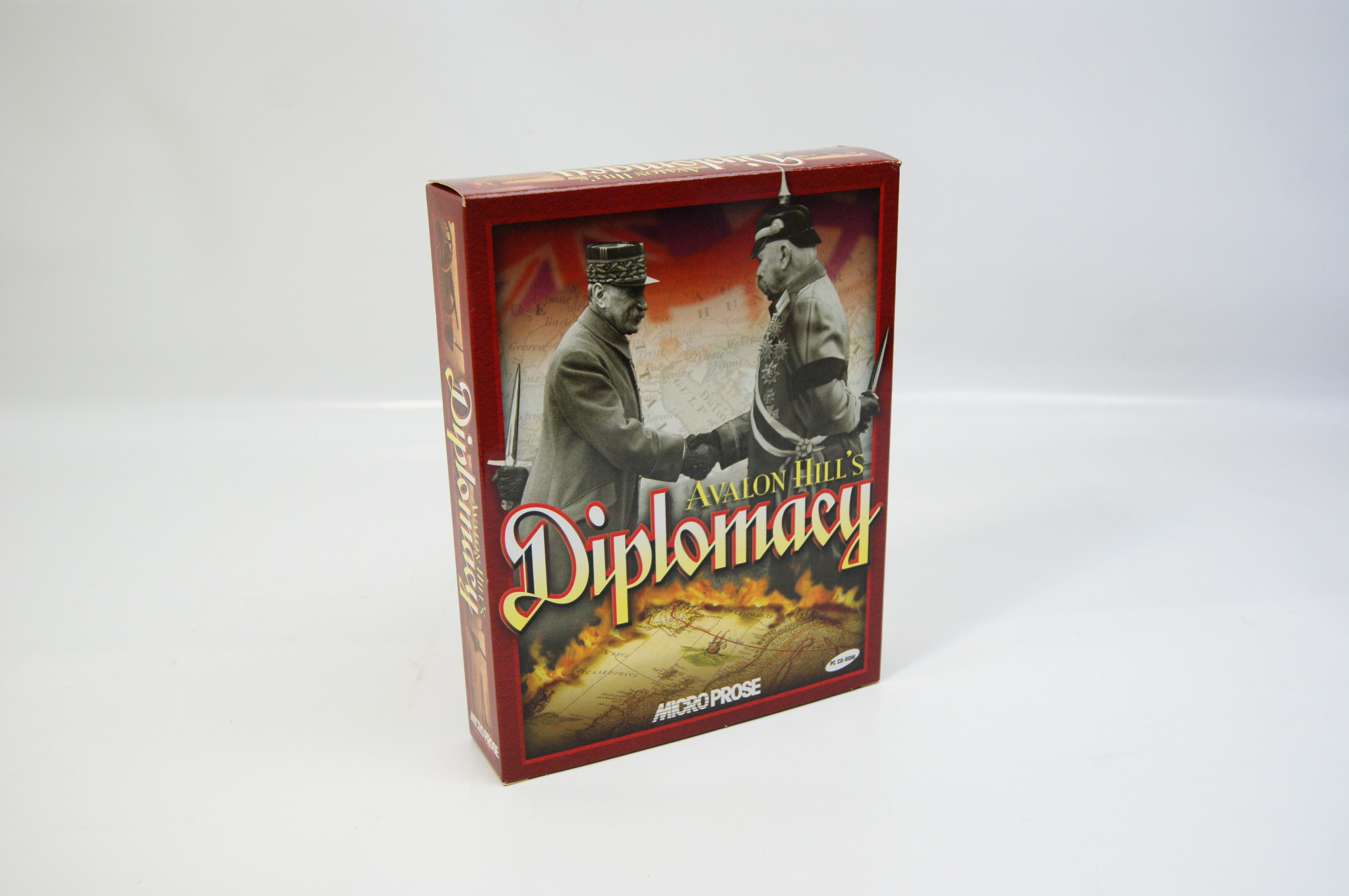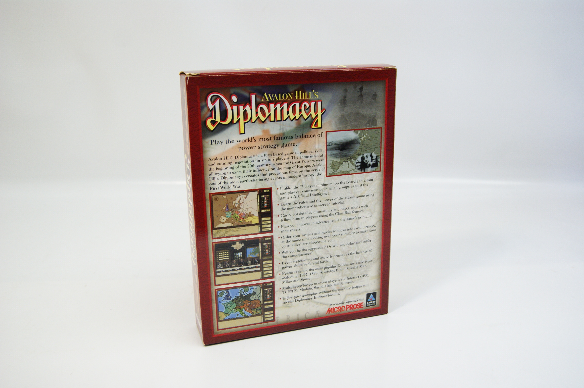 A vintage big box PC CD-ROM edition of Avalon Hill’s Diplomacy, published by MicroProse and Hasbro Interactive in 1999. The turn-based strategy game is housed in its original cardboard retail packaging. The front cover art depicts two military figures in historical attire shaking hands while holding daggers behind their backs, set against a map of Europe. The box features the MicroProse and PC CD-ROM logos. The reverse of the box provides a summary of gameplay features, including Artificial Intelligence for solo play, an on-screen tutorial, and multiplayer support for up to seven players via internet, modem, or serial link. It also notes the inclusion of ten game types such as 1897, 1898, Anarchy, and Milan.