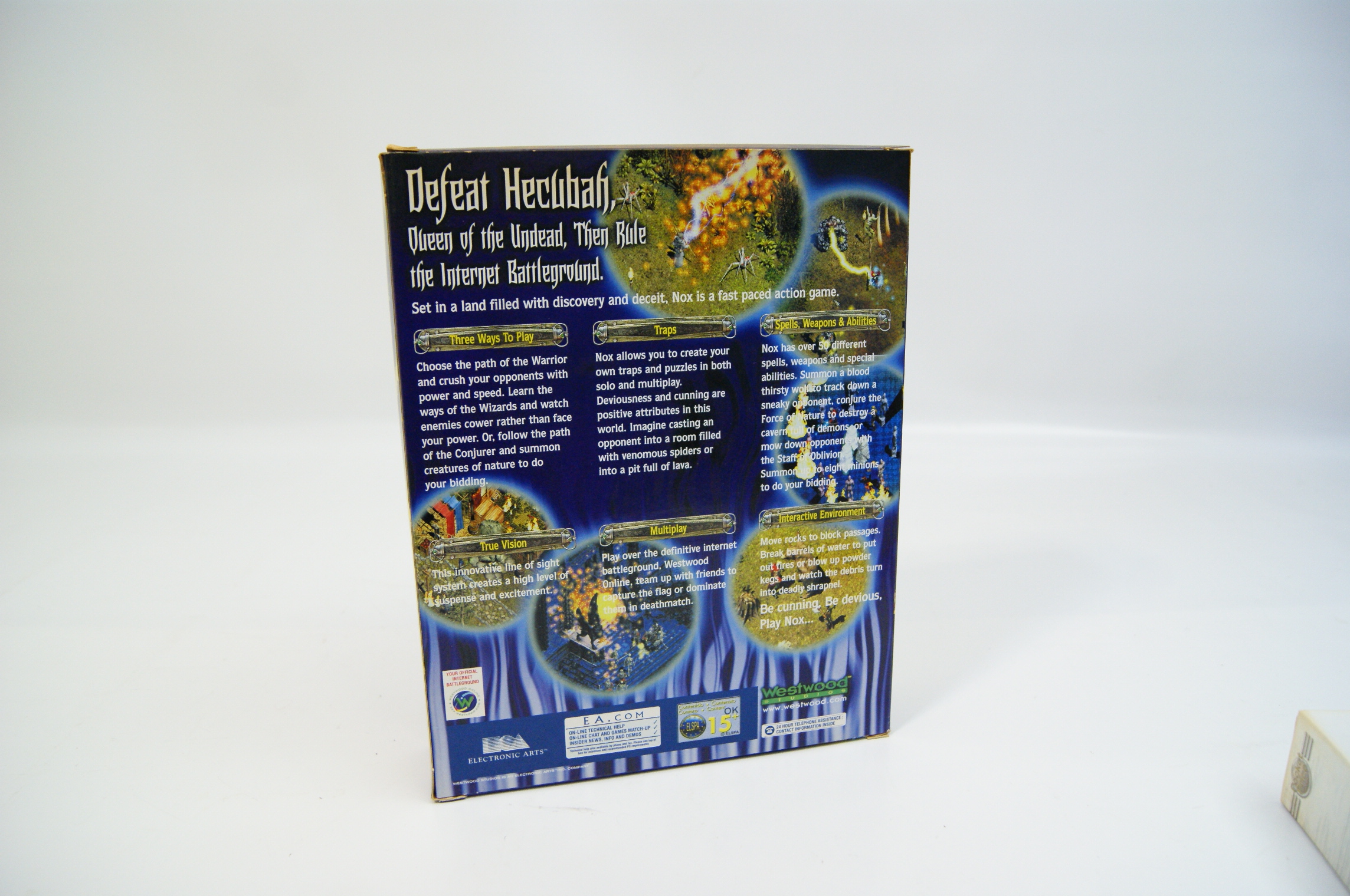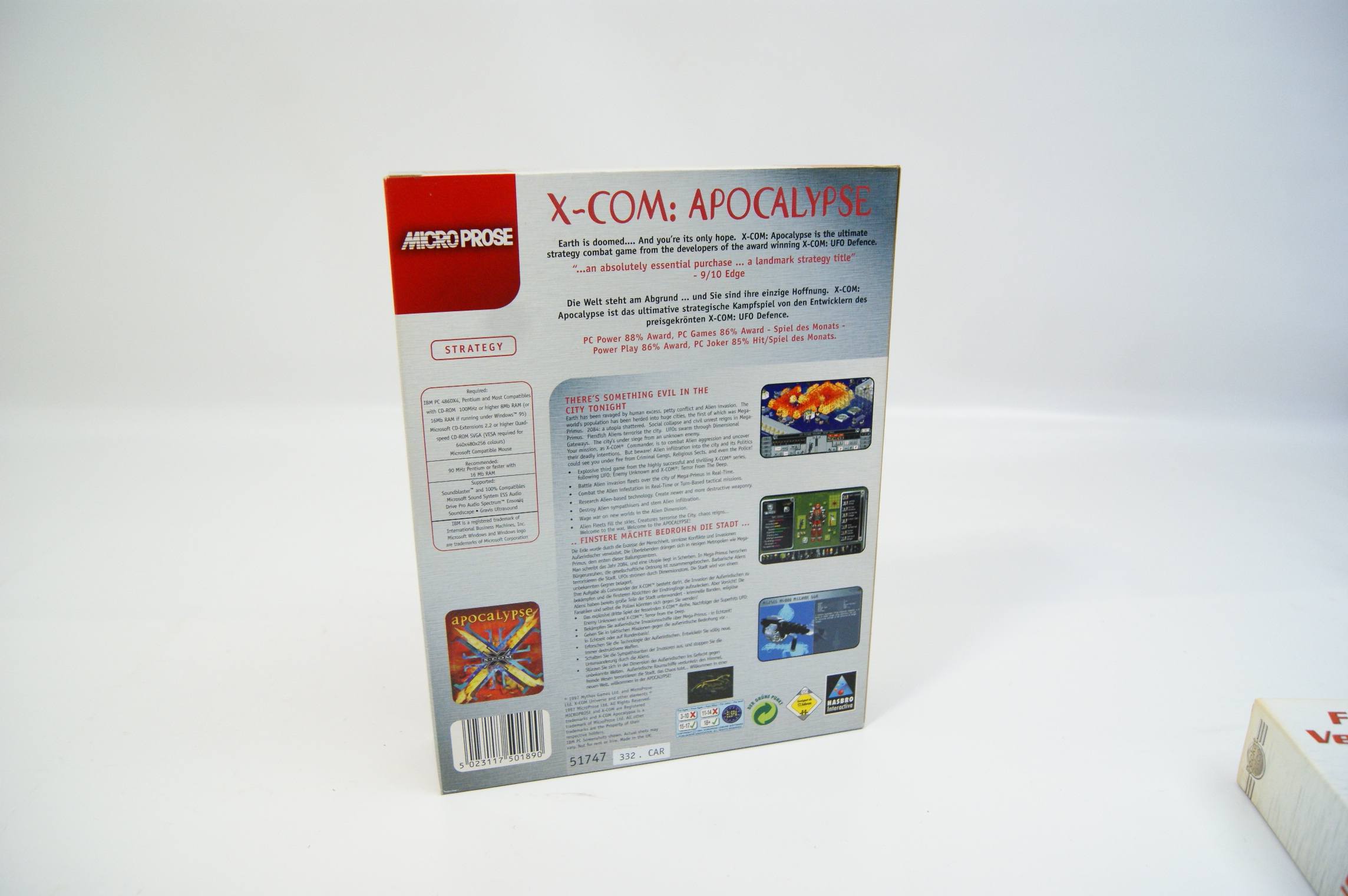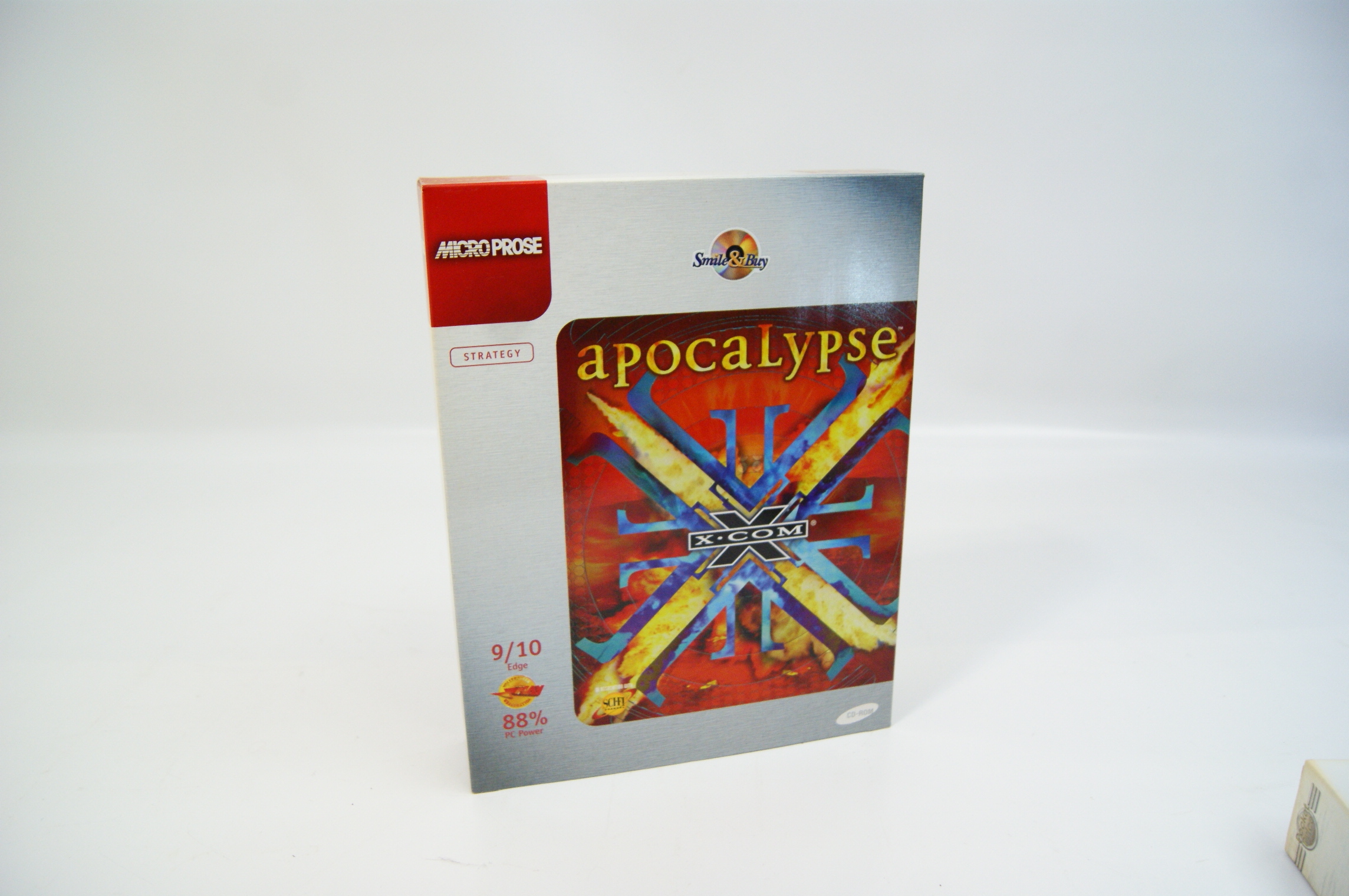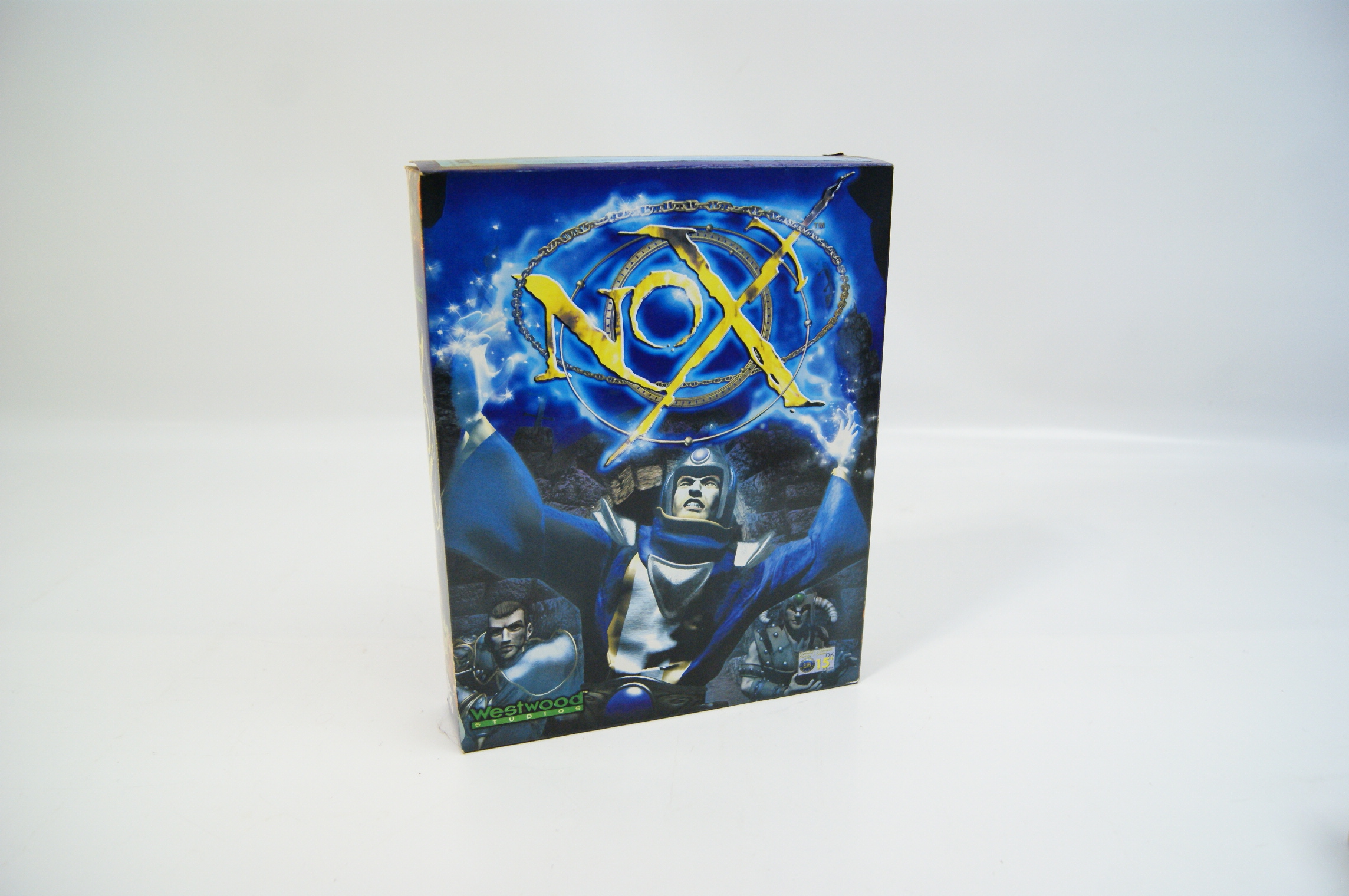 This lot features two PC CD-ROM video games in their original cardboard packaging. The first title is Nox, developed by Westwood Studios and published by Electronic Arts, dating to approximately 2000. The box art depicts the central characters and the reverse provides information regarding the three character classes of Warrior, Wizard, and Conjurer, alongside details for the Westwood Online multiplayer service. The second title is X-COM: Apocalypse, developed by Mythos Games and published by MicroProse, bearing a 1997 copyright date. This specific edition was released as part of the Smile and Buy reissue series. It is a UK and European market release with descriptive text on the reverse provided in both English and German. The front cover includes review scores from Edge and PC Power magazines. Both items feature the ELSPA 15 age rating.