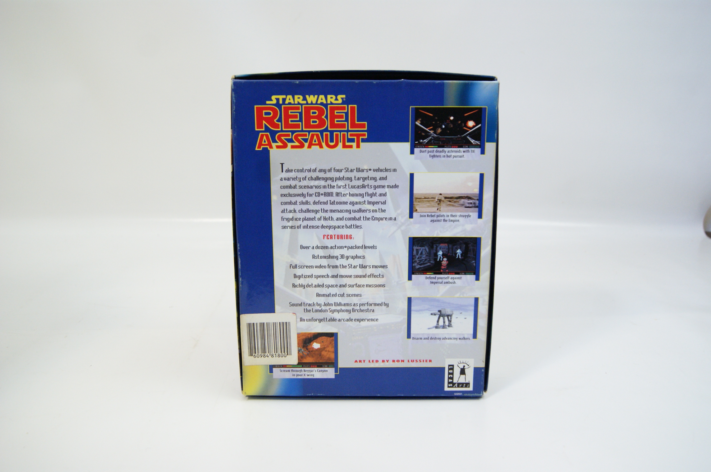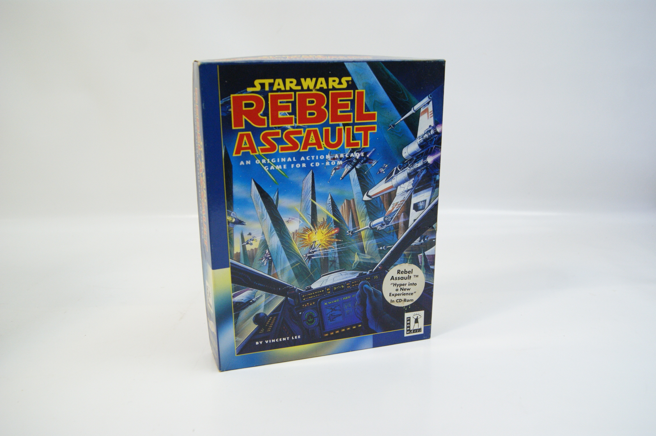 Star Wars: Rebel Assault is an original action arcade game for the PC CD-ROM platform, published by LucasArts circa 1993. The item is housed in its original cardboard big box packaging. The front cover features the game title in stylised red and yellow lettering above the text An Original Action Arcade Game For CD-ROM. The cover artwork, credited to Vincent Lee, depicts an X-wing starfighter pilot’s perspective during a high-speed canyon chase. A circular promotional blurb on the front reads Rebel Assault Hyper into a New Experience In CD-Rom. The reverse of the box provides a game synopsis and a list of features, including over a dozen levels and 3D graphics. It notes a soundtrack by John Williams as performed by the London Symphony Orchestra. The back panel includes four gameplay screenshots and credits the art direction to Ron Lussier. The LucasArts logo is present on both the front and back panels. The barcode on the reverse is 60984 81800.