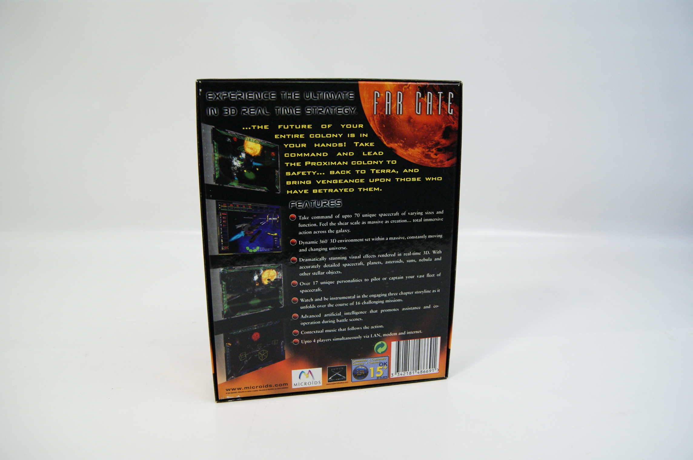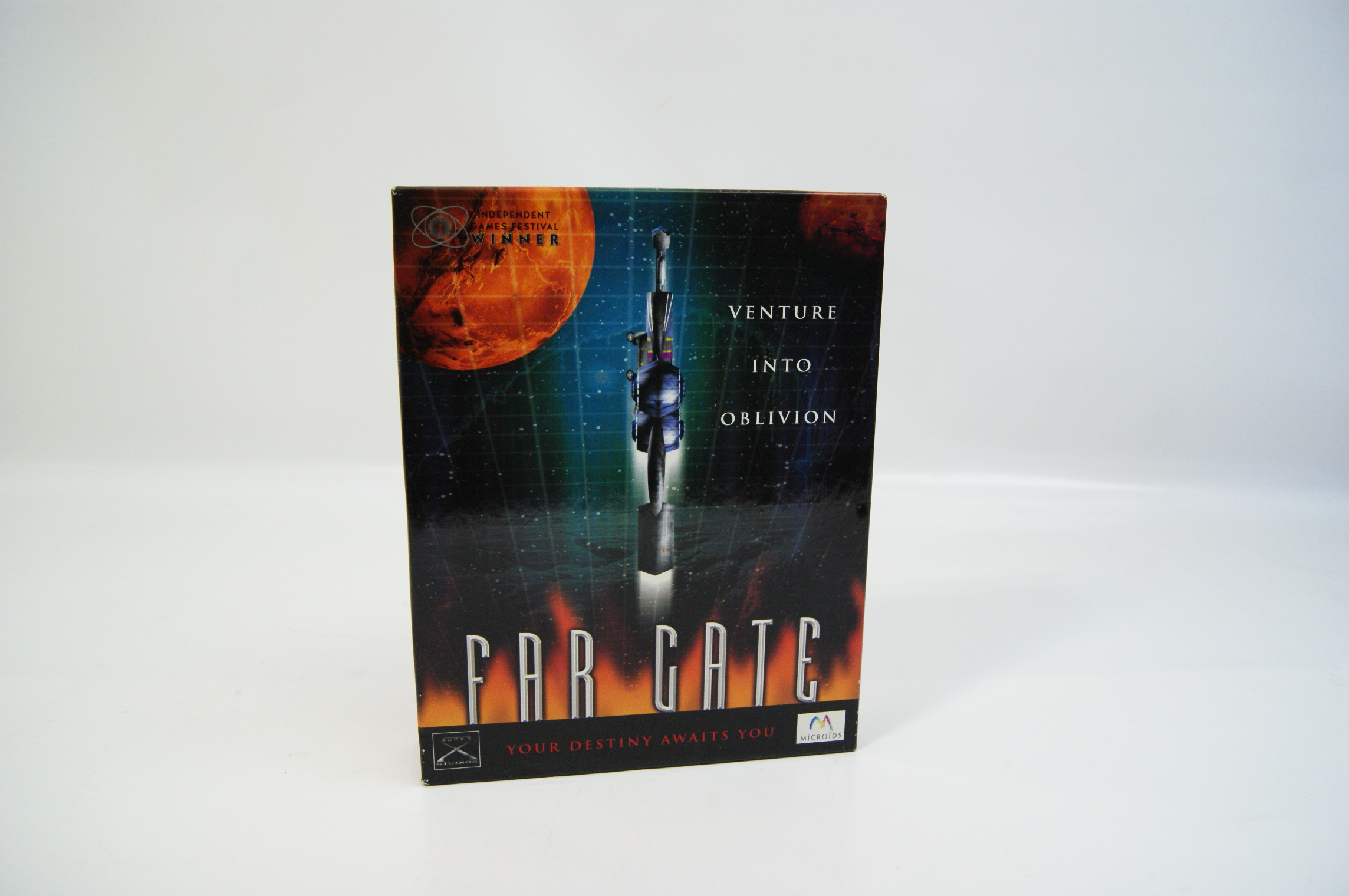 A 2001 Big Box PC CD-ROM edition of the 3D real-time strategy game Far Gate, developed by Super-X Studios and published by Microids. The cardboard packaging features a space-themed front cover with a central spacecraft, a large orange planet, and a digital grid background. The title is embossed in silver-white typography. The front includes the tagline Venture Into Oblivion / Your Destiny Awaits You and an Independent Games Festival Winner seal. The back panel details game features such as a 360-degree 3D environment and multiplayer capabilities for up to four players via LAN, modem, and internet. It displays four in-game screenshots and contains the ELSPA 15+ rating sticker. Logos for Super-X Studios and Microids are present on both the front and back panels. The barcode 3 342181 486691 is located on the reverse.