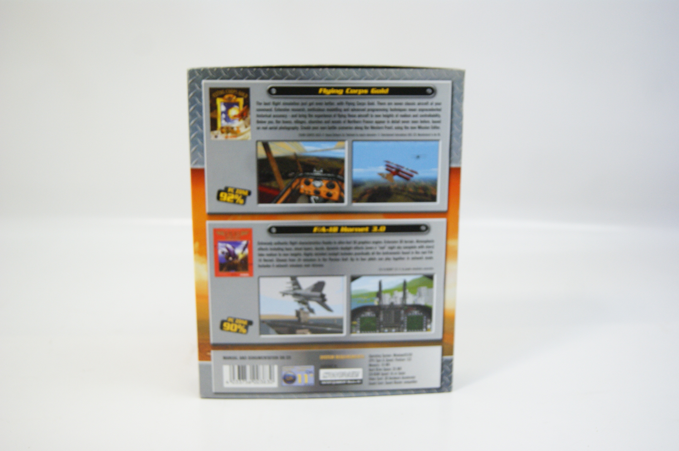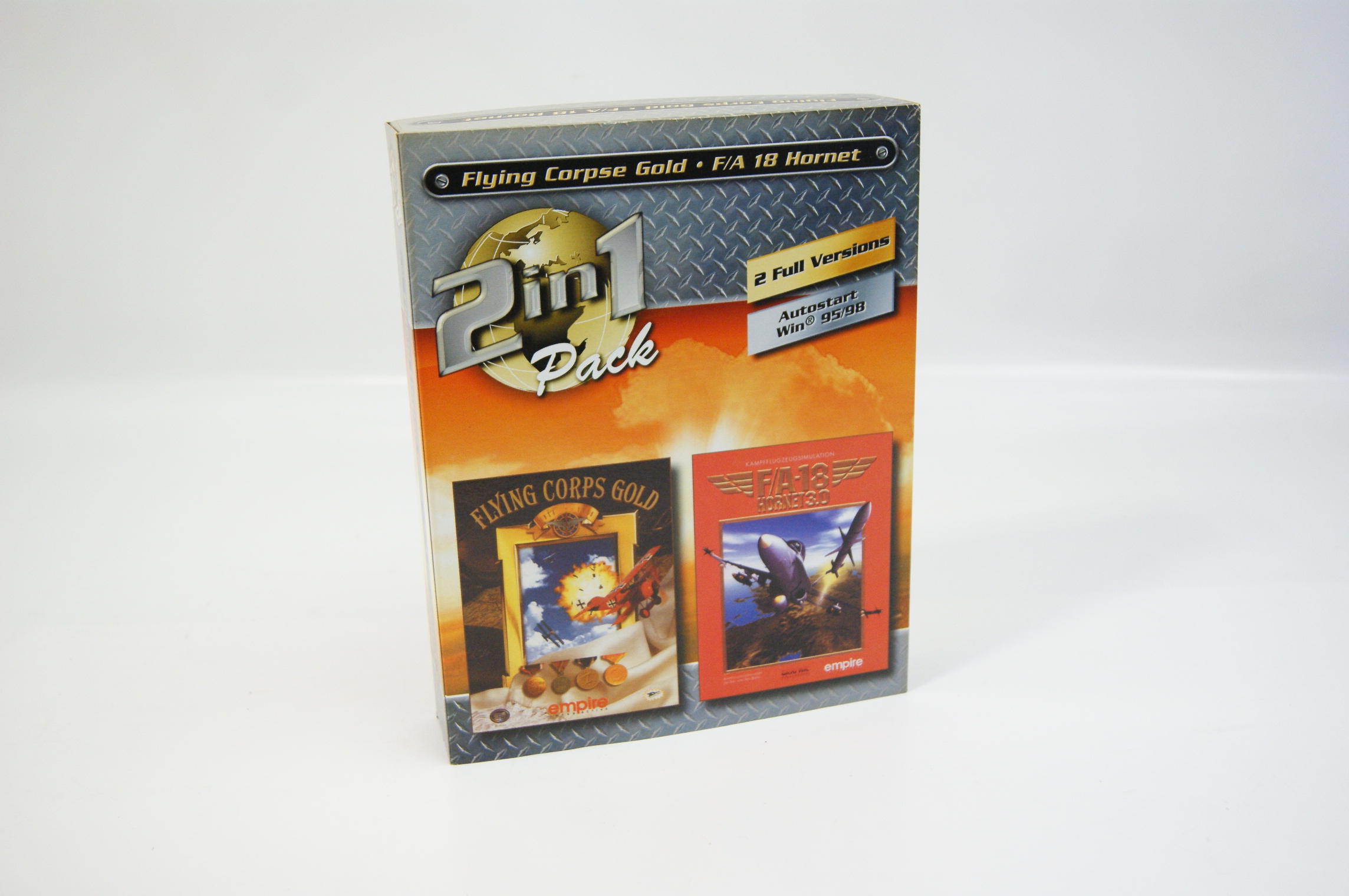 A vintage PC big box compilation titled 2 in 1 Pack, published by the British company Empire Interactive. This retail set contains two full-version flight simulation titles: Flying Corps Gold and F/A-18 Hornet 3.0. The front of the cardboard box displays the 2 in 1 Pack branding over a golden globe graphic, with the original cover art for both games featured below. Text on the front indicates the software is designed for Windows 95 and 98 platforms. The reverse of the box provides descriptive overviews for both games, accompanied by gameplay screenshots and review accolades from PC Zone magazine, citing scores of 92 per cent and 90 per cent respectively. System requirements and a barcode are printed at the base of the rear panel. This item is a UK-market release.