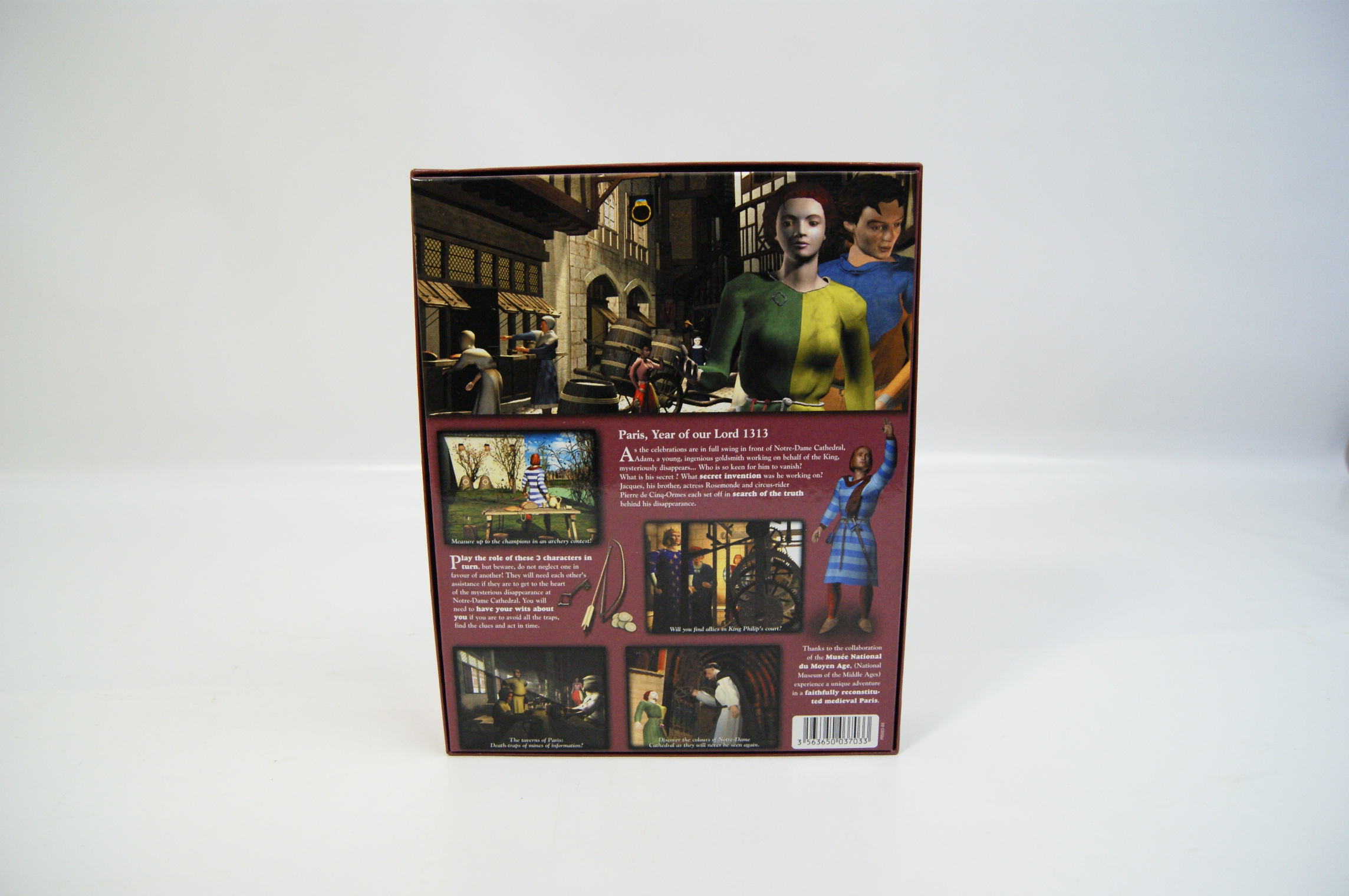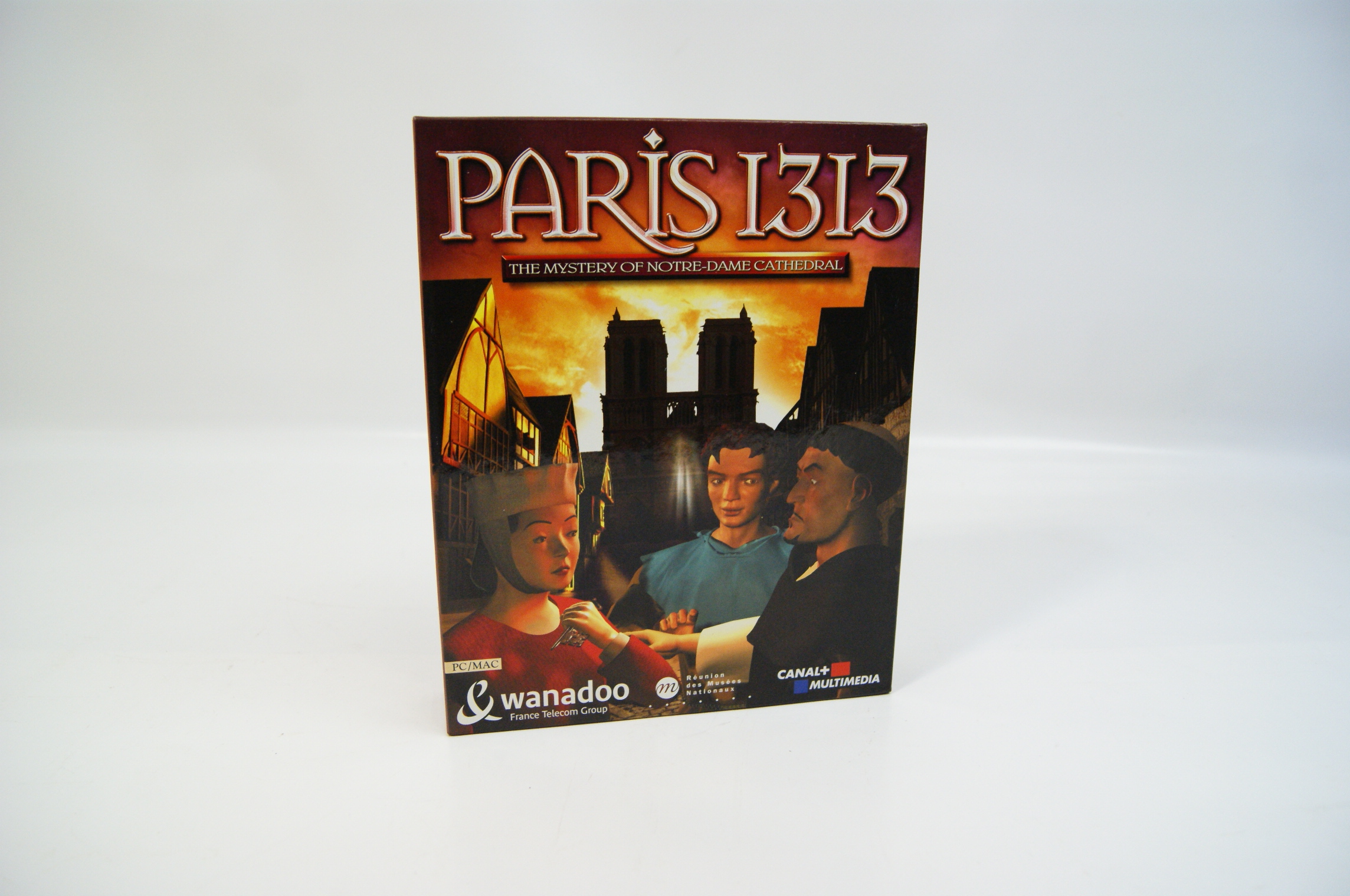 A large-format retail box edition of the historical adventure game Paris 1313: The Mystery of Notre-Dame Cathedral, released circa 1999. The title was published by Wanadoo (France Telecom Group) in collaboration with Canal+ Multimedia and Reunion des Musees Nationaux (RMN). The software is designed for use on both PC and Macintosh platforms. Developed with the assistance of the Musee National du Moyen Age (National Museum of the Middle Ages), the game features 3D reconstructed environments of medieval Paris. The front cover depicts characters against a backdrop of the cathedral, with logos for the contributing organisations at the base. The reverse of the box provides a narrative summary concerning the disappearance of a goldsmith named Adam, alongside several gameplay screenshots. The barcode is 3 563650 037033.