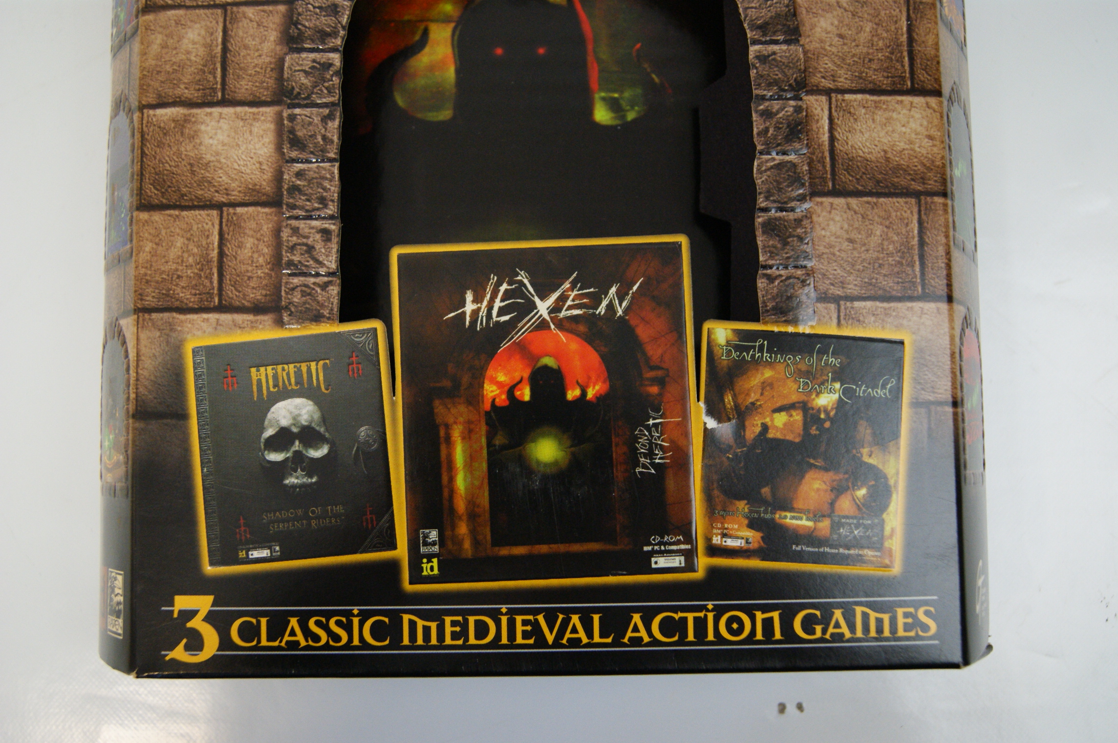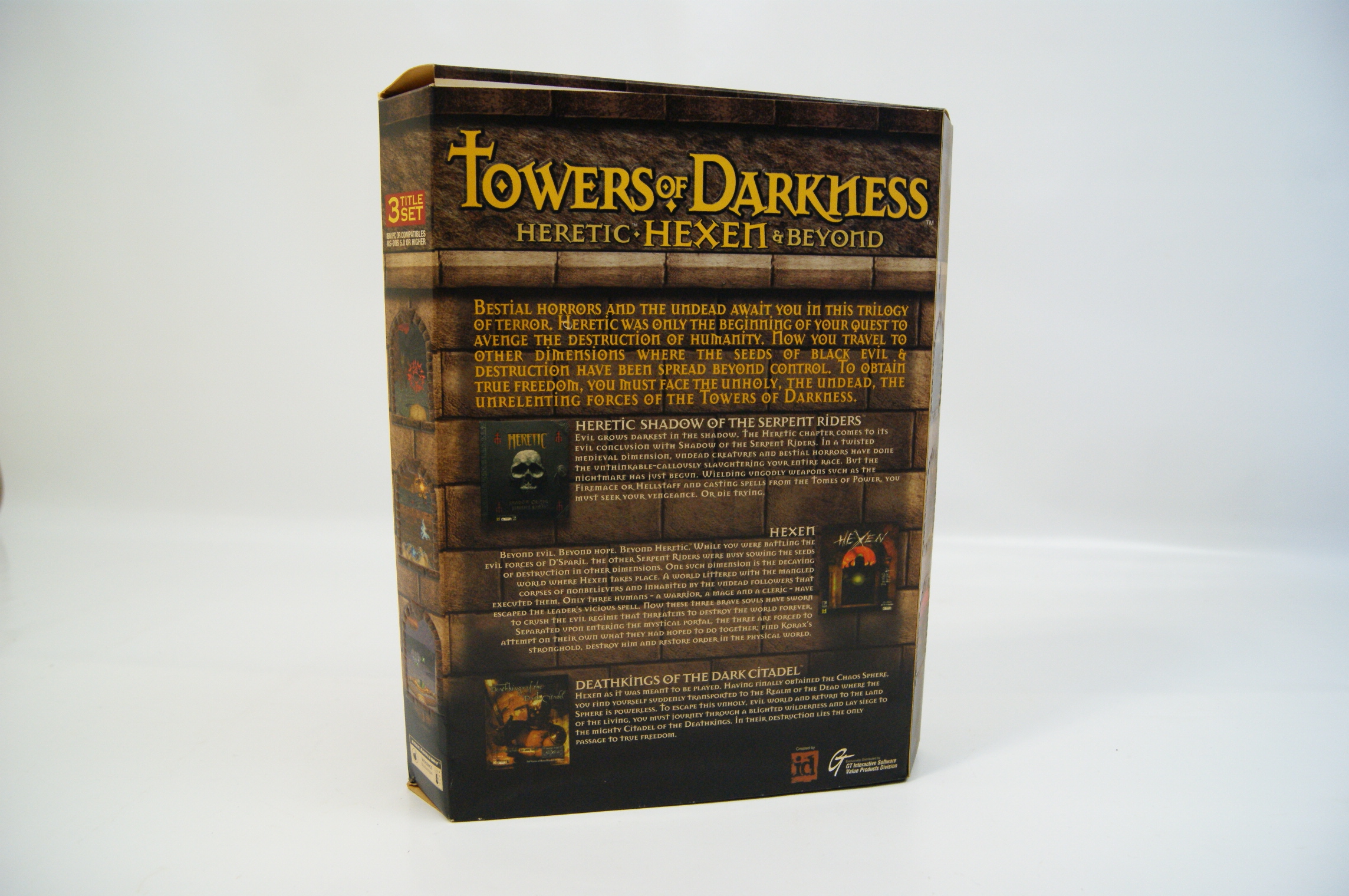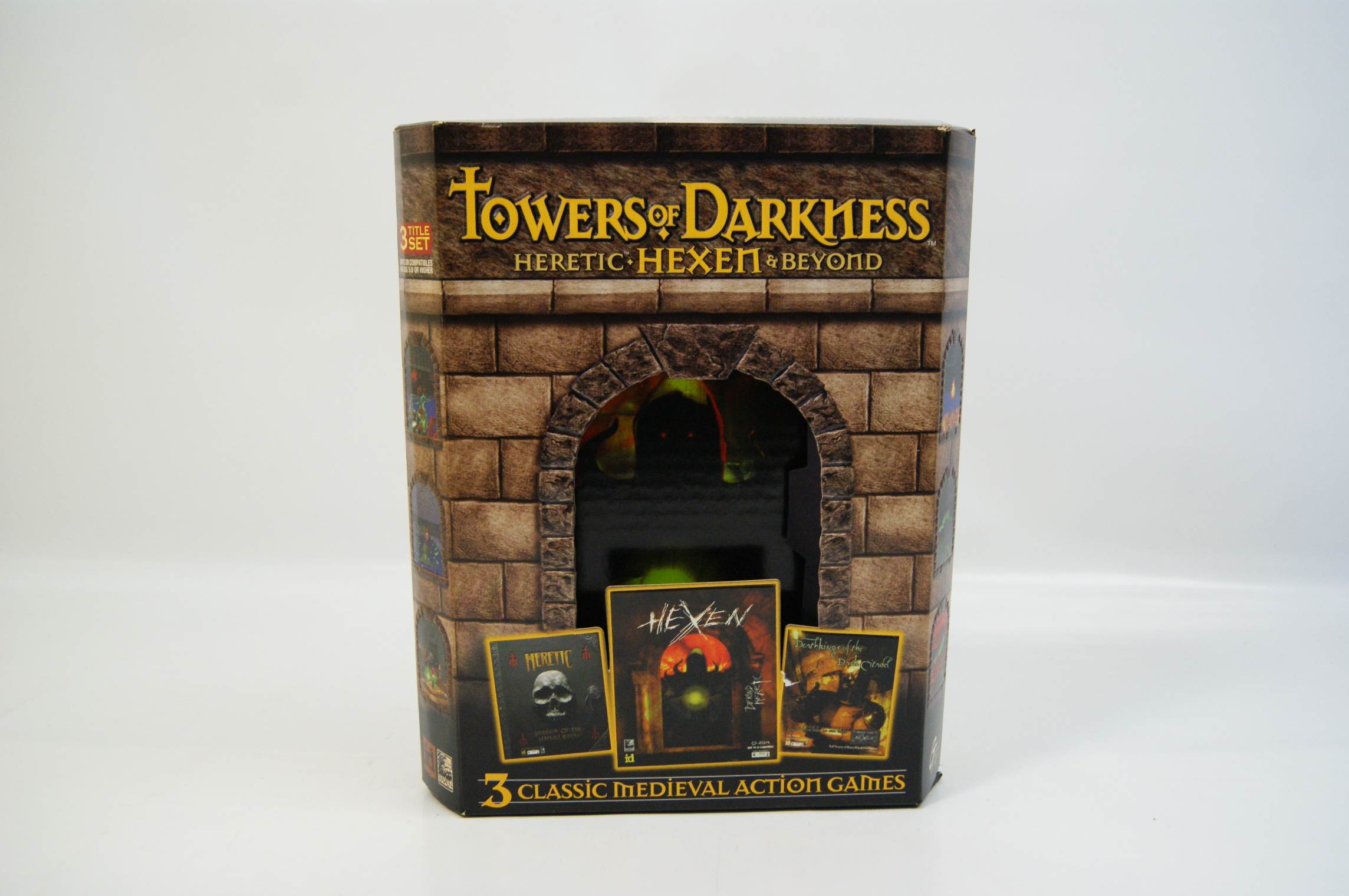 A PC game compilation titled Towers of Darkness Heretic Hexen and Beyond published by GT Interactive Software under the Value Products Division. The collection was developed by Raven Software and id Software. This set includes three titles: Heretic Shadow of the Serpent Riders, Hexen Beyond Heretic, and the expansion Deathkings of the Dark Citadel. The packaging is constructed from cardboard in a big box format featuring a die-cut arched window on the front panel which reveals a decorative internal cardboard sleeve. The exterior artwork depicts a stone tower theme with various game screenshots displayed in smaller arched windows. Printed logos for id Software, Raven Software, and GT Interactive Software are present on the front and rear panels. Technical specifications on the box indicate system requirements of a 486 or compatible processor and MS-DOS 5.0 or higher. This listing consists of the outer box and internal sleeve; internal media such as CD-ROMs and printed manuals are not confirmed as present.