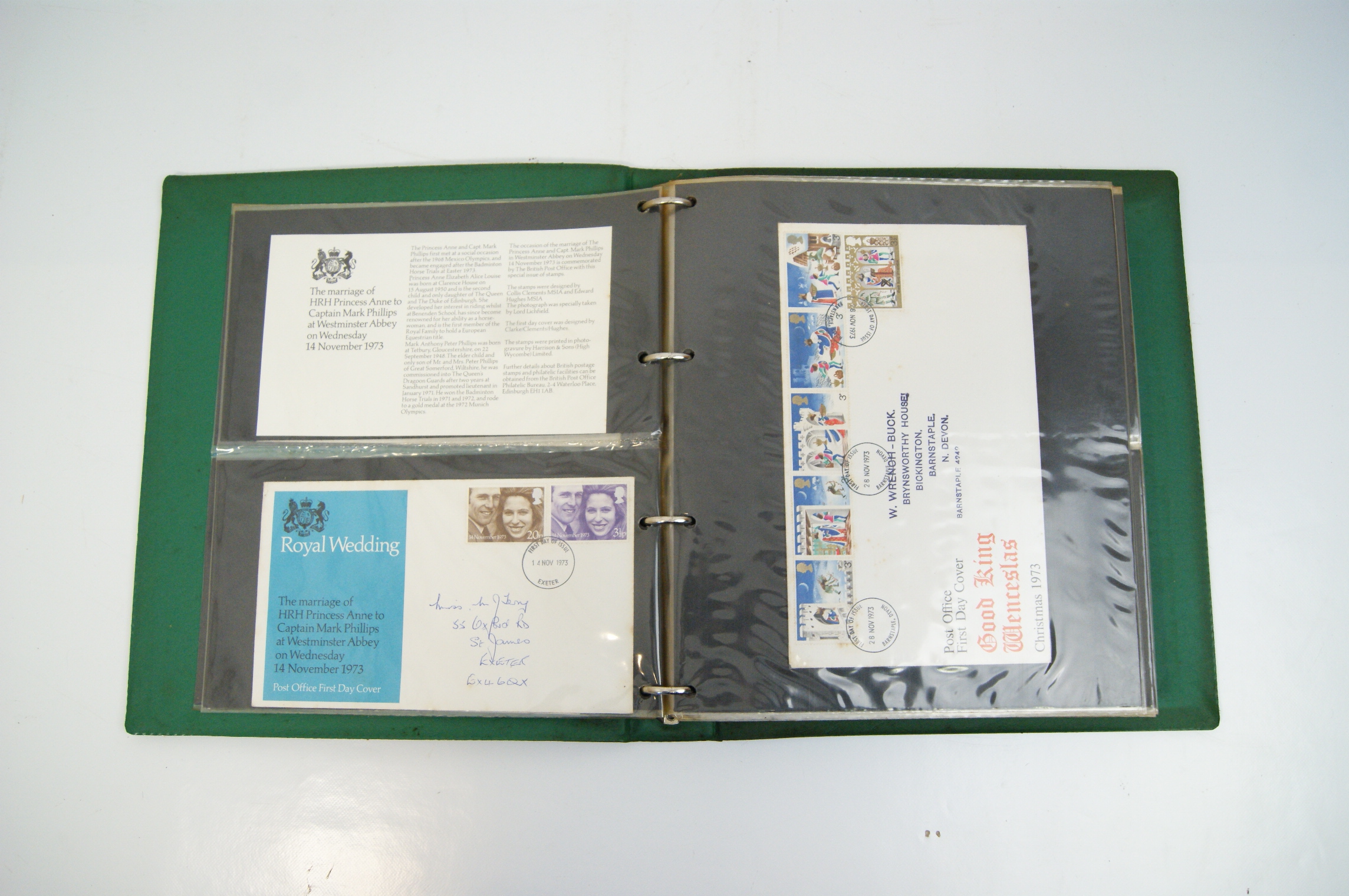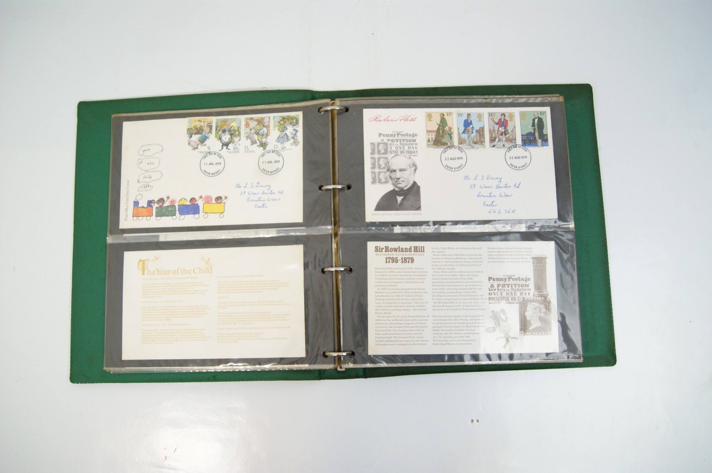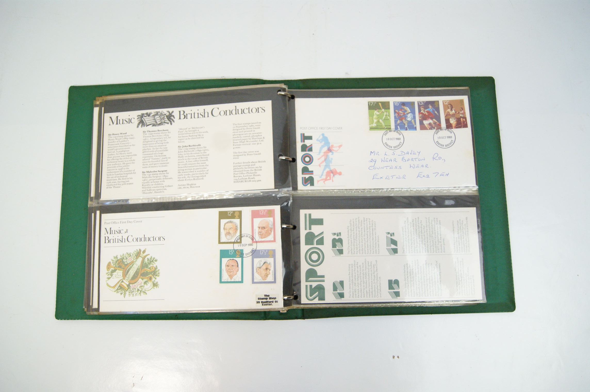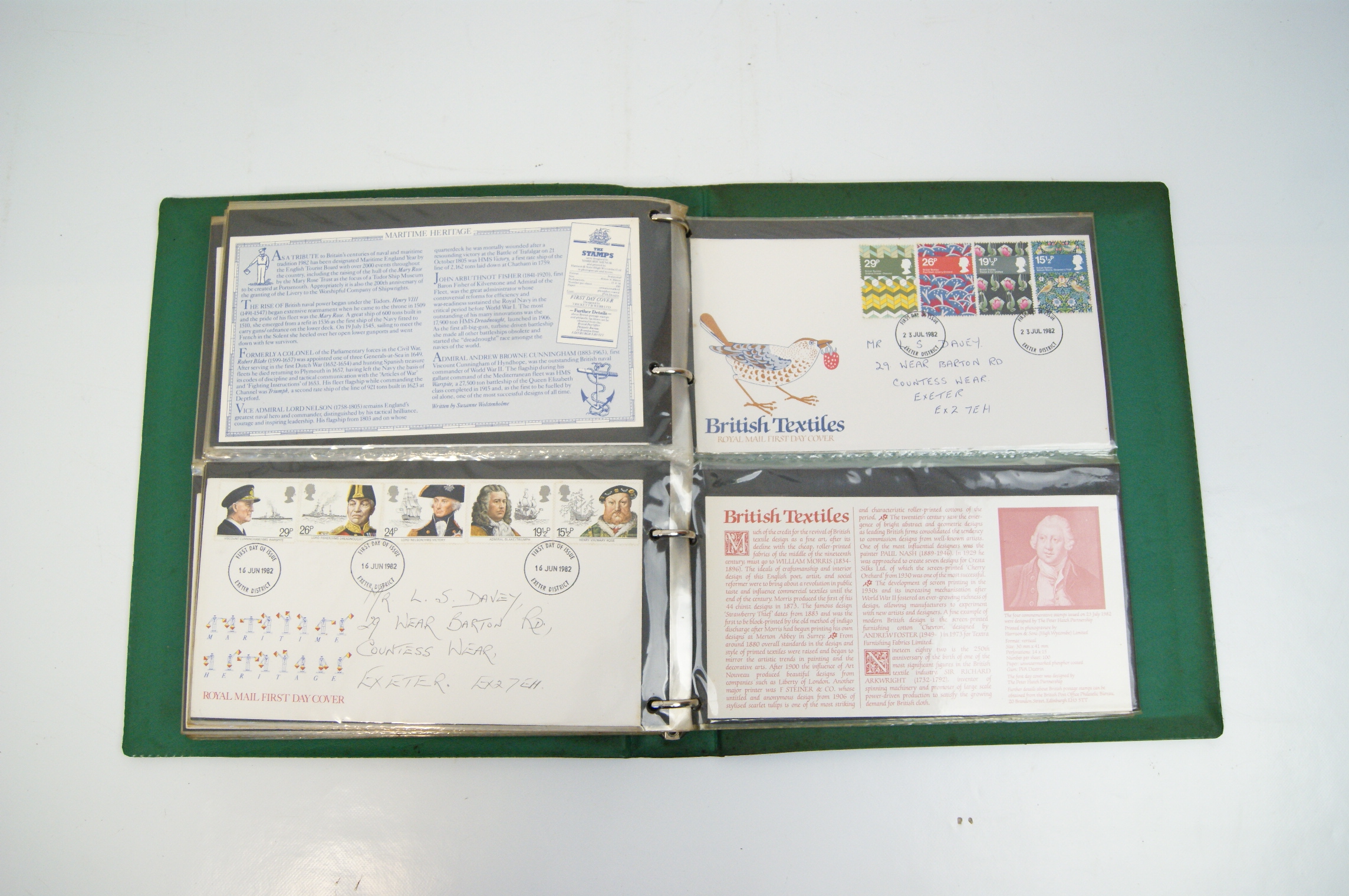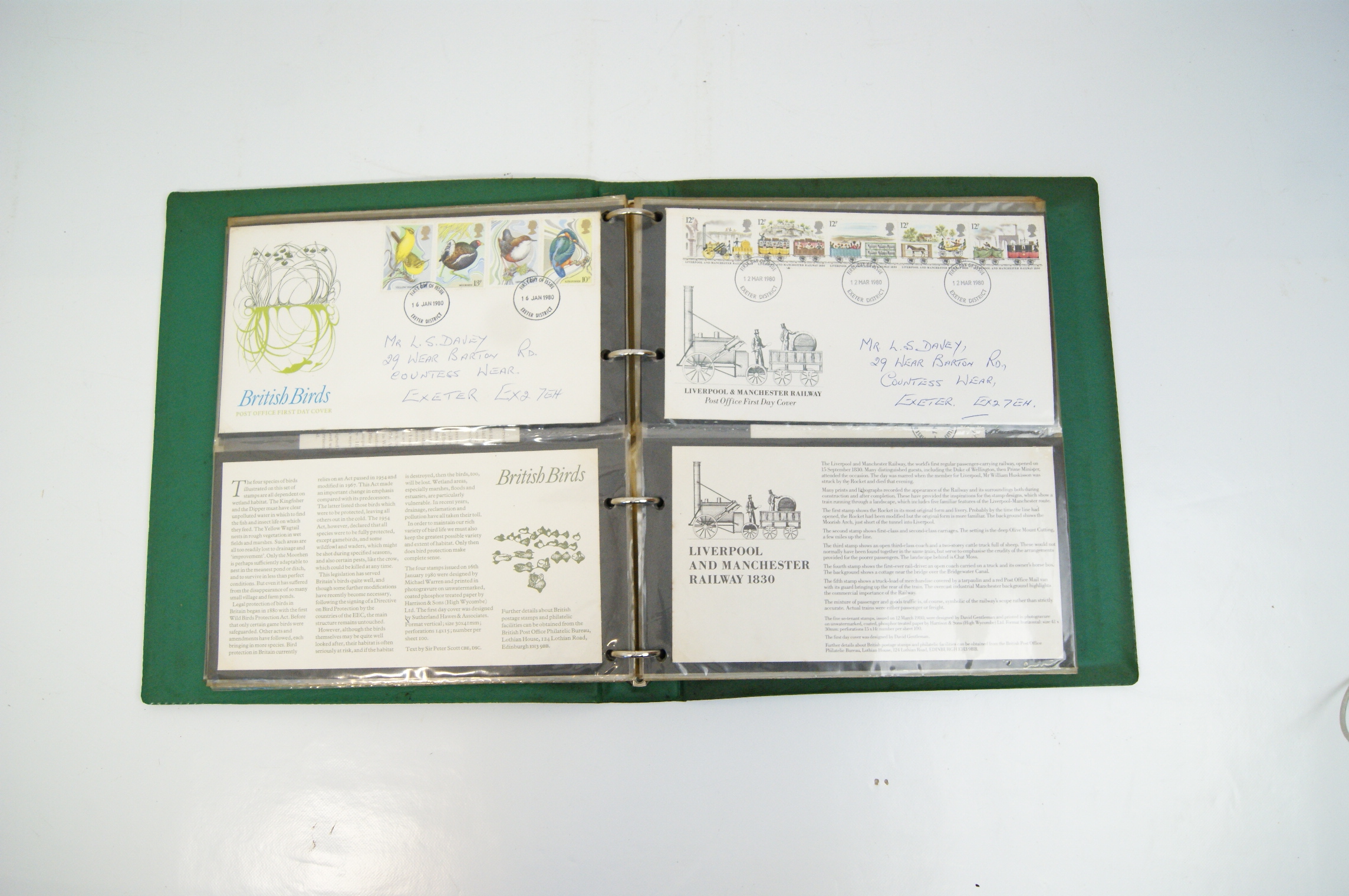 An assortment of UK commemorative First Day Covers spanning the period 1971 to 1982, housed in a green Stanley Gibbons New Thames Cover Album. The collection includes various commemorative sets including the 1971 General Anniversaries, 1973 Royal Wedding of HRH Princess Anne, 1973 Christmas, 1979 International Year of the Child, 1979 Sir Rowland Hill, 1980 British Birds, 1980 Liverpool & Manchester Railway, 1980 Sport, 1980 British Conductors, 1982 British Textiles, and 1982 Maritime Heritage. The covers feature multicoloured perforated stamps with circular date stamp cancellations, predominantly from the Exeter District and Barnstaple, Devon. Most covers are addressed and are accompanied by the original informational insert cards. The collection is stored within clear plastic pocket pages.