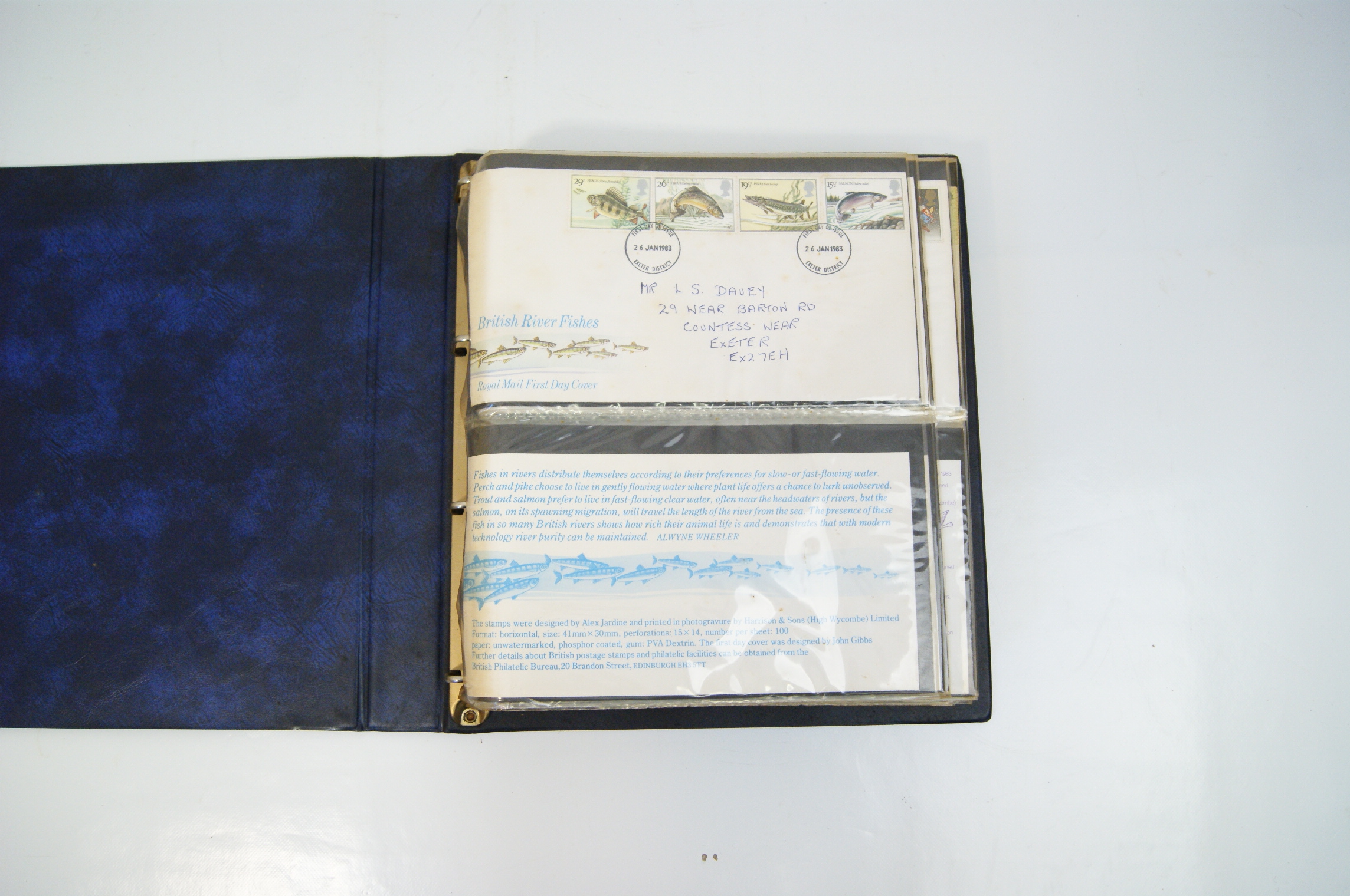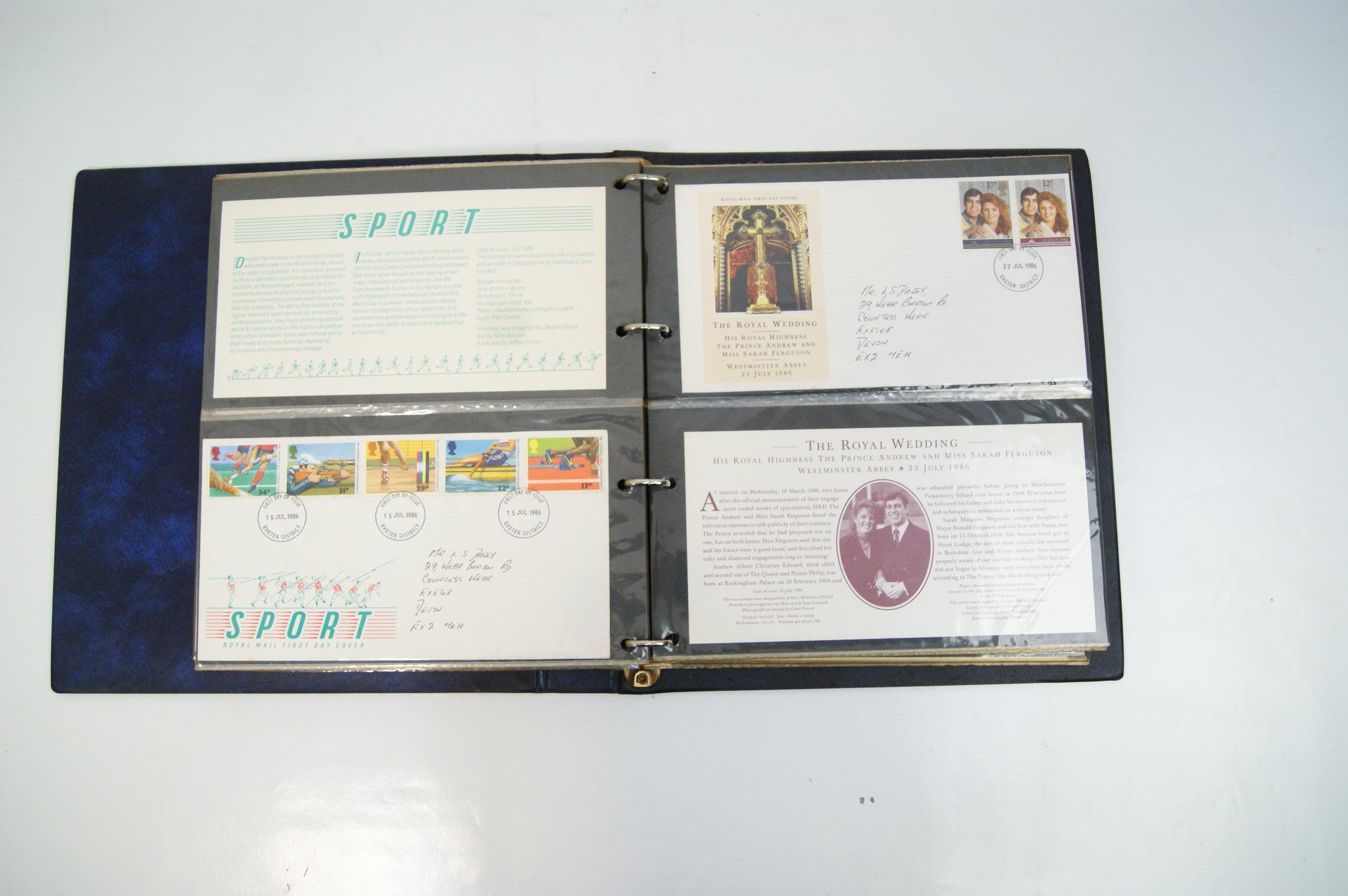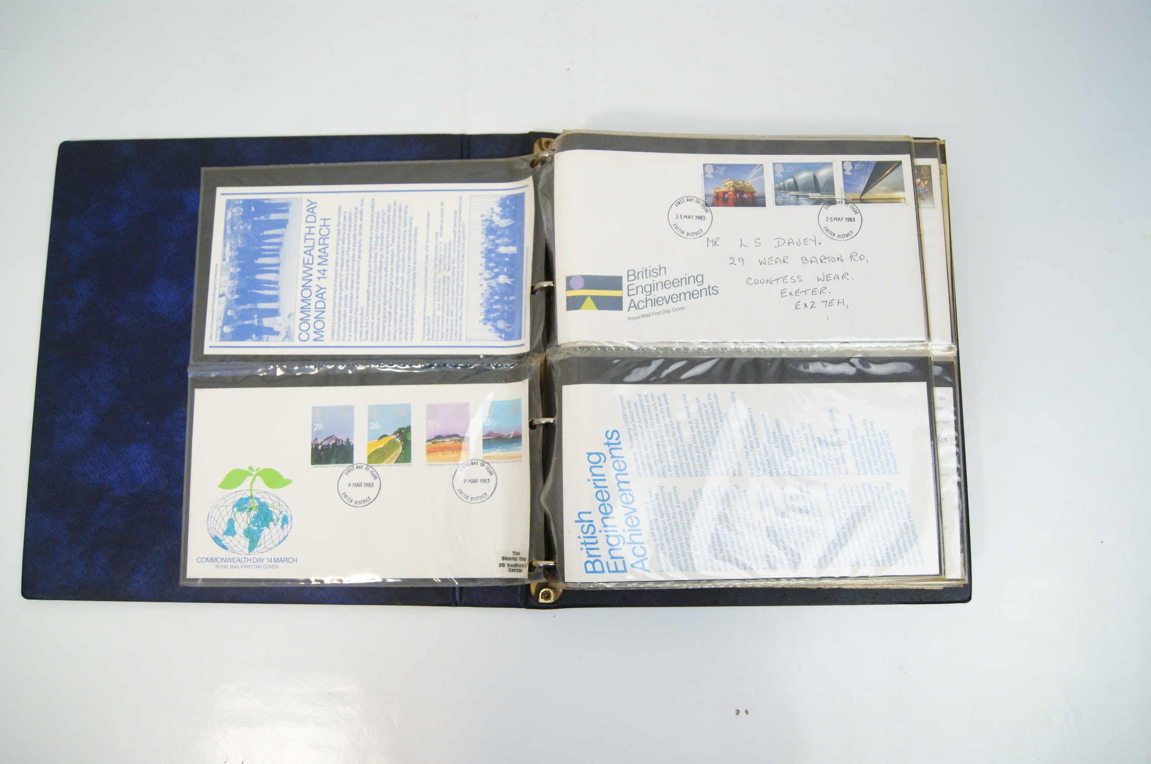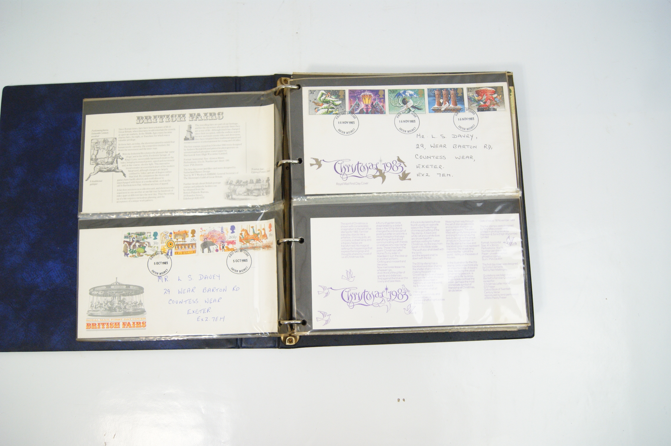 A collection of UK Royal Mail First Day Covers dating from approximately 1983 to 1988, presented in a blue Stanley Gibbons Malvern Cover Album. The collection features a variety of commemorative issues including British River Fishes (1983), Commonwealth Day (1983), British Engineering Achievements (1983), British Fairs (1983), Christmas (1983 and 1985 Pantomime), the 1984 London Economic Summit, Greenwich 1884-1984, Industry Year 1986, Sport (1986), the Royal Wedding of Prince Andrew and Sarah Ferguson (1986), British Architects in Europe (1987), St John Ambulance (1987), and Edward Lear’s Verse for Children (1988). The multi-coloured perforated stamps include denominations of 12p, 15p, 16p, 17p, 19p, 20p, 22p, 26p, 28p, 29p, 31p, 32p, 34p, and 35p. Each cover is cancelled with a circular date stamp (CDS) from the Exeter District marking the first day of issue. The covers are hand-addressed to a recipient in Exeter and are accompanied by Royal Mail information cards providing technical details such as designer, printer, printing process (primarily photogravure or lithography), and perforation gauge (typically 15 x 14). The items are housed in transparent protective sleeves within a three-ring binder system.