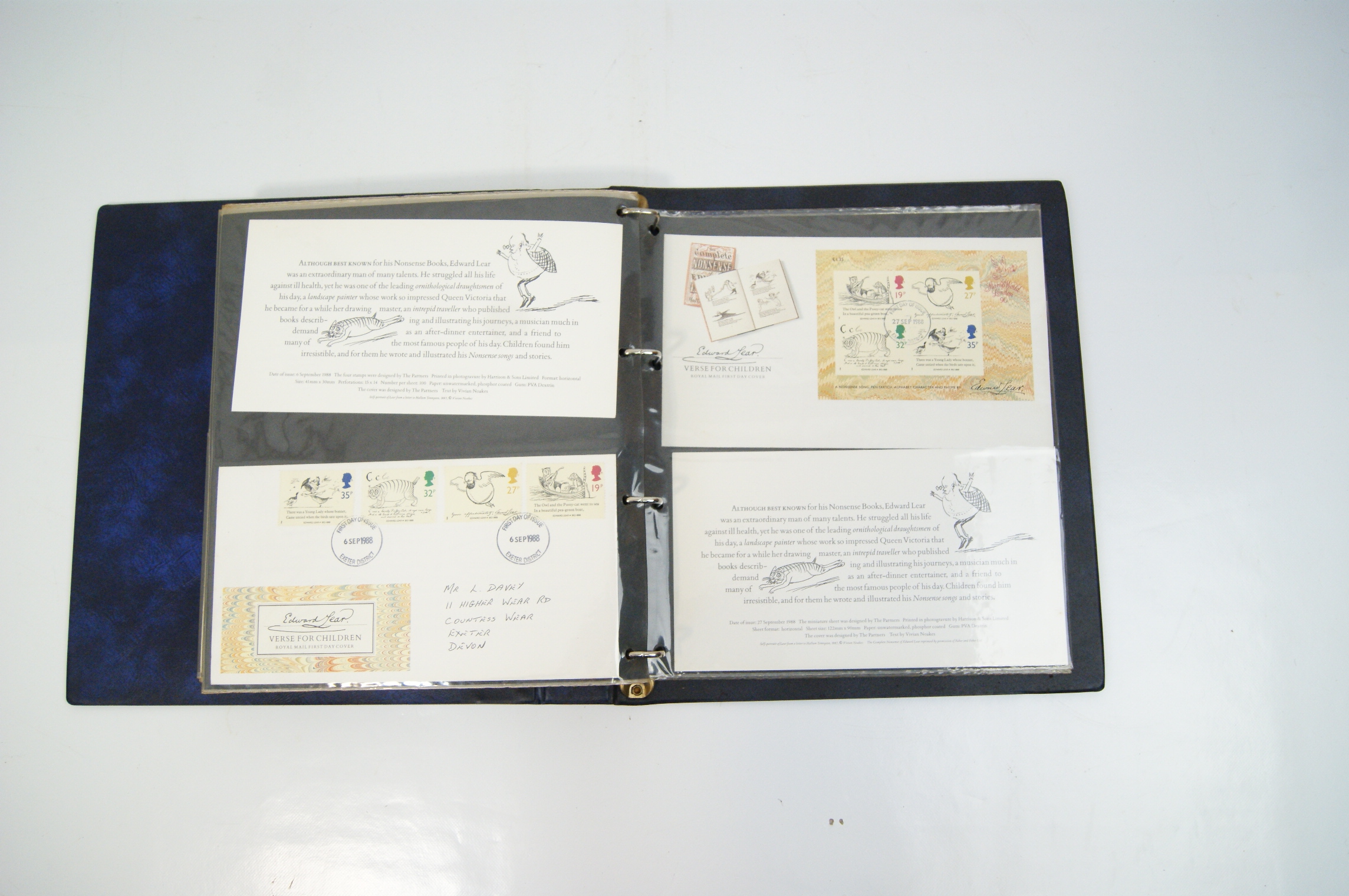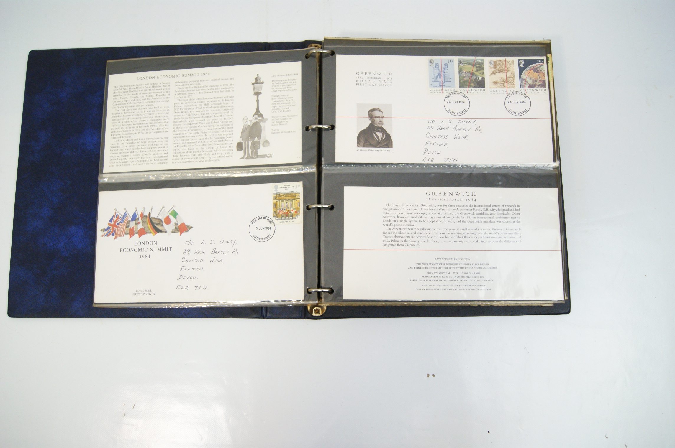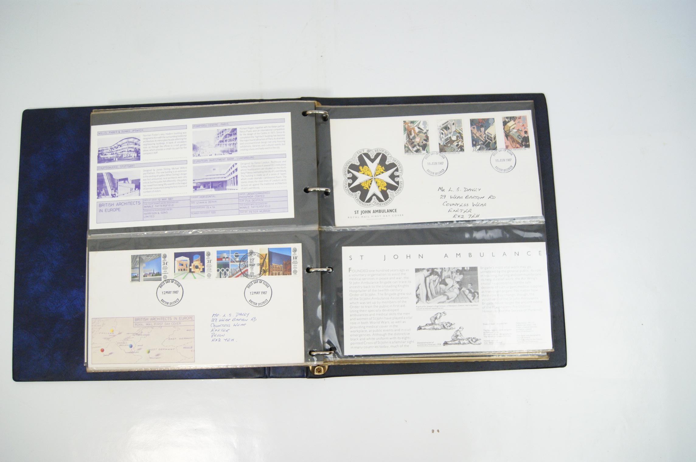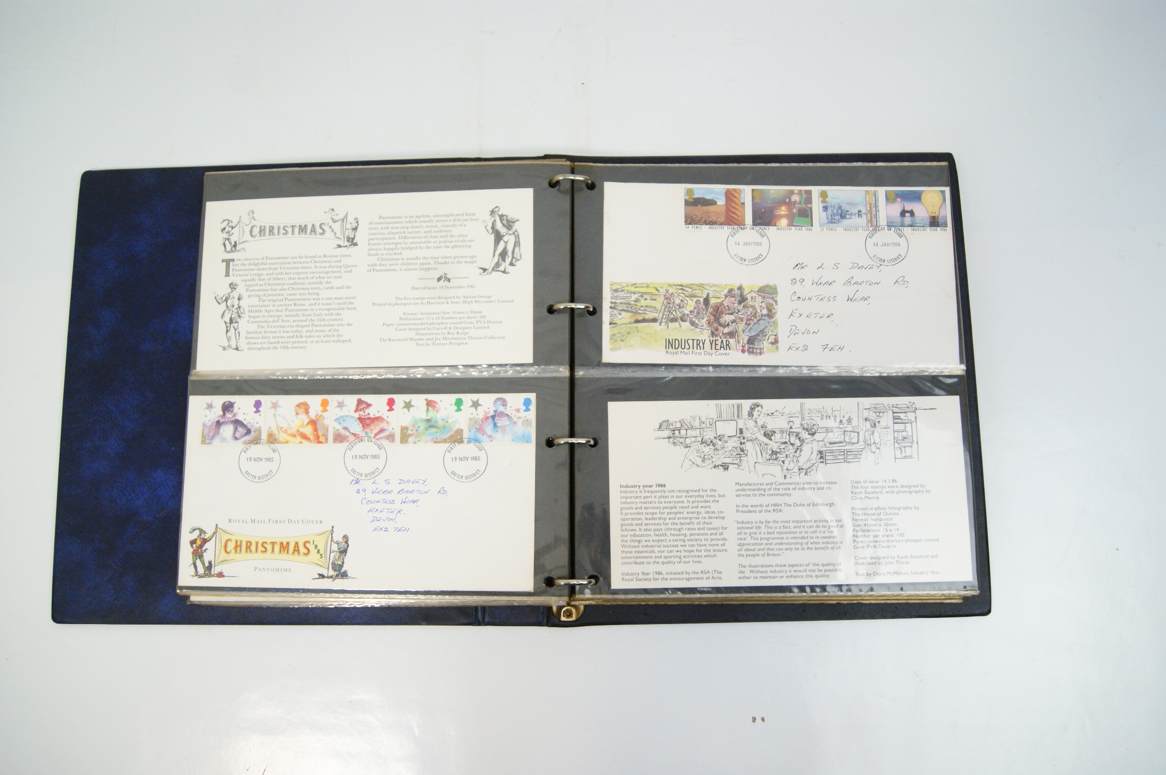 A collection of UK Royal Mail First Day Covers dating from approximately 1983 to 1988, presented in a blue Stanley Gibbons Malvern Cover Album. The collection features a variety of commemorative issues including British River Fishes (1983), Commonwealth Day (1983), British Engineering Achievements (1983), British Fairs (1983), Christmas (1983 and 1985 Pantomime), the 1984 London Economic Summit, Greenwich 1884-1984, Industry Year 1986, Sport (1986), the Royal Wedding of Prince Andrew and Sarah Ferguson (1986), British Architects in Europe (1987), St John Ambulance (1987), and Edward Lear’s Verse for Children (1988). The multi-coloured perforated stamps include denominations of 12p, 15p, 16p, 17p, 19p, 20p, 22p, 26p, 28p, 29p, 31p, 32p, 34p, and 35p. Each cover is cancelled with a circular date stamp (CDS) from the Exeter District marking the first day of issue. The covers are hand-addressed to a recipient in Exeter and are accompanied by Royal Mail information cards providing technical details such as designer, printer, printing process (primarily photogravure or lithography), and perforation gauge (typically 15 x 14). The items are housed in transparent protective sleeves within a three-ring binder system.