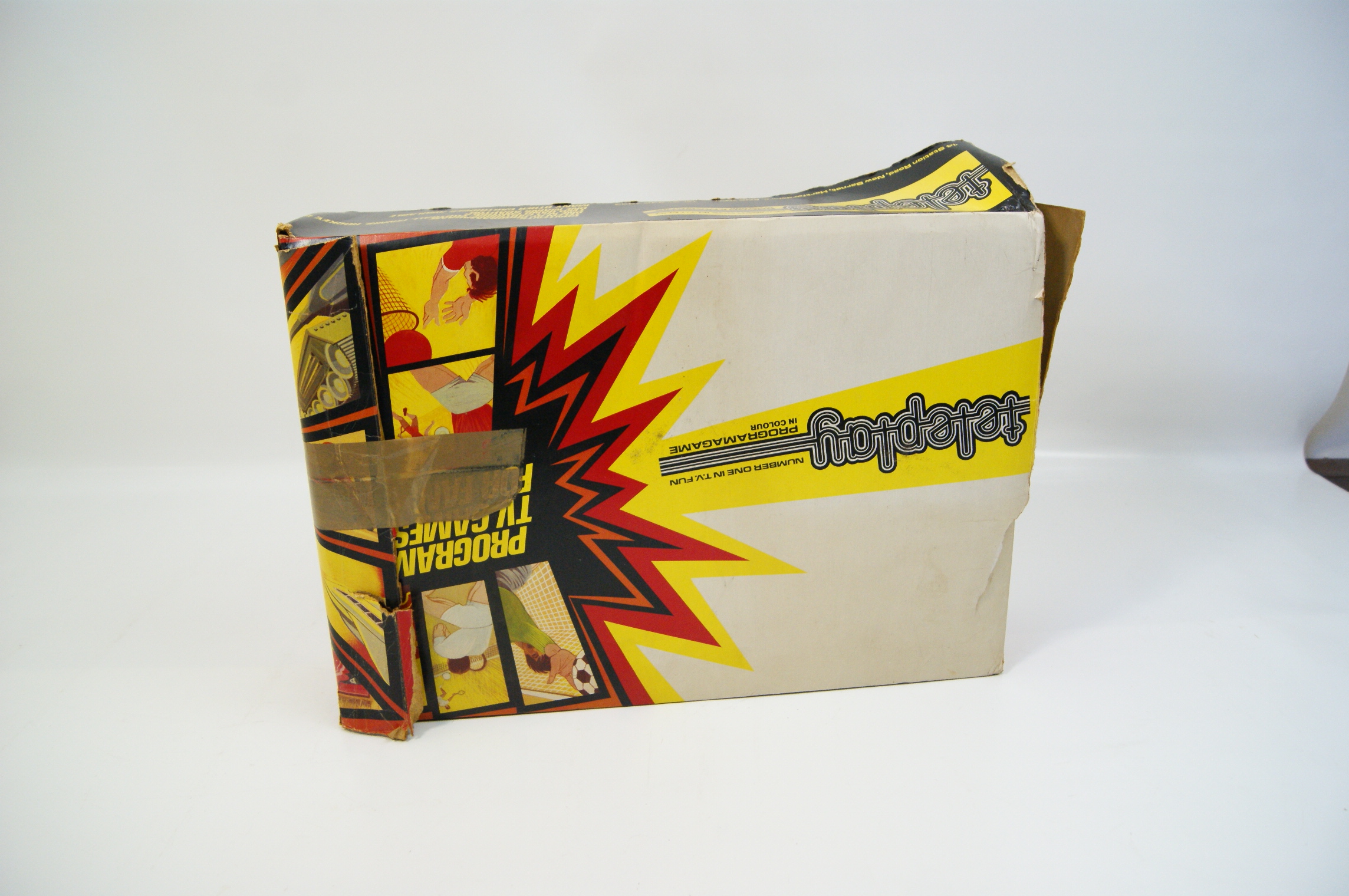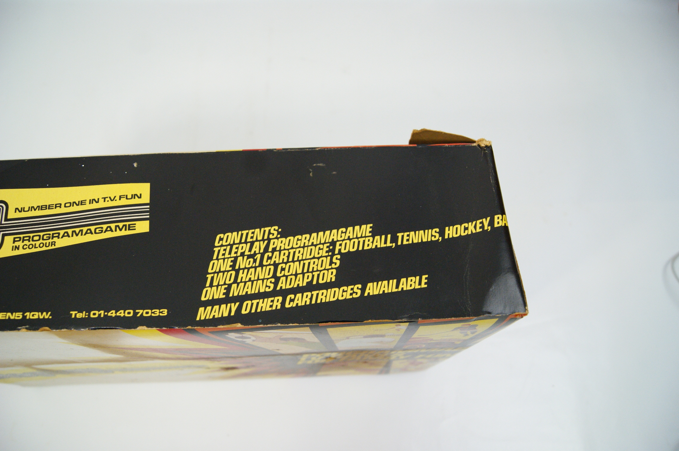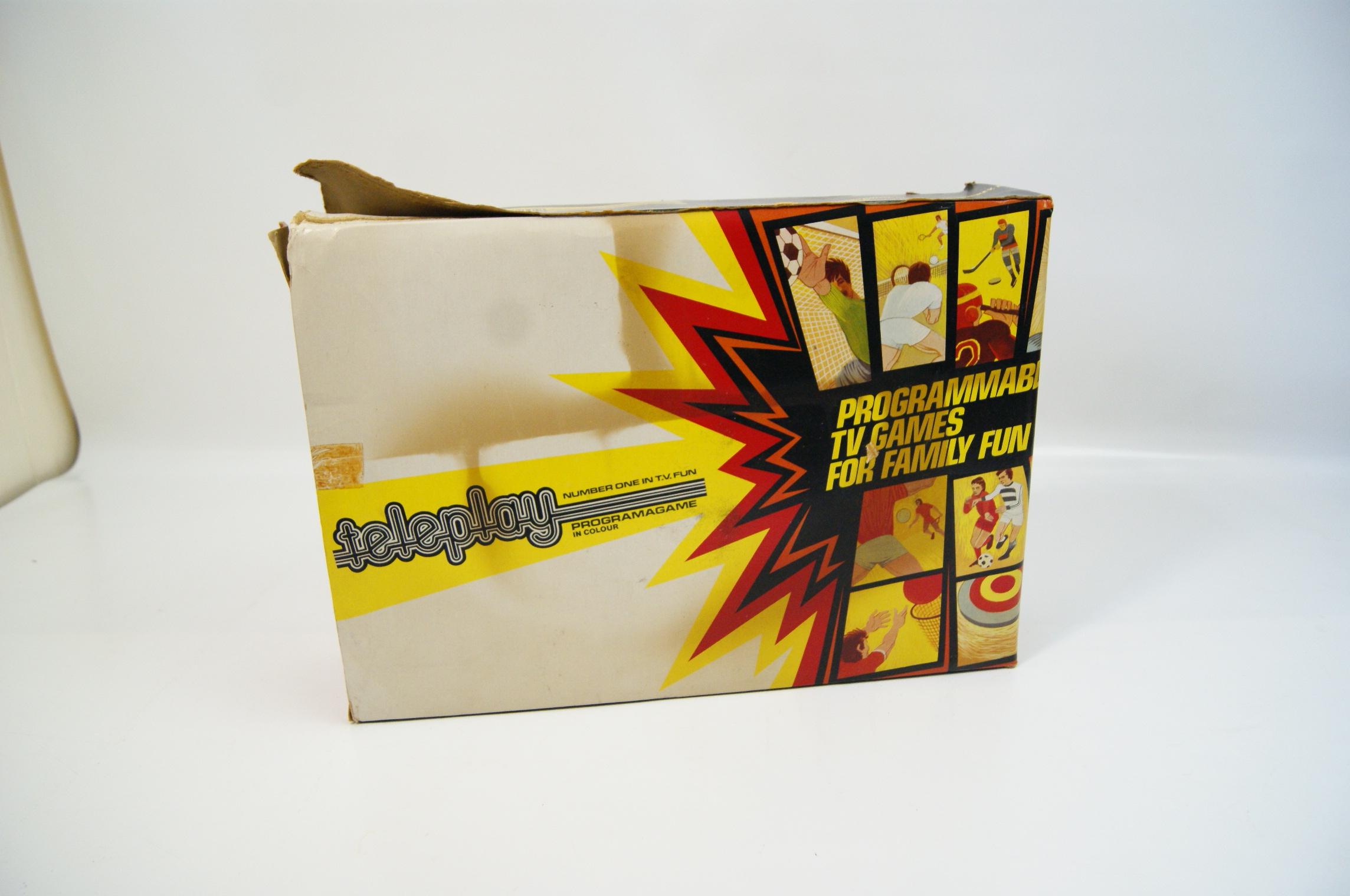 This lot comprises an original cardboard retail box for a Teleplay Programagame programmable TV games console, dating from the late 1970s. The packaging features vibrant period graphic illustrations of various sports such as football, tennis, and hockey. Printed text includes the stylized teleplay logo in a bubble font, Number One in T.V. Fun, Programagame in Colour, and Programmable TV Games for Family Fun. The top edge of the box displays the manufacturer or distributor address of 14 Station Road, New Barnet, Herts, EN5 1QW, with the telephone number 01-440 7033. The top flap lists the original contents as a Teleplay Programagame console, one No. 1 cartridge, two hand controls, and one mains adaptor. This lot consists of the empty retail packaging only; no console, cartridges, or accessories are included.