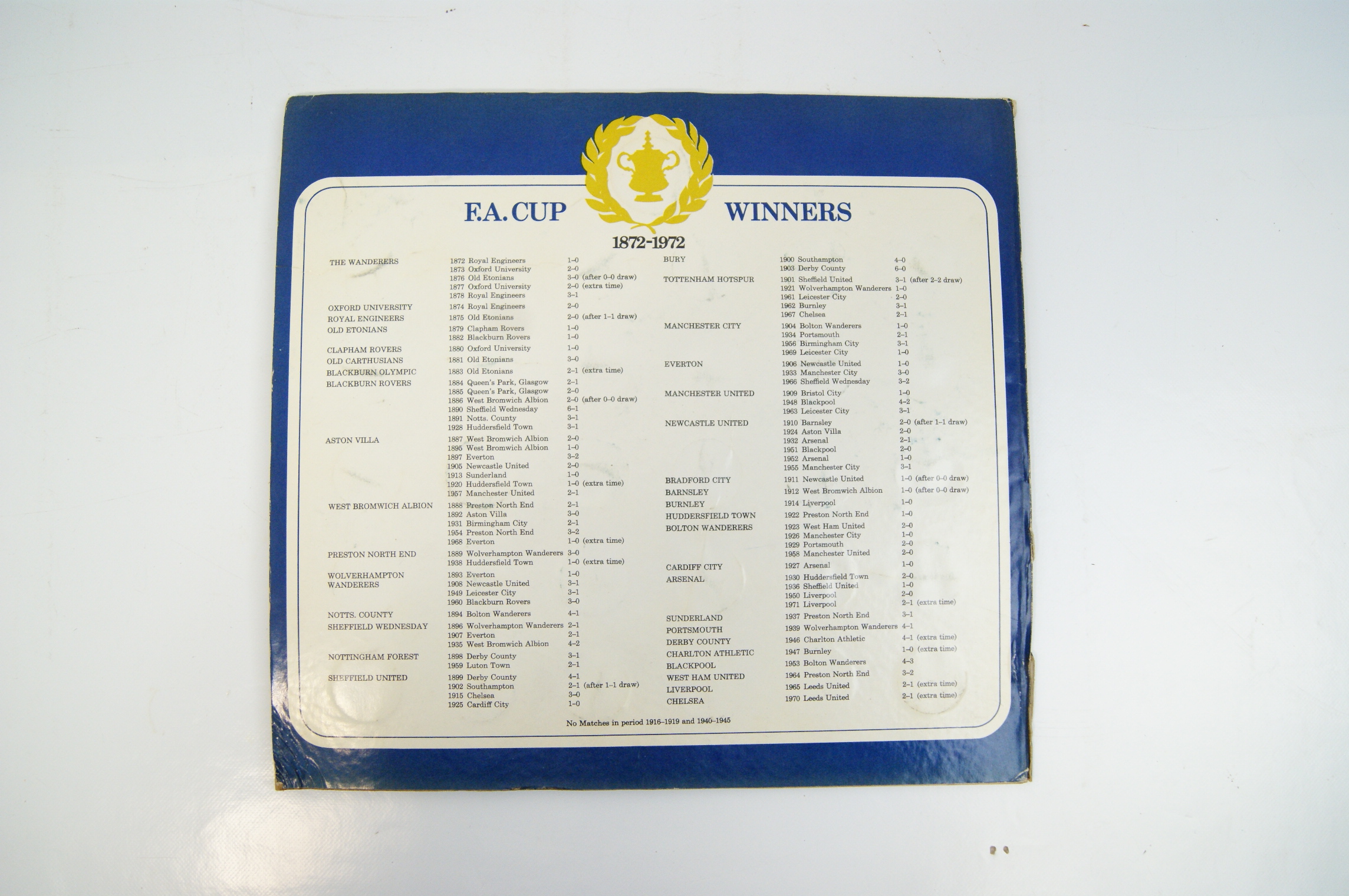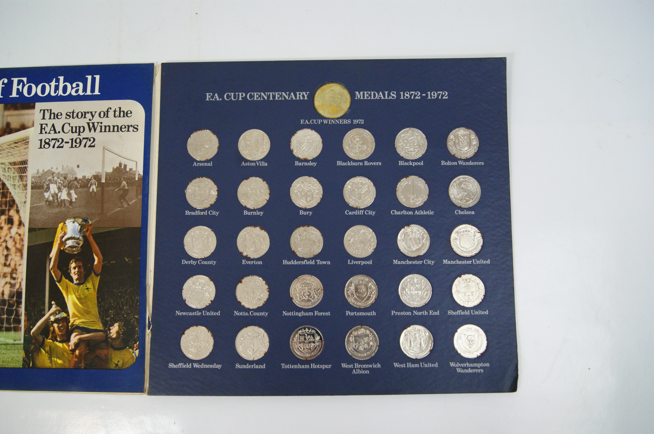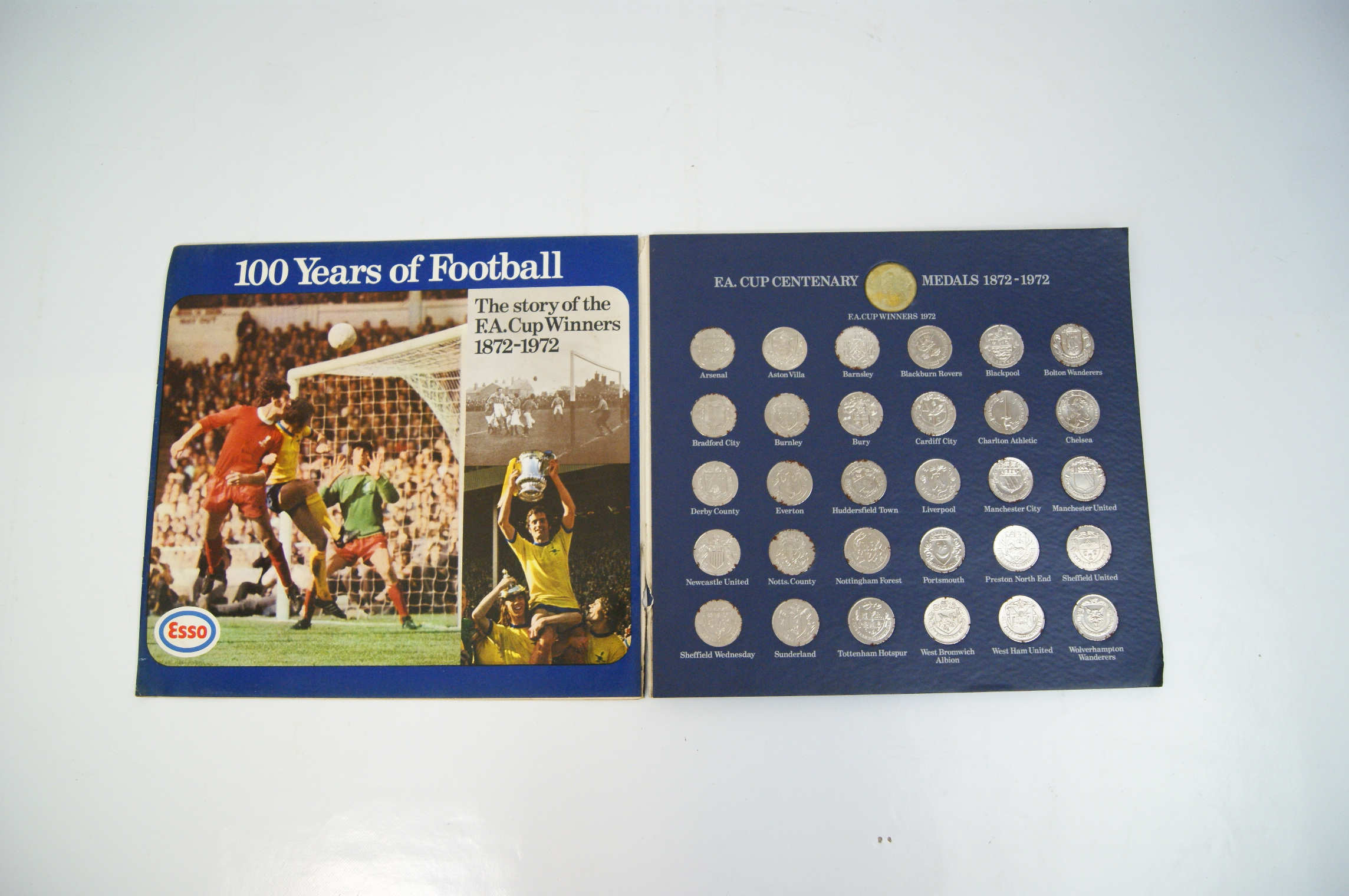 A complete commemorative medal collection produced by Esso in 1972 to celebrate the centenary of the F.A. Cup competition. The set is presented in a blue card folder and comprises 30 silver-tone medals and one central gold-tone centenary medal. Each silver-tone medal features the club crest of a different F.A. Cup winner from the first century of the tournament. The interior of the folder includes a panel titled 100 Years of Football – The story of the F.A. Cup Winners 1872-1972, featuring action photography and the Esso brand logo. The medals are housed in a dedicated mounting card with each slot labelled by club name. The reverse of the folder provides a detailed chronological list of F.A. Cup winners, finalists, and scores from 1872 to 1972. Featured clubs include Arsenal, Aston Villa, Barnsley, Blackburn Rovers, Blackpool, Bolton Wanderers, Bradford City, Burnley, Bury, Cardiff City, Charlton Athletic, Chelsea, Derby County, Everton, Huddersfield Town, Liverpool, Manchester City, Manchester United, Newcastle United, Notts. County, Nottingham Forest, Portsmouth, Preston North End, Sheffield United, Sheffield Wednesday, Sunderland, Tottenham Hotspur, West Bromwich Albion, West Ham United, and Wolverhampton Wanderers.
