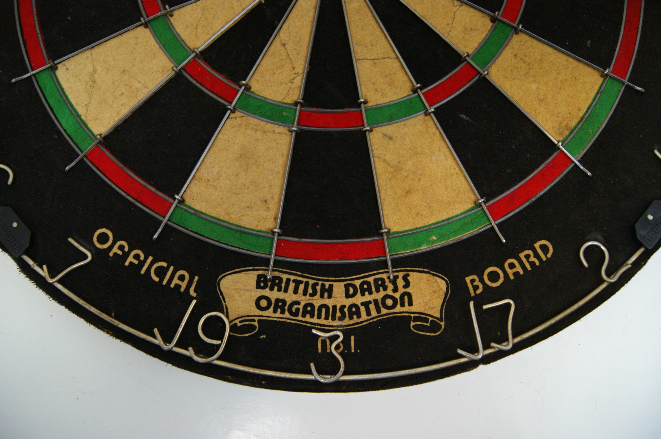 A vintage bristle dartboard manufactured by the Winmau Dartboard Co. Ltd. of Haverhill, Suffolk. This official British Darts Organisation (BDO) No. 1 board is constructed from sisal and features the Diamond Wired inset wiring system designed to reduce bounce outs. The face of the board displays the Winmau brand name in gold lettering at the top, flanked by diamond-shaped logos. The base features a scroll banner for the British Darts Organisation and is marked Official Board No. 1. The board retains its original wire-formed number ring. Accompanying the board is the original pictorial cardboard box which includes the manufacturer address and historical marketing text regarding its use in major BDO international championships.