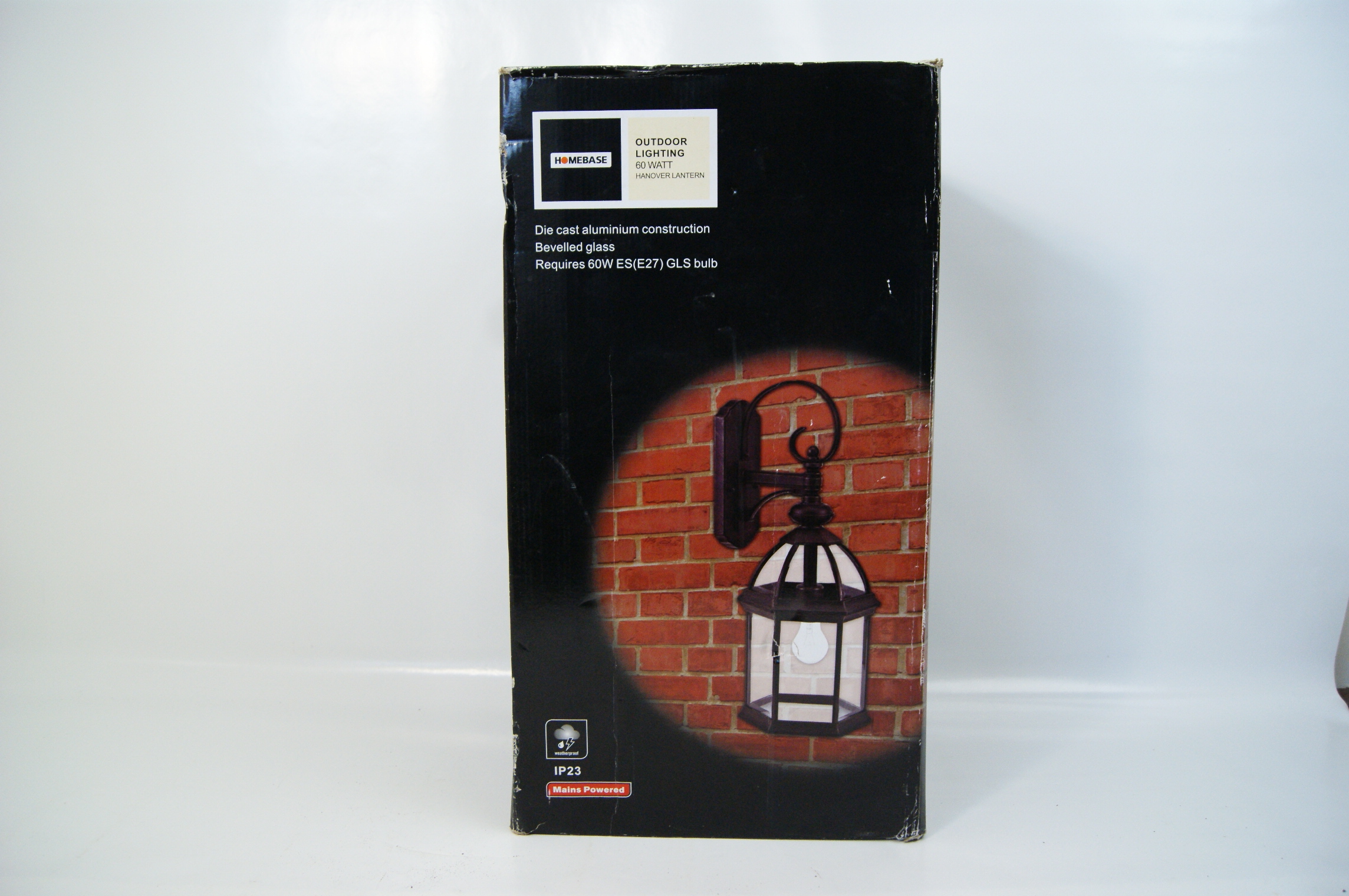 A Homebase Hanover outdoor wall lantern featuring a die-cast aluminium construction with a black finish. The fixture is designed with a hexagonal body and clear bevelled glass panels, supported by a scrolled decorative wall arm. This lantern is mains powered, has an IP23 weatherproof rating, and is designed to accommodate a 60W ES (E27) GLS bulb. The item is branded by the British retailer Homebase and is visually identical to the Wentworth collection marketed by other manufacturers.