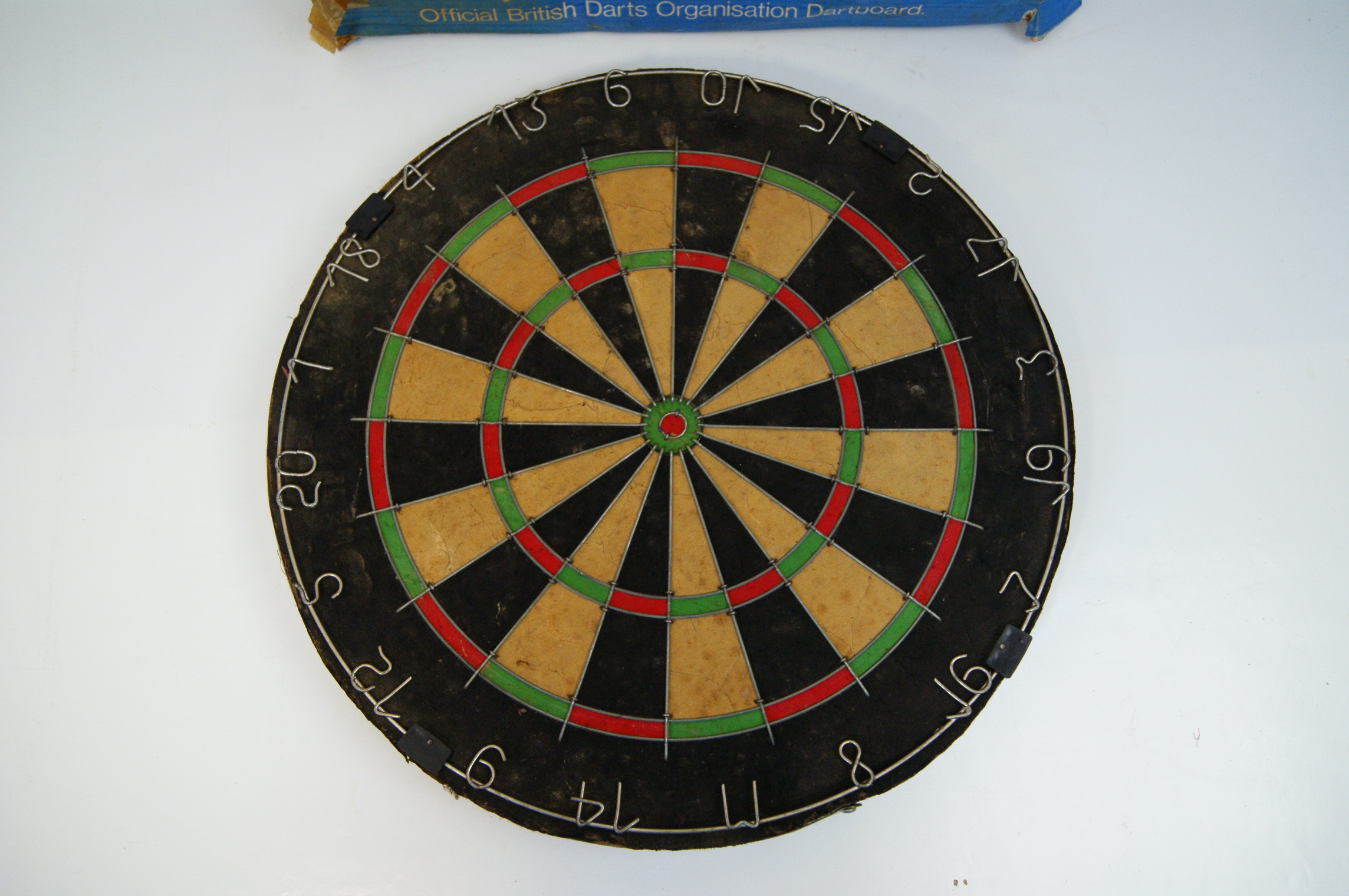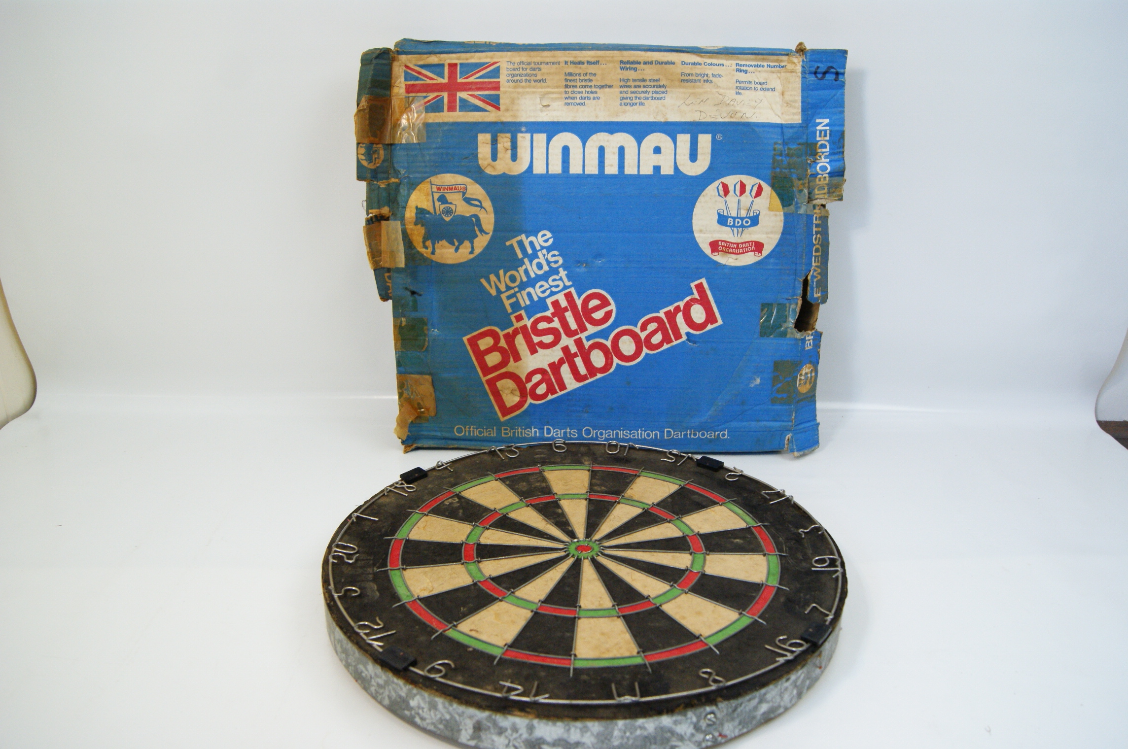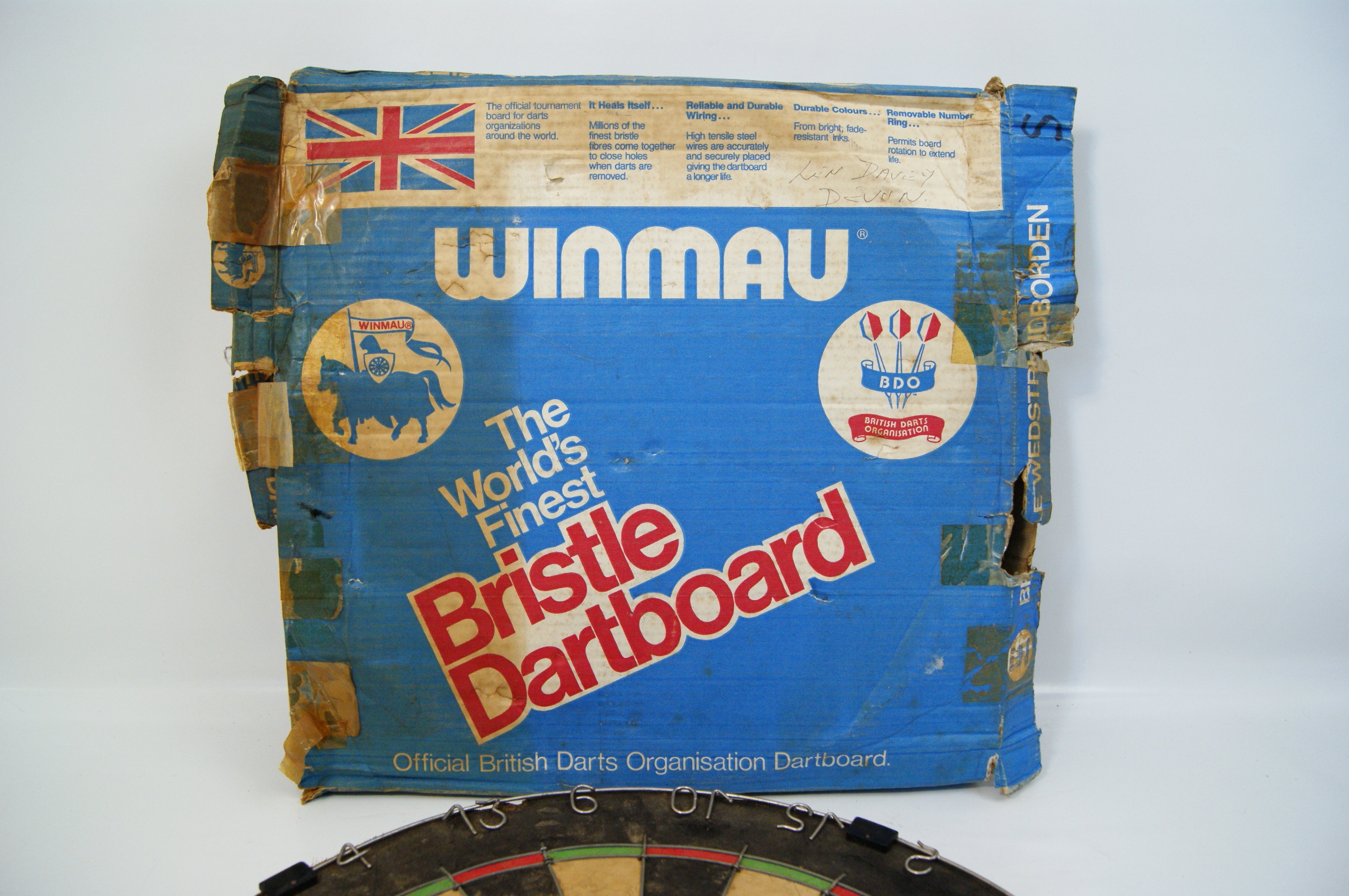 A vintage bristle dartboard manufactured by Winmau, produced as an official British Darts Organisation (BDO) endorsed product. The board is constructed with sisal segments in a standard tournament configuration of black, beige, red, and green. It includes a metal wire spider and a removable outer number ring with wire numerals. The lot is accompanied by its original cardboard retail box featuring blue and white graphics, the Winmau and BDO logos, and a Union Jack flag. The box includes the printed text The World’s Finest Bristle Dartboard and Official British Darts Organisation Dartboard. A handwritten ink inscription in the top right corner of the box reads LIN DAVEY DEVON. The right side flap contains partial vertical text including the Dutch word WEDSTRIJDBORDEN.