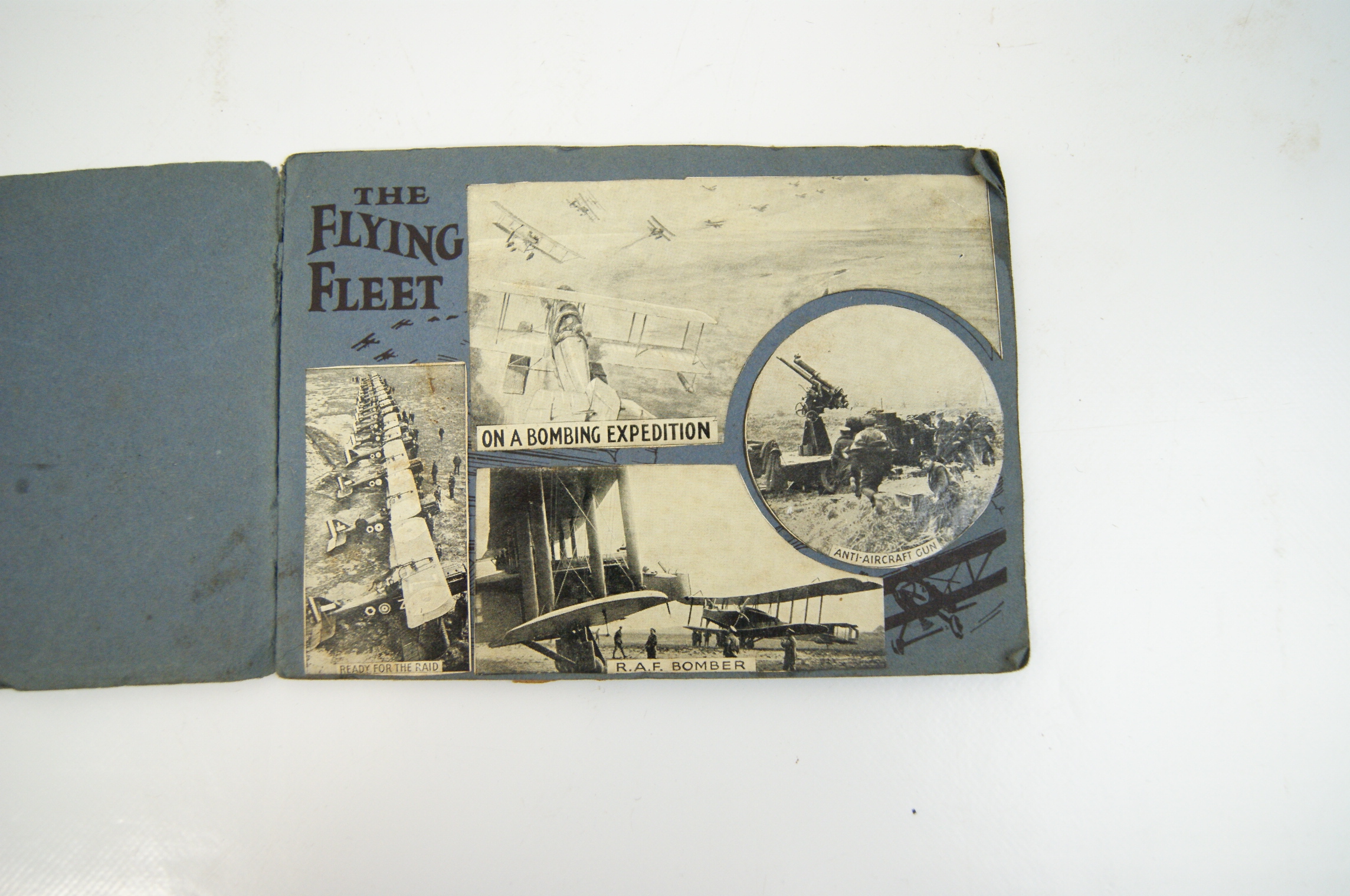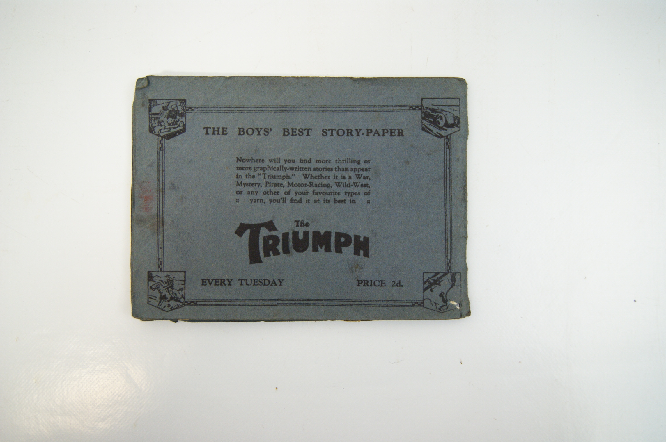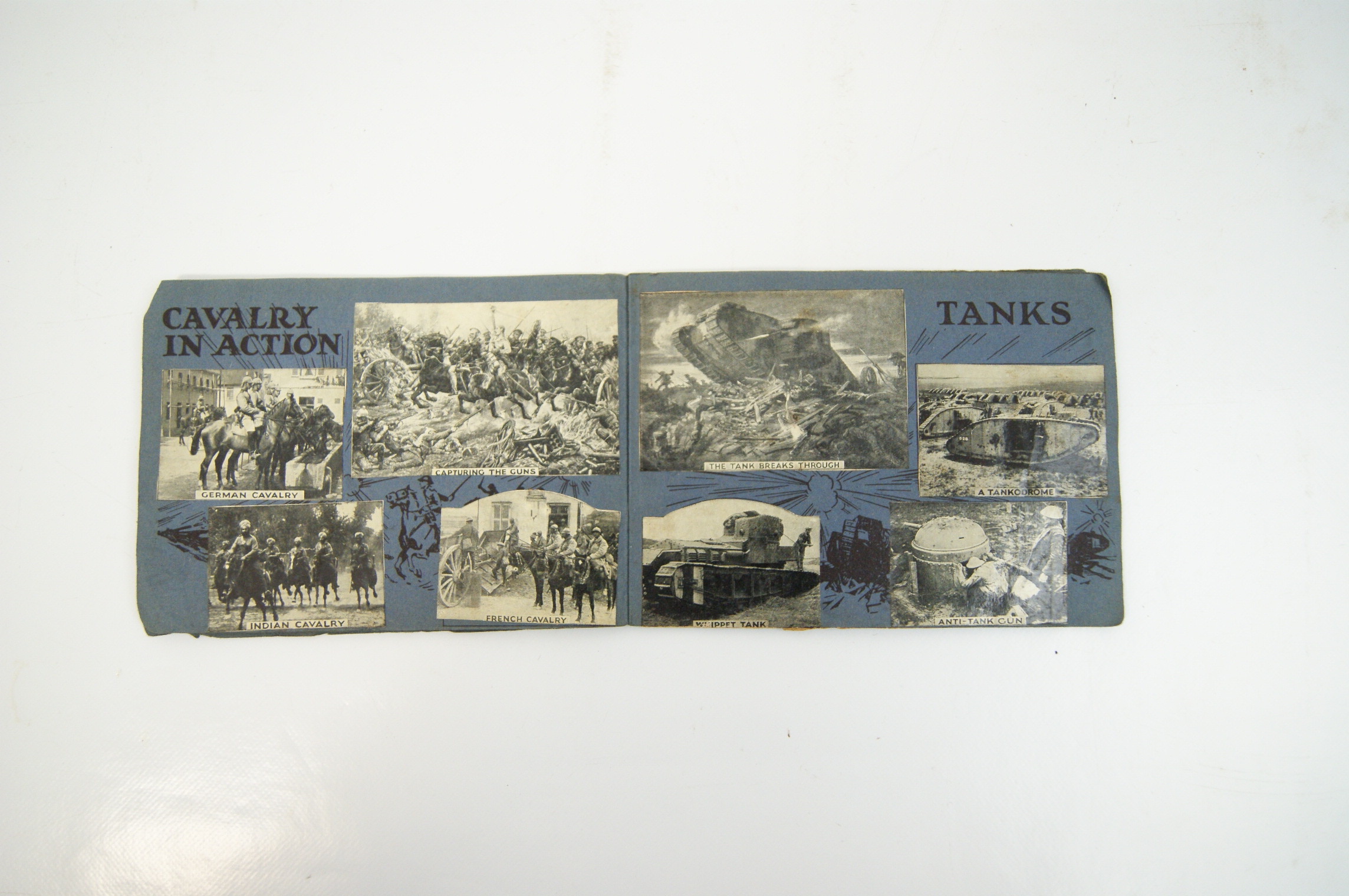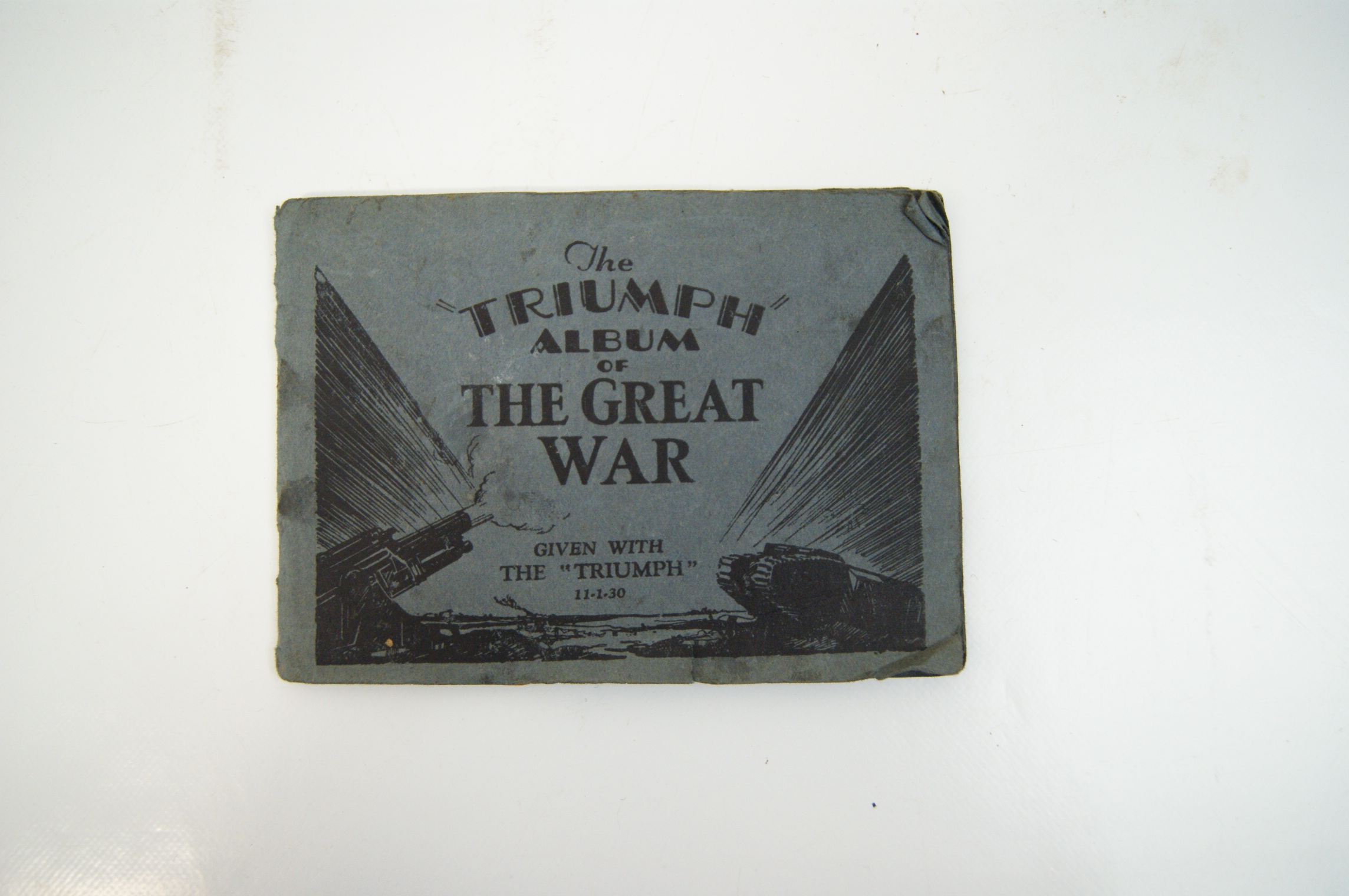 A landscape-format souvenir album titled The ‘Triumph’ Album of the Great War, issued as a giveaway supplement for the British boys’ story-paper The Triumph on 11th January 1930. The publication consists of blue-grey paper leaves with monochrome photographic prints pasted into specific thematic sections. Internal page headings include The Flying Fleet, Cavalry in Action, and Tanks, with individual photographic plates depicting subjects such as an R.A.F. Bomber, German Cavalry, and a Whippet Tank. The front cover features bold black typography flanked by illustrations of an artillery gun and a tank. The rear cover serves as an advertisement for the parent publication, described as The Boys’ Best Story-Paper, listing a price of 2d and featuring adventure-themed vignettes in the corners.