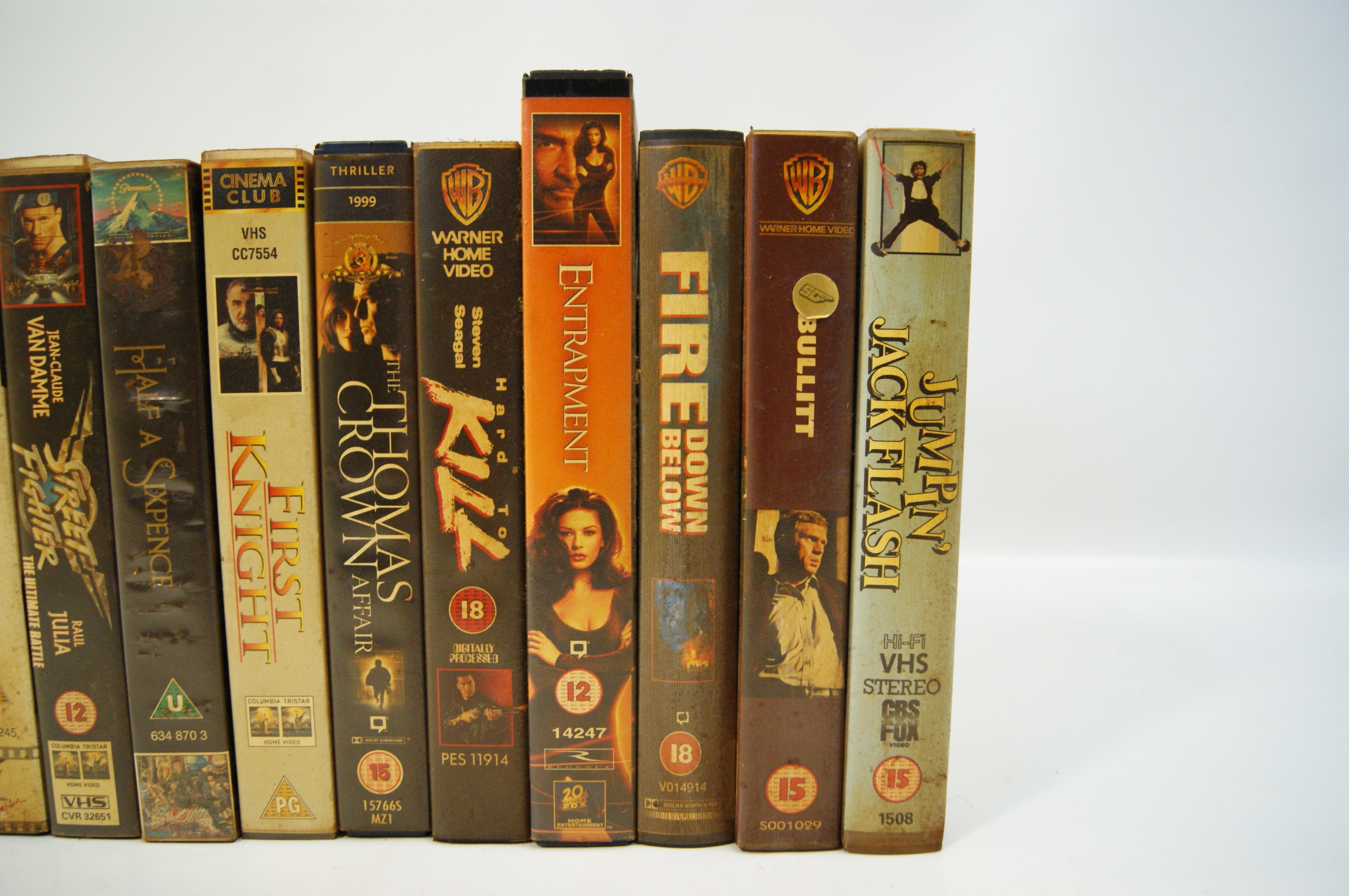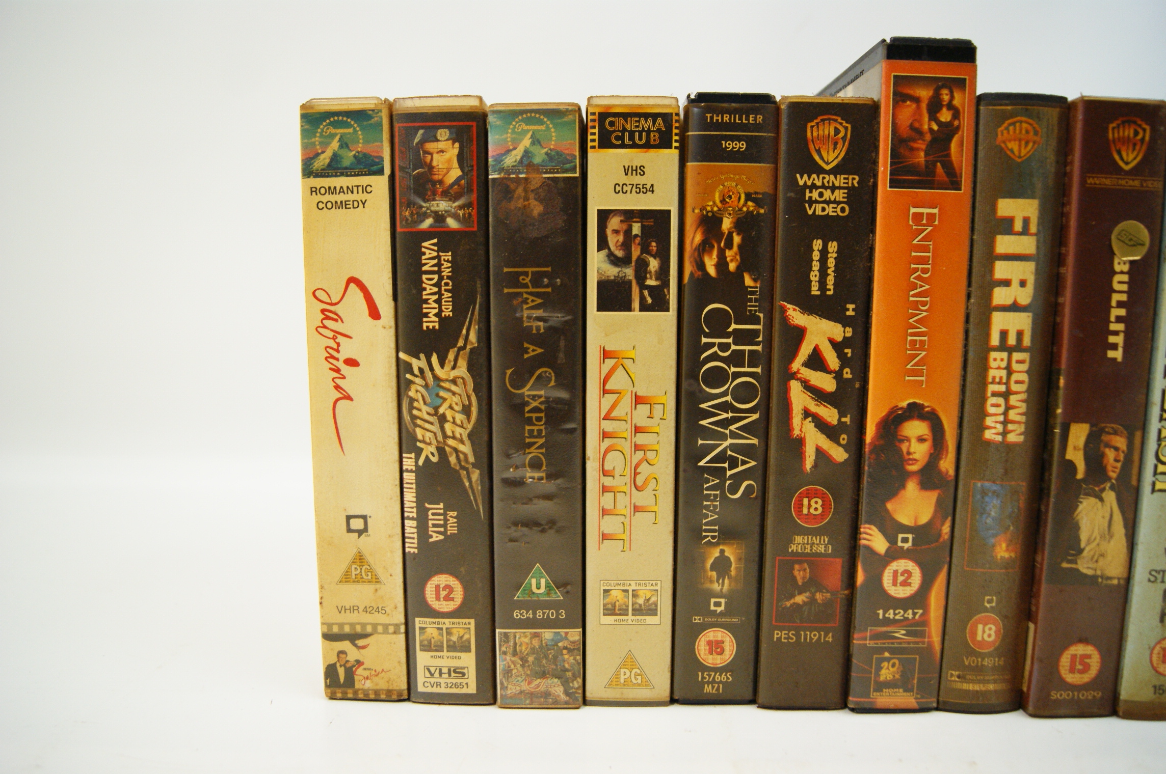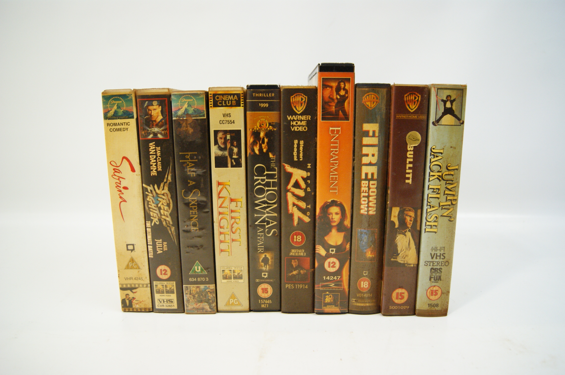 This lot comprises ten retail VHS tapes, all UK PAL releases bearing British Board of Film Classification (BBFC) rating symbols. The collection includes a variety of genres from the 1960s through the 1990s. Featured titles are: Sabrina (1995) starring Harrison Ford, Paramount Home Video, catalogue number VHR 4245; Street Fighter: The Ultimate Battle (1994) starring Jean-Claude Van Damme, Columbia TriStar Home Video, catalogue number CVR 32651; Half a Sixpence (1967) starring Tommy Steele, Paramount Home Video, catalogue number 634 870 3; First Knight (1995) starring Sean Connery and Richard Gere, Cinema Club / Columbia TriStar, catalogue number CC7554; The Thomas Crown Affair (1999) starring Pierce Brosnan, MGM Home Entertainment, catalogue number 15766S MZ1; Hard to Kill (1990) starring Steven Seagal, Warner Home Video, catalogue number PES 11914; Entrapment (1999) starring Sean Connery and Catherine Zeta-Jones, 20th Century Fox Home Entertainment, catalogue number 14247; Fire Down Below (1997) starring Steven Seagal, Warner Home Video, catalogue number V014914; Bullitt (1968) starring Steve McQueen, Warner Home Video, catalogue number S001029; and Jumpin Jack Flash (1986) starring Whoopi Goldberg, CBS/Fox Video, catalogue number 1508. The tapes are housed in a mix of clear or white plastic clamshell cases and standard black plastic cases. The Bullitt spine features a gold-tone Warner Home Video seal.