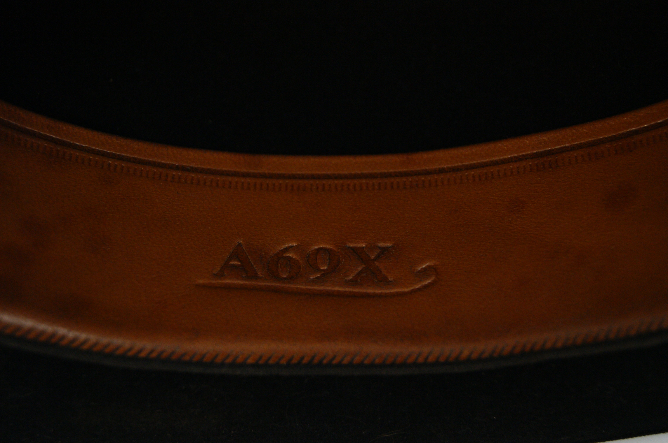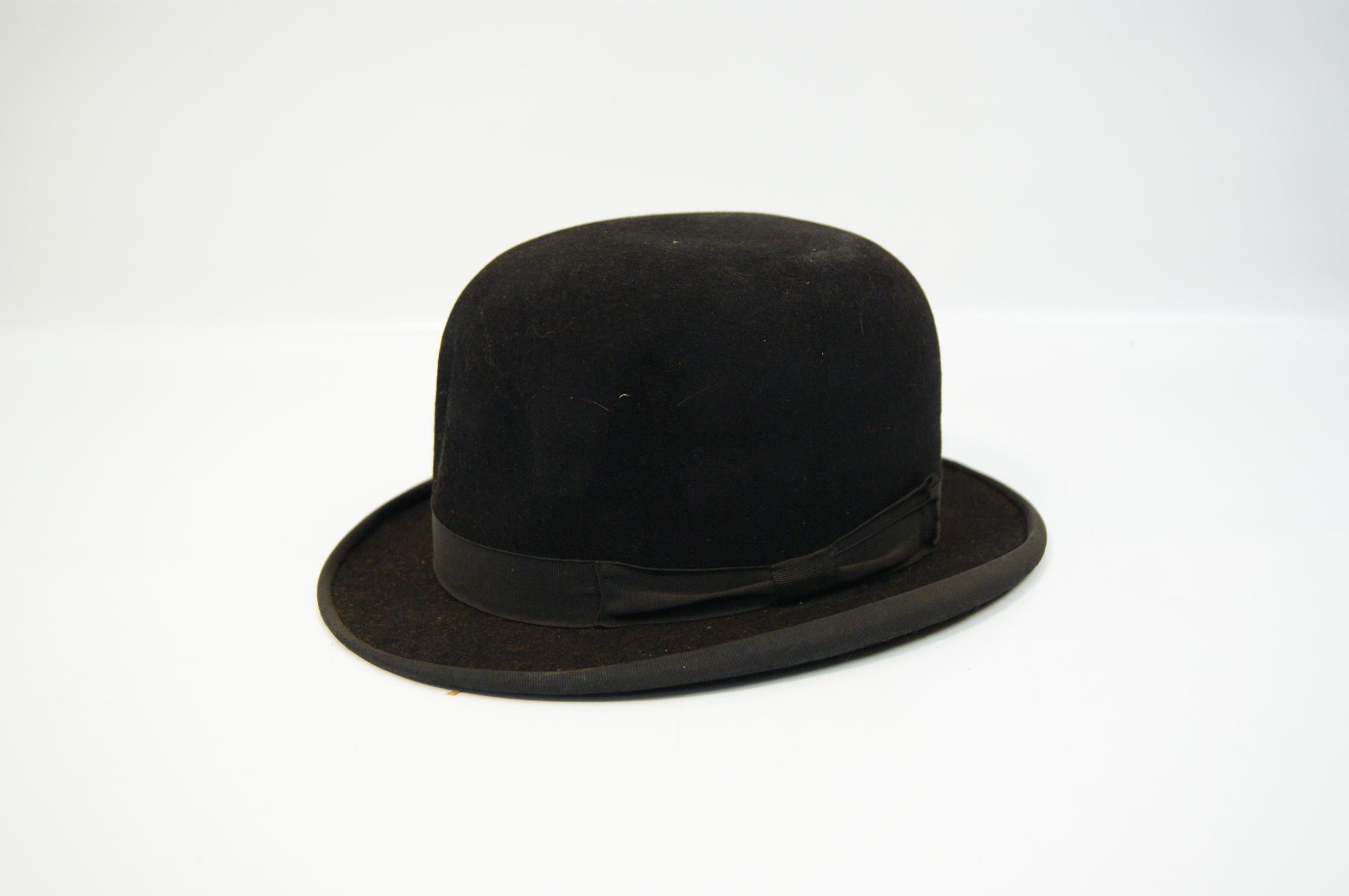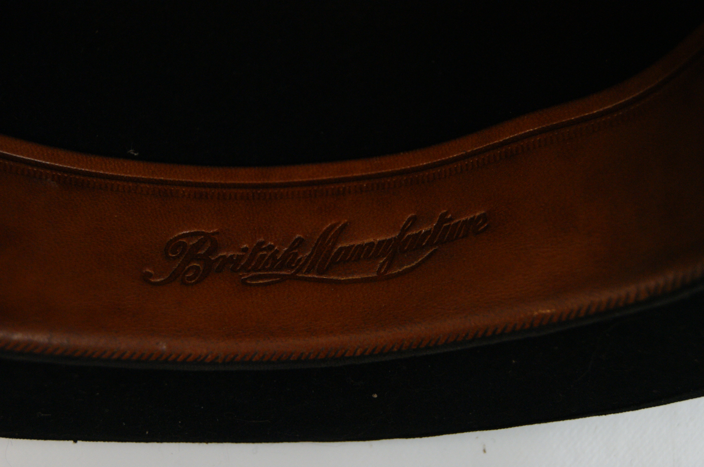 A black felt bowler hat of British manufacture circa early 20th century. The interior crown features an adhered perforated manufacturer’s label, printed in dark ink on a cream-coloured ground. The label displays a central heraldic design with a crest and crown. Interior leather sweatband is embossed with British Manufacture in cursive script and the alphanumeric mark A69X, which is underlined with a flourish. The hat is finished with a matching grosgrain ribbon and a bound brim.