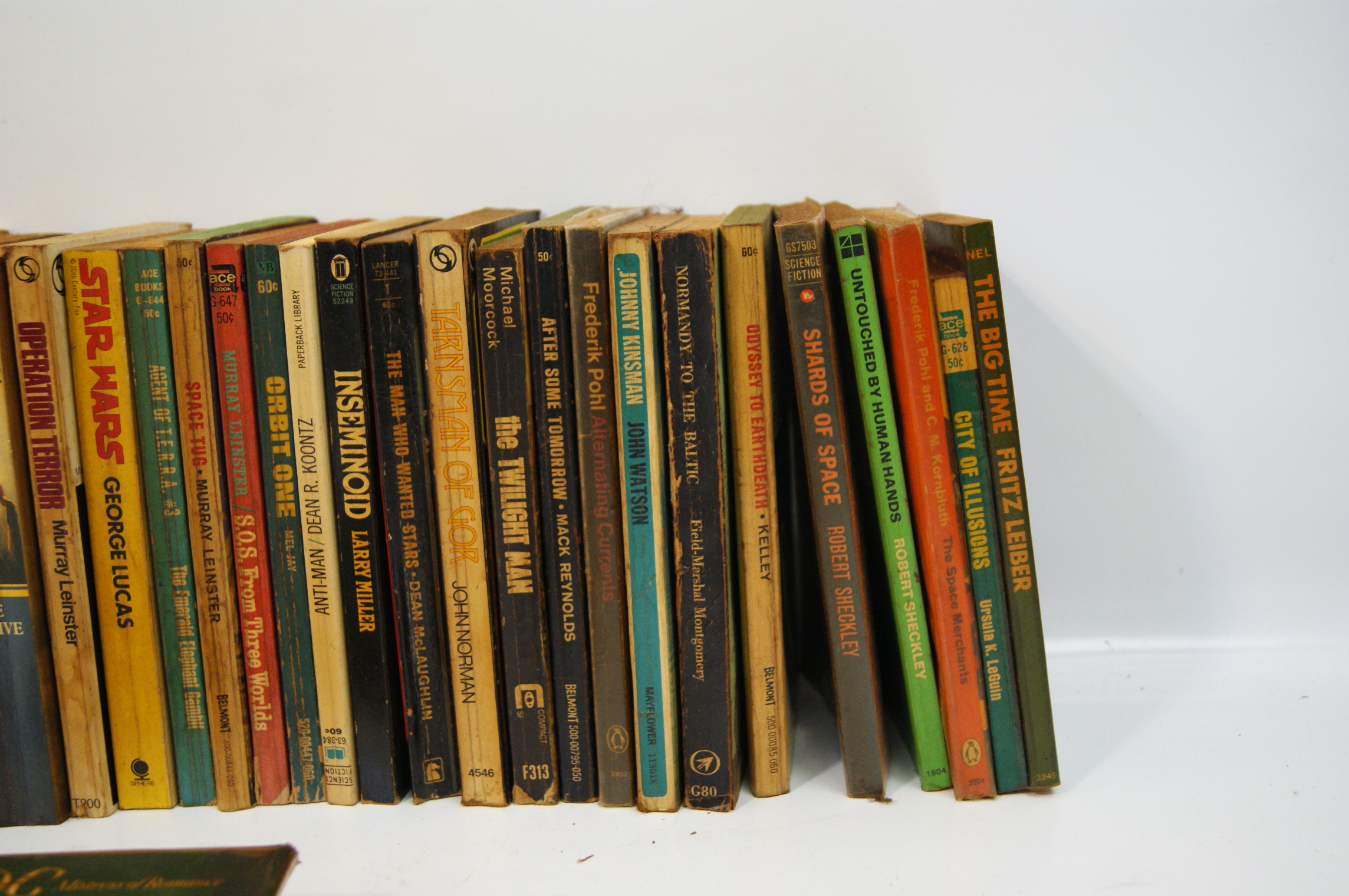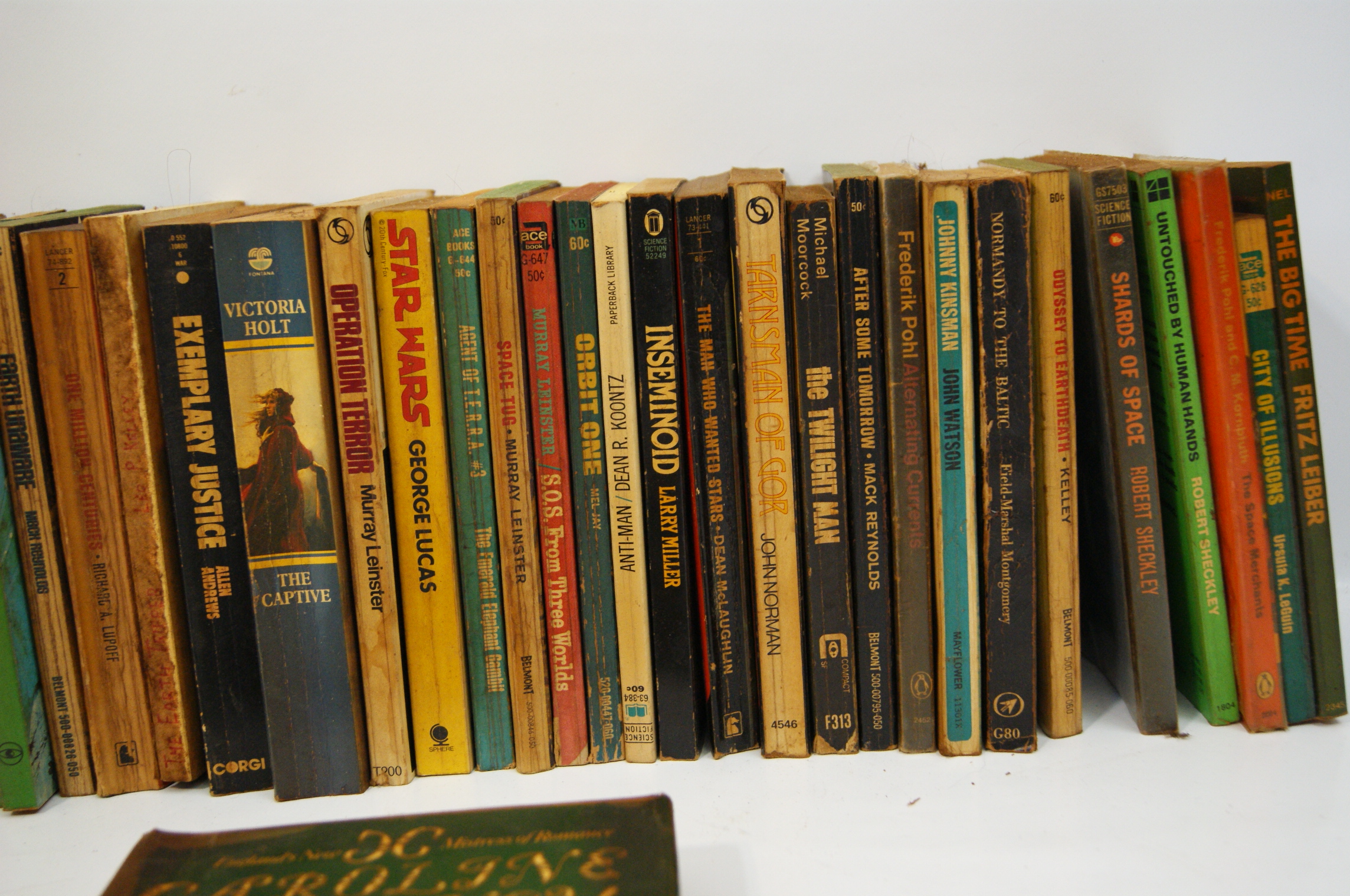 A collection of mass-market paperbacks primarily focused on science fiction, fantasy, and historical non-fiction. The lead title is The Fortunes of Love by Caroline Courtney, published as a softcover with the cover subtitle England’s New Mistress of Romance. The collection includes a variety of science fiction works such as Star Wars by George Lucas (Sphere), City of Illusions by Ursula K. Le Guin (Ace), The Big Time by Fritz Leiber (New English Library), and Tarnsman of Gor by John Norman. Other authors represented include Robert Sheckley, Murray Leinster, Eric Frank Russell, Richard Saxon, David McDaniel, and Larry Miller. Non-fiction and historical titles include El Alamein to the River Sangro and Normandy to the Baltic by Field-Marshal Montgomery (Fontana), and The One That Got Away by Kendal Burt and James Leasor. Publishers represented in the lot include Ace, Pan, Fontana, Corgi, Penguin, Lancer, Belmont, and Mayflower. The books are octavo-sized paperbacks in original pictorial wrappers.